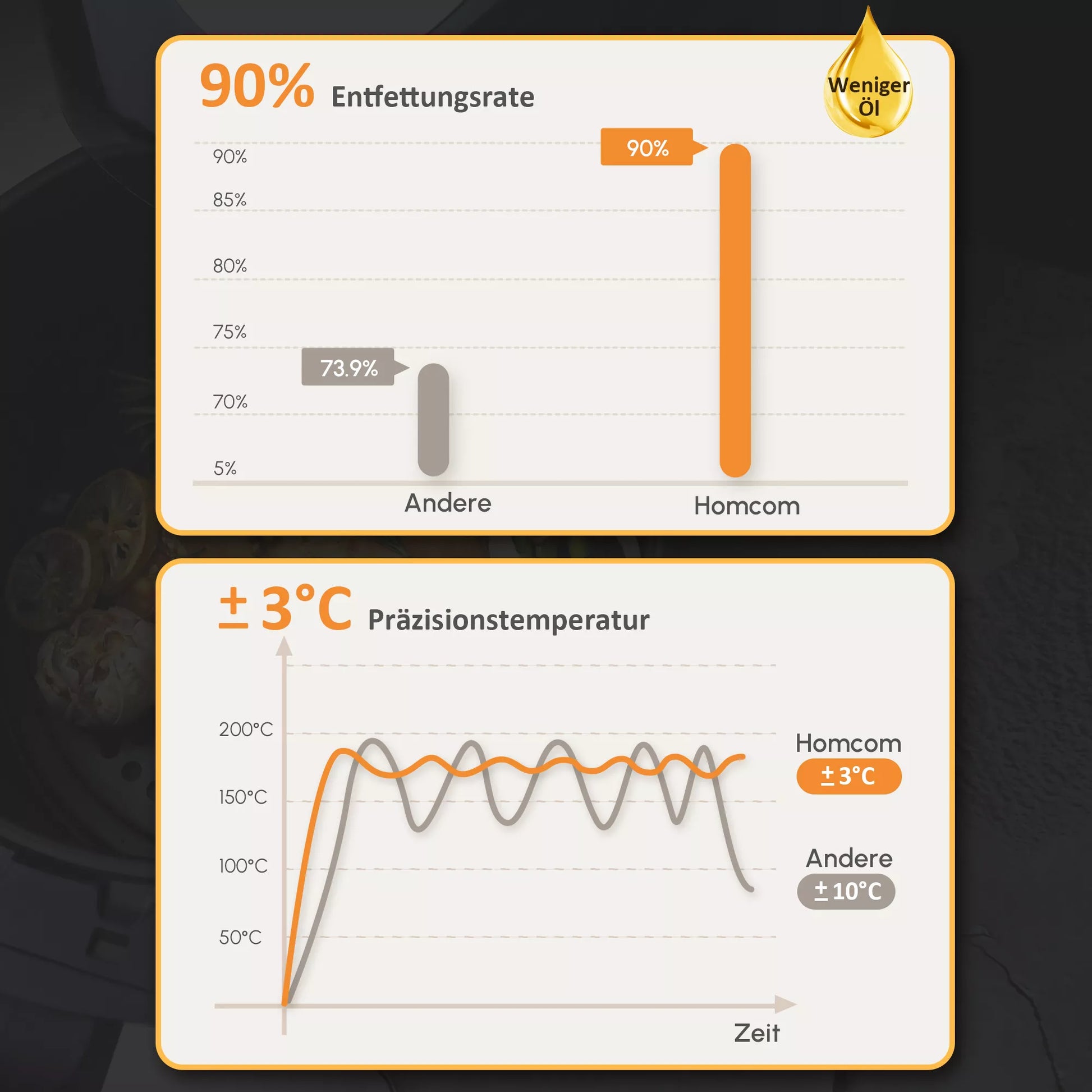 - ✔ 90 % mažiau aliejaus – sveikesniems patiekalams, greita oro cirkuliacija – traškiai išorei ir sultingam vidui