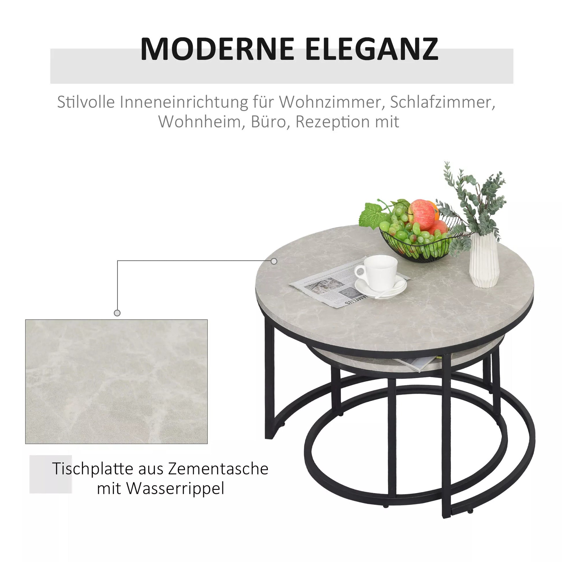 Kavos staliukų komplektas, 2 apvalūs sudedami staliukai, pramoninio dizaino, metalo rėmas, betono išvaizda/juoda