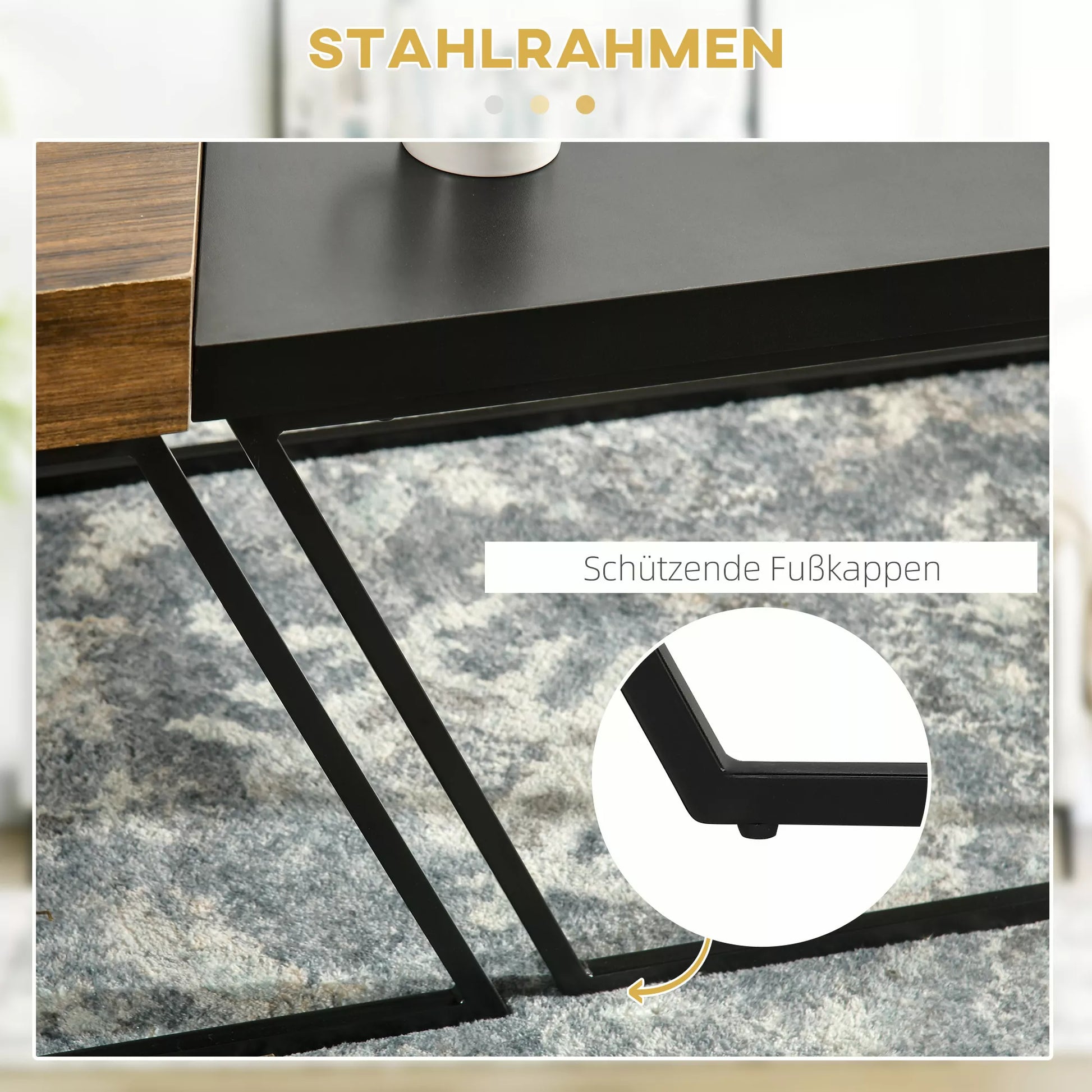 - ✔ Tvirtas ir stabilus plieninis svetainės staliuko rėmas su apsauginiais grindų dangteliais