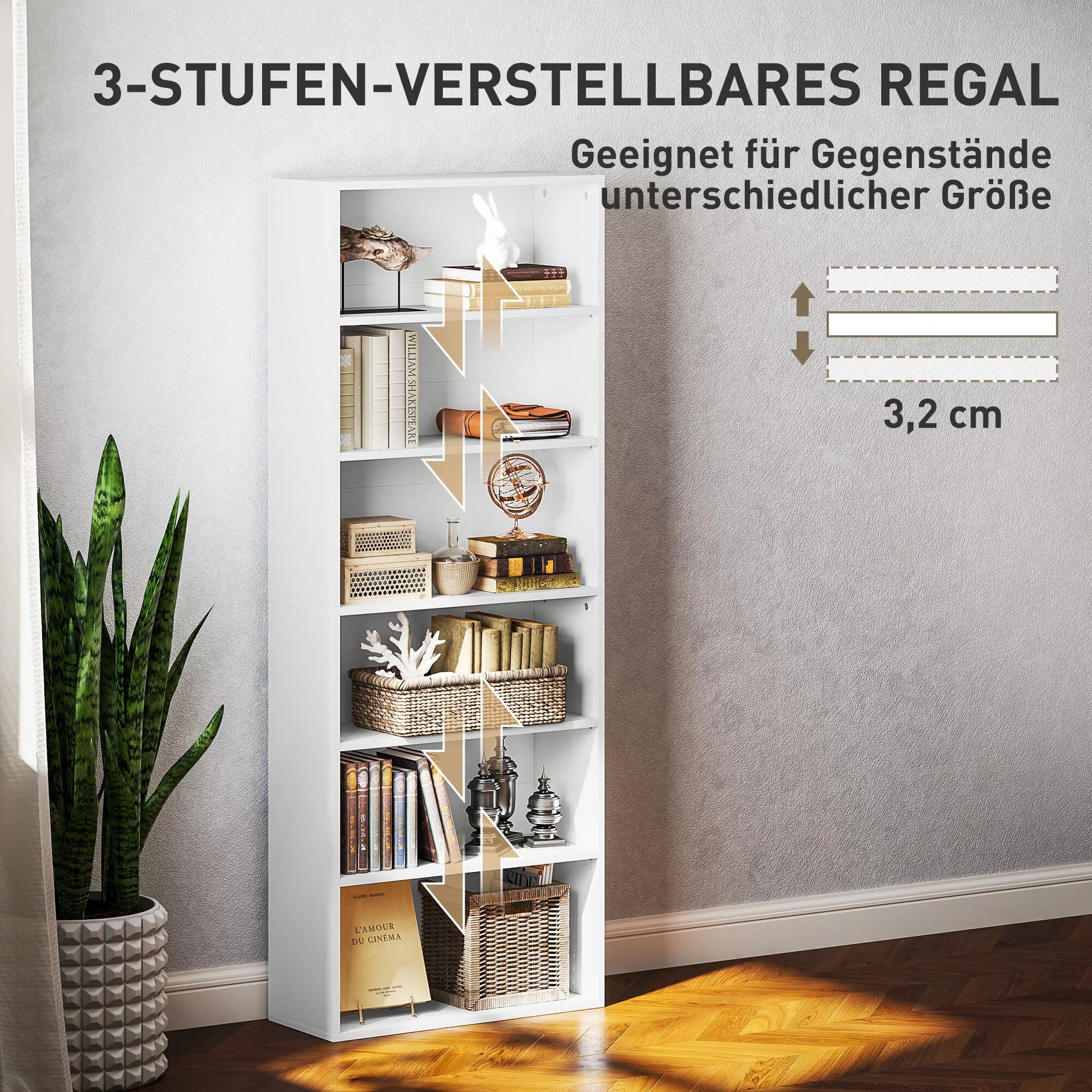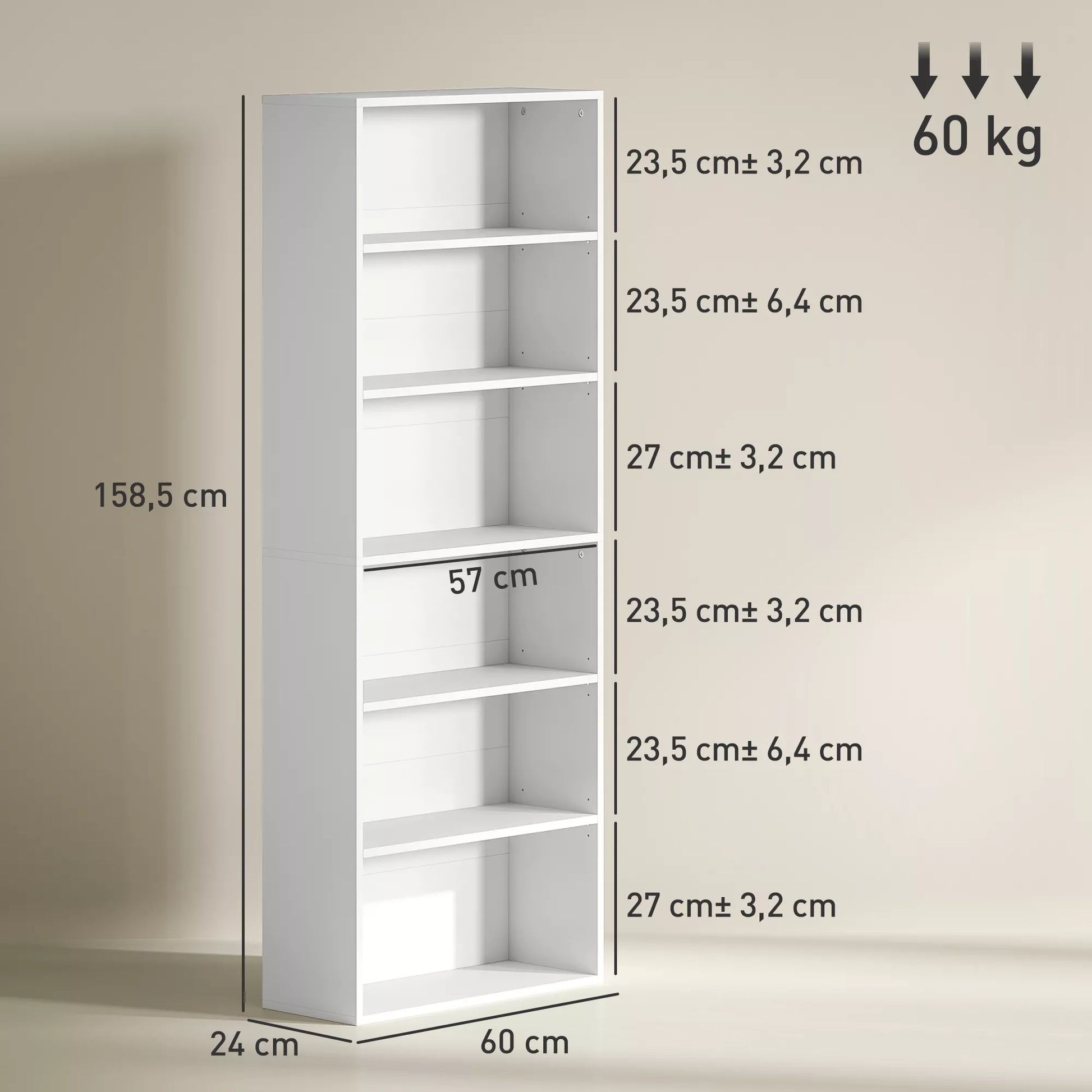 Lentyna knygoms, 6 skyriai, reguliuojamos lentynos, medžio drožlių plokštė, 60 x 24 x 158,5 cm, Balta