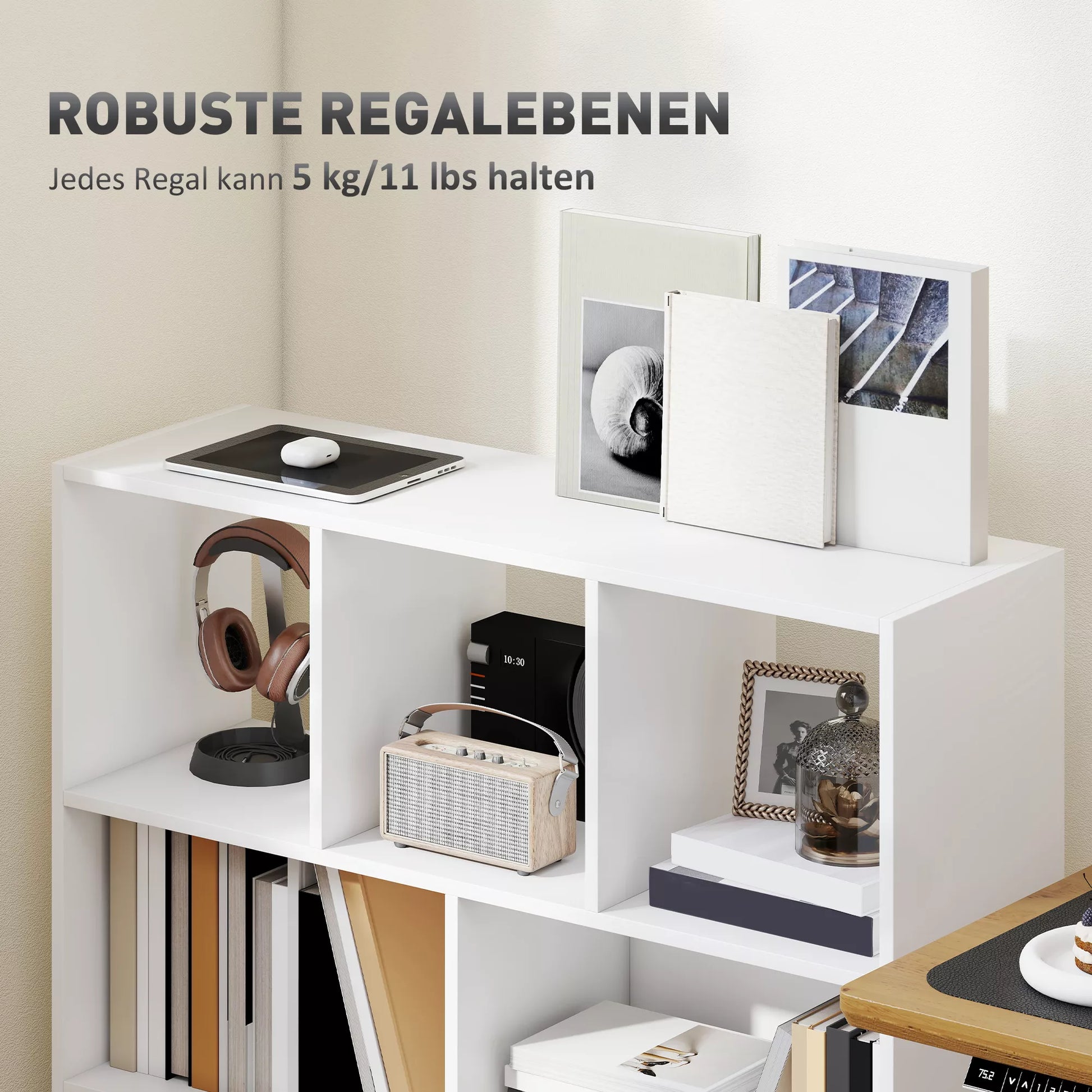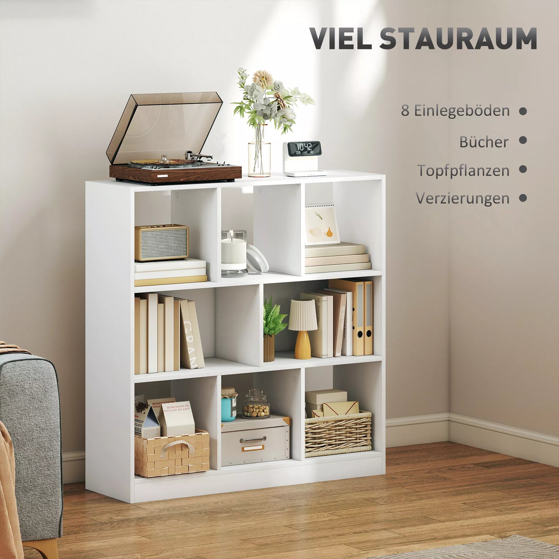 Atraskite tvarkos džiaugsmą su šiuo moderniu lentynų stovu! Trys didelės lentynos ir aštuoni atskirti skyriai suteikia daug vietos knygoms, dekoracijoms ir augalams. Galinė lentynos sienelė užtikrina, kad viskas liktų saugiai savo vietoje. Paprastas ir modernus šios knygų lentynos dizainas puikiai dera prie įvairių interjero stilių. Tai ideali sprendimas, norint sukurti papildomos vietos knygoms ir dekoracijoms.