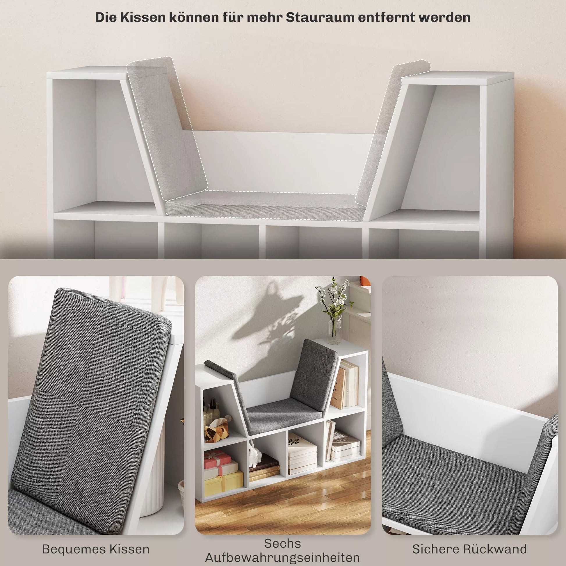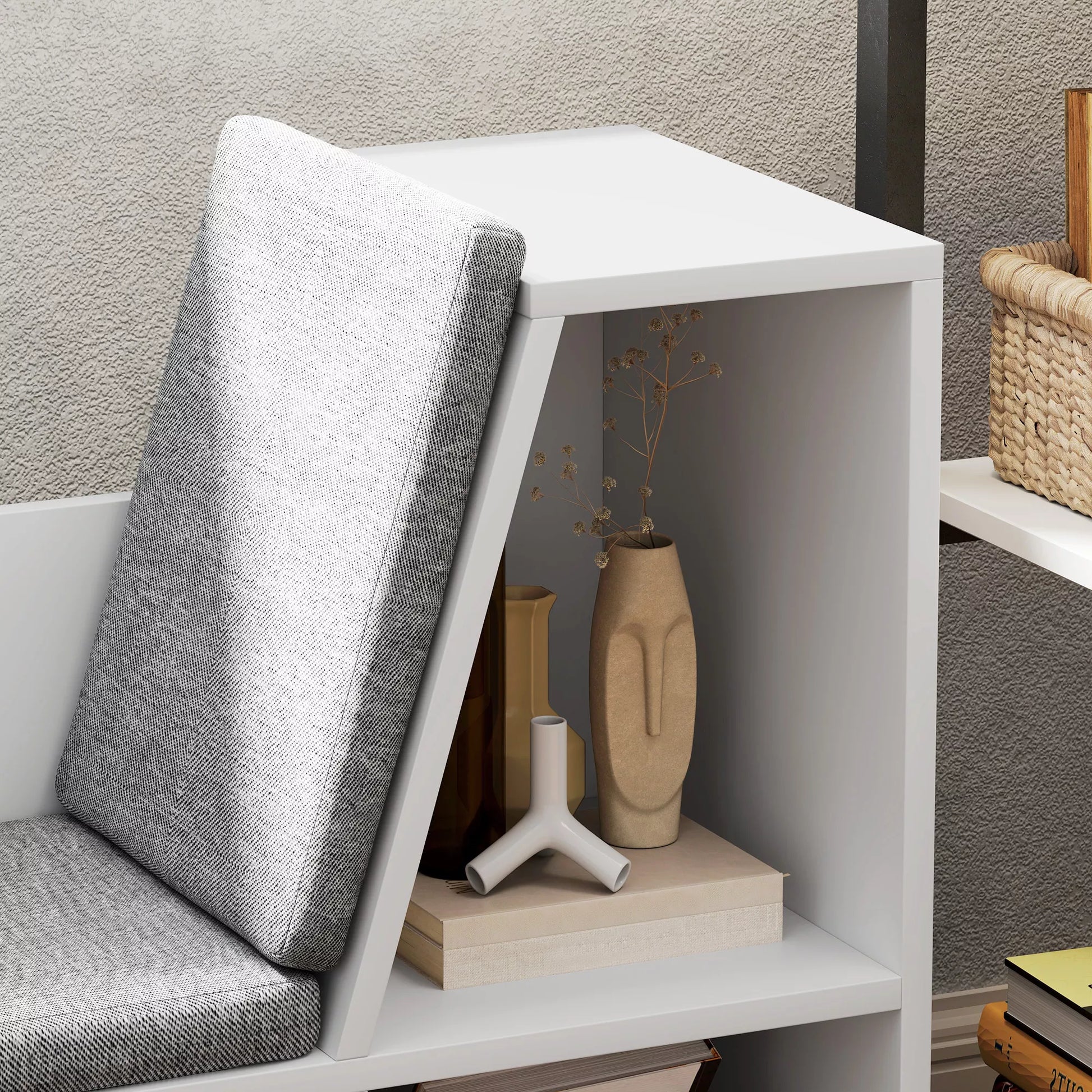 Knygų lentyna su sėdimoji vieta, 6 skyriai, paminkštinta, 105 x 30 x 63 cm, balta