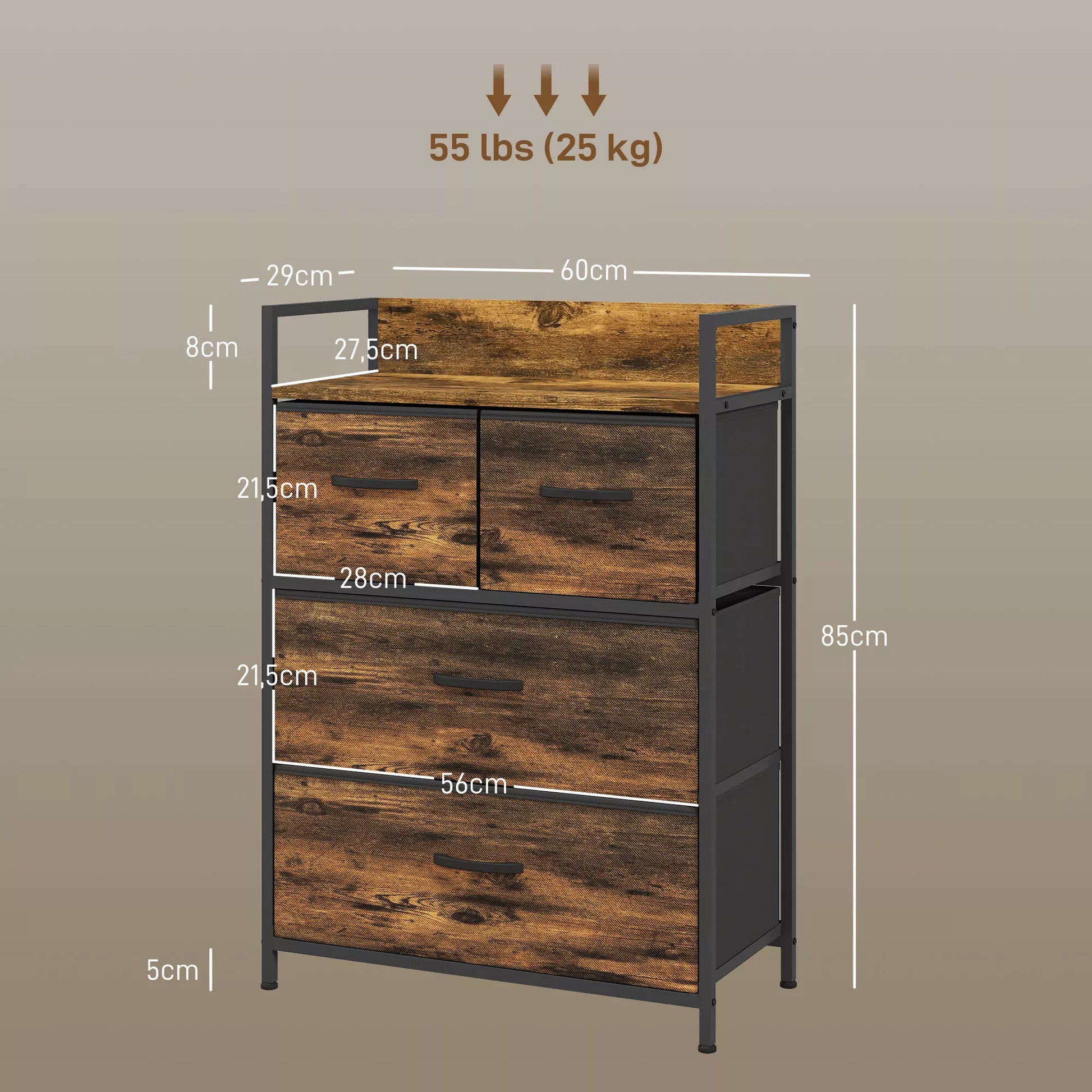 Komoda, spintelė, 4 audininiai stalčiai, industrialinis dizainas, 60x29x85cm, ruda/juoda