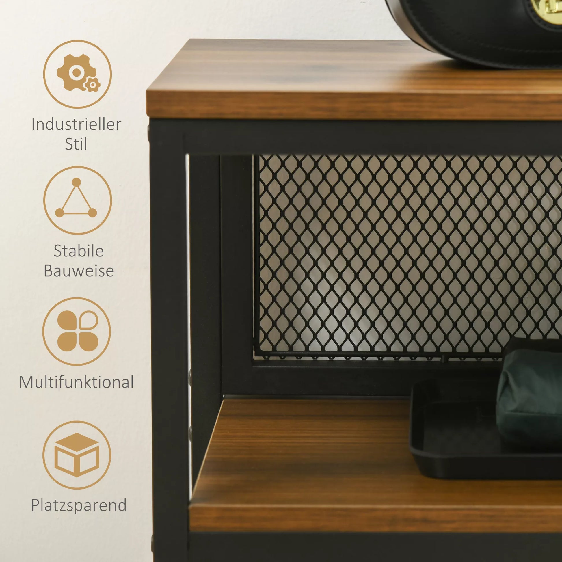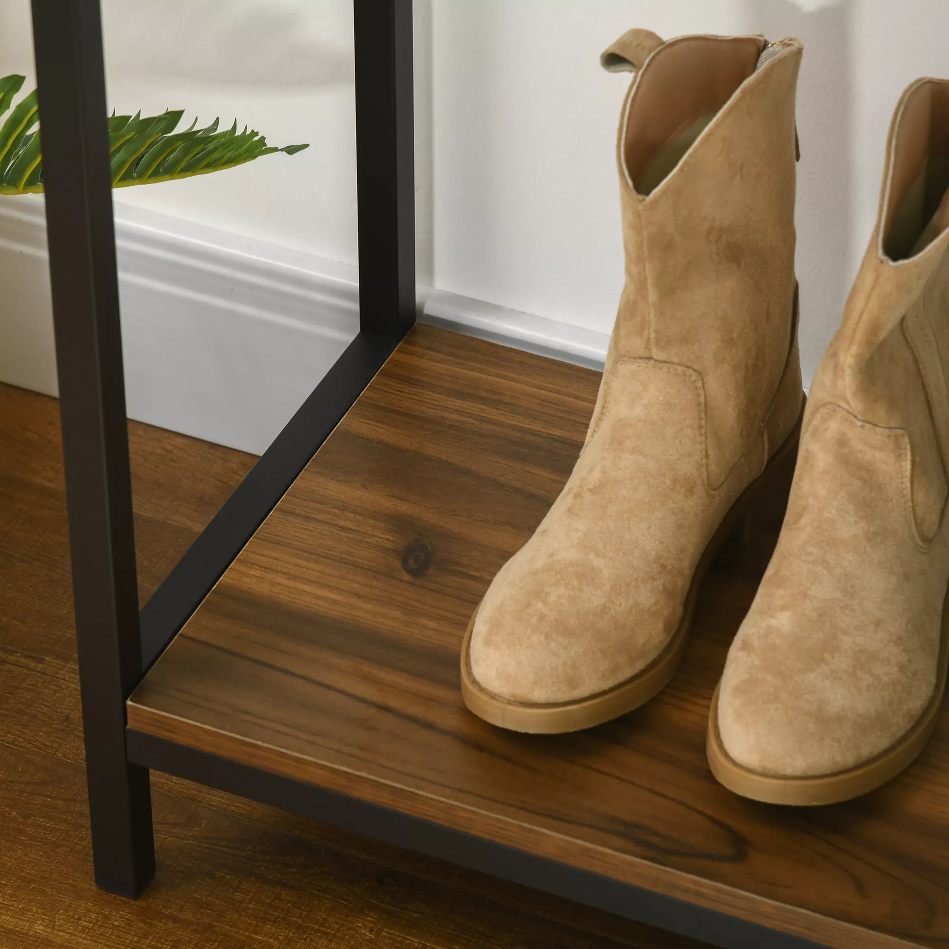 - ✔ Ruda medžio drožlių plokštės plokštė ir juodas metalinis rėmas suteikia industrinę išvaizdą
