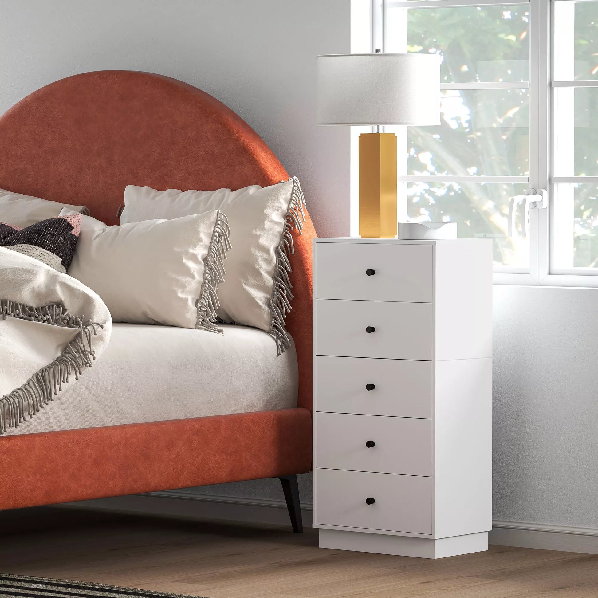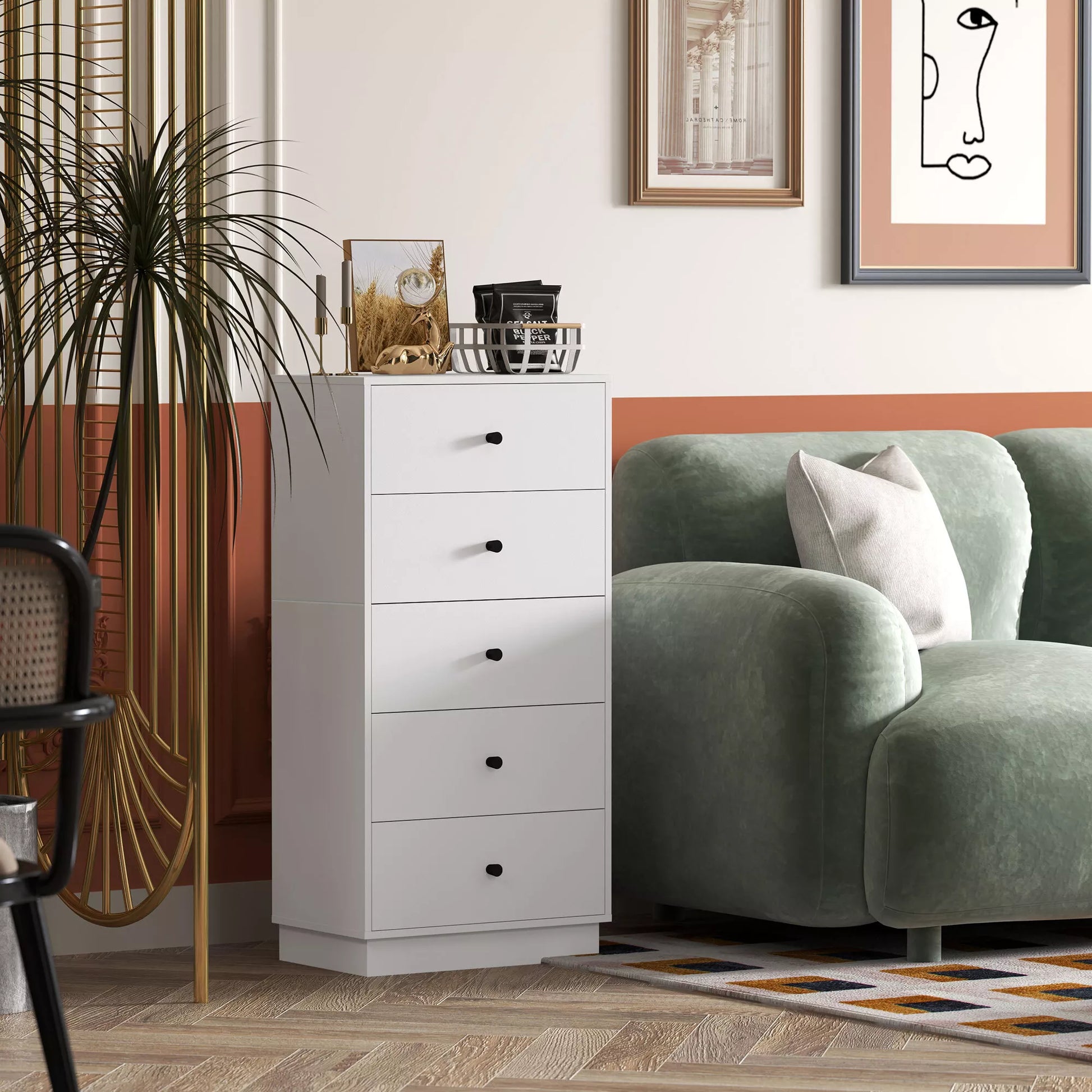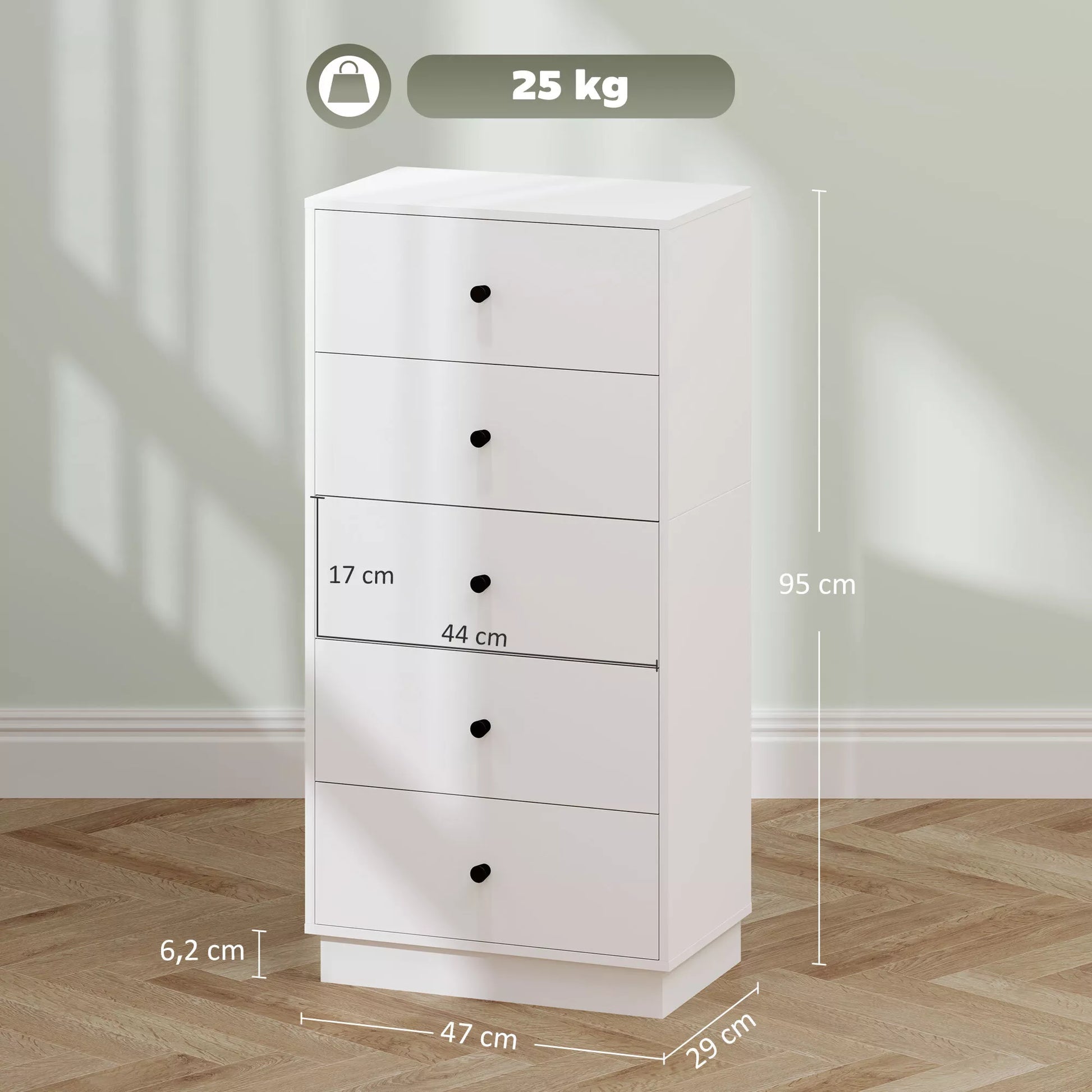 Komoda-spintelė su 5 stalčiais, modernaus stiliaus baldas iš medžio drožlių plokštės, 47 x 29 x 95 cm, balta