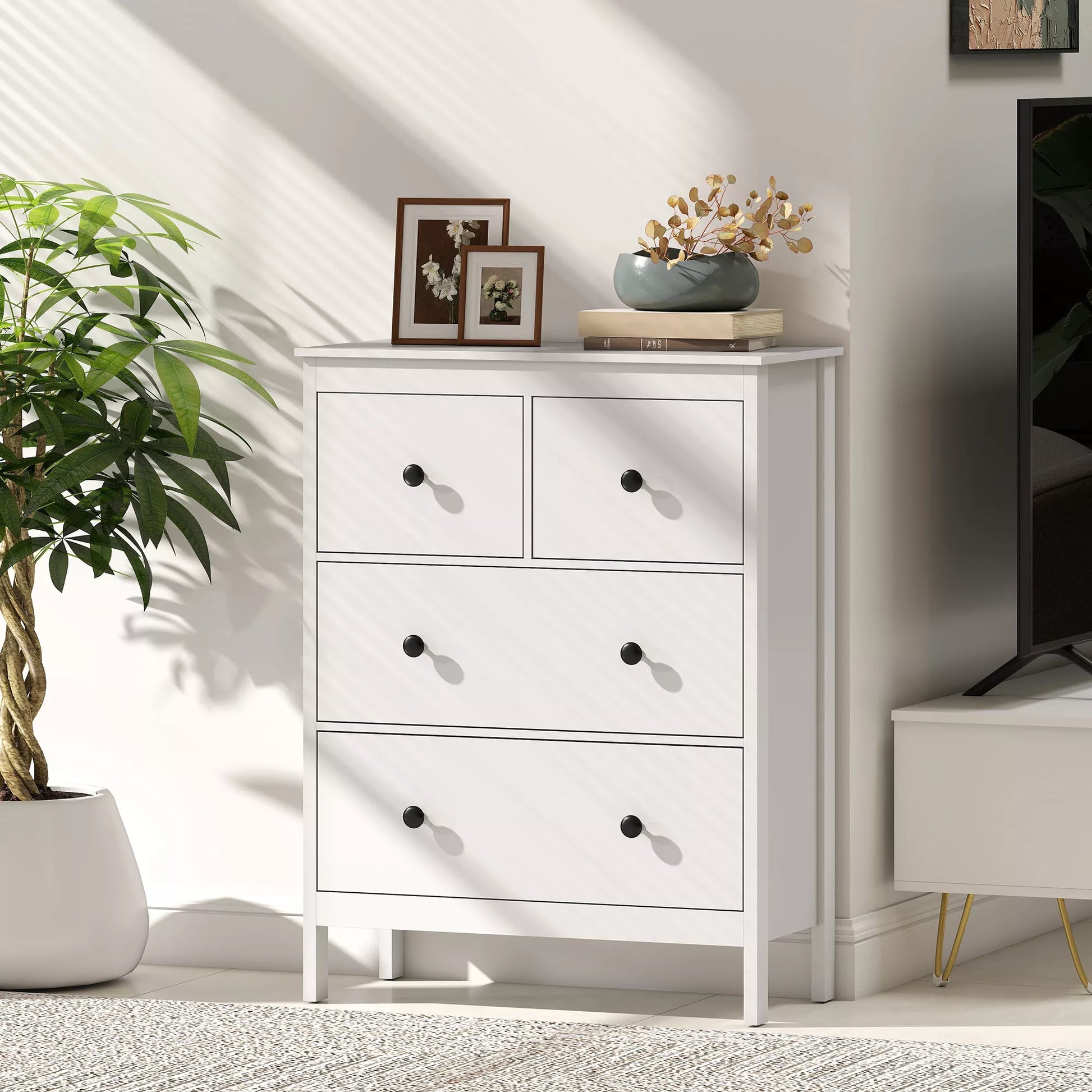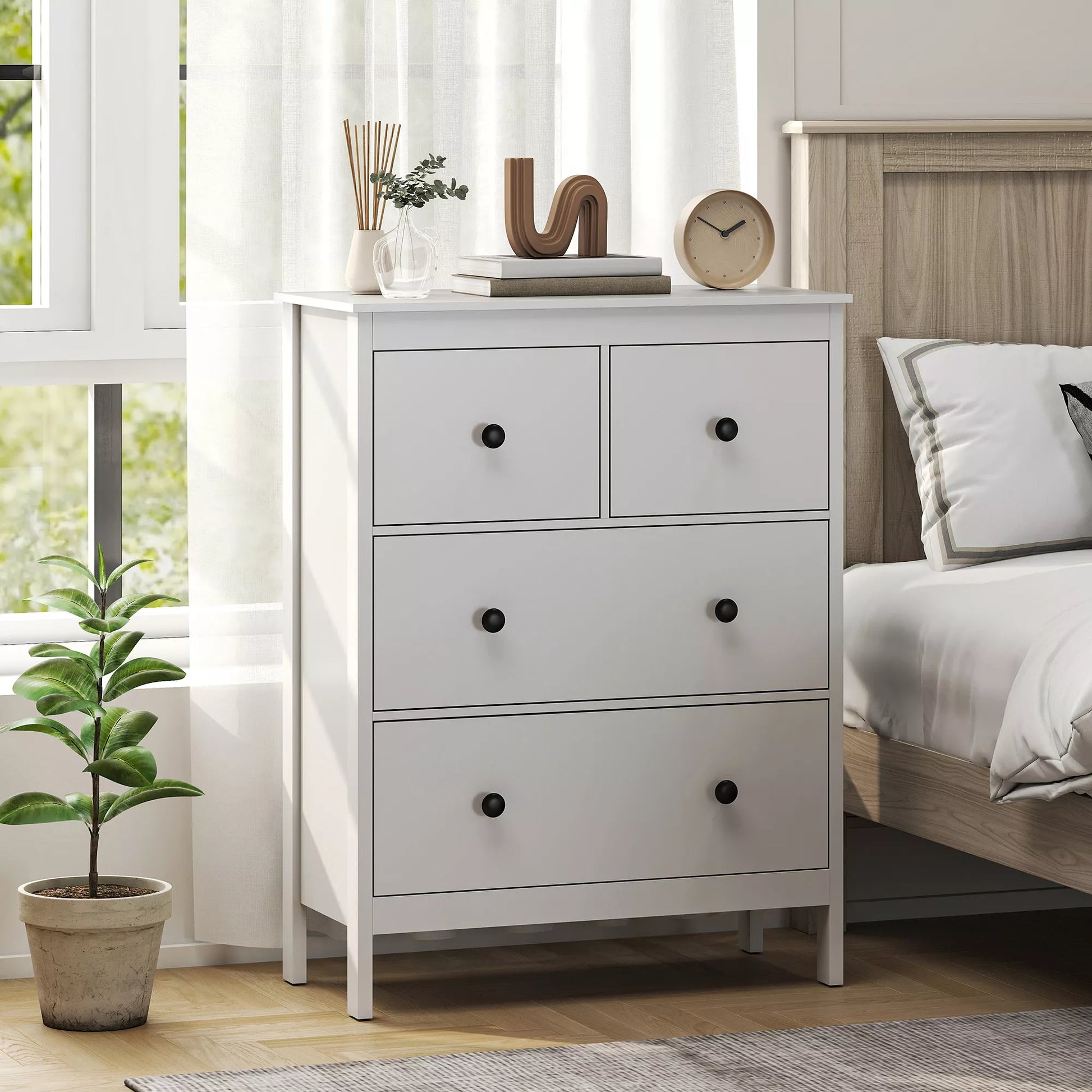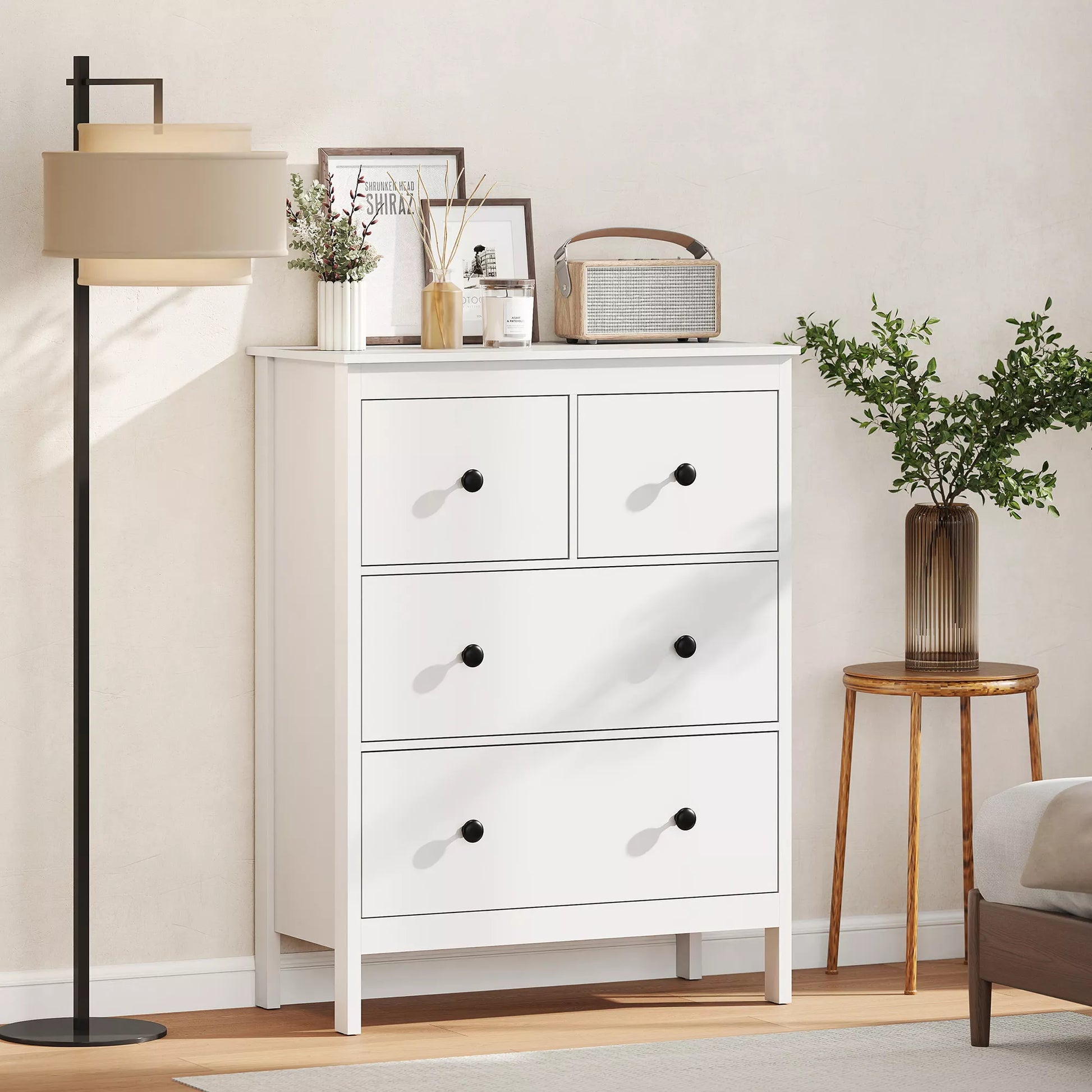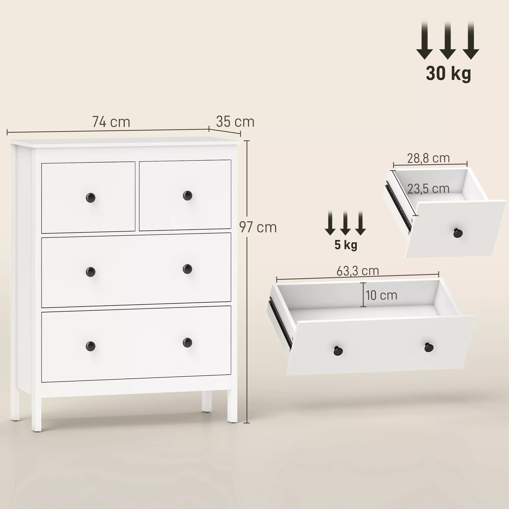 - ✔ Keturi dviejų dydžių stalčiaus stalčiai suteikia daug vietos drabužiams, patalynei ir kitoms daiktams laikyti