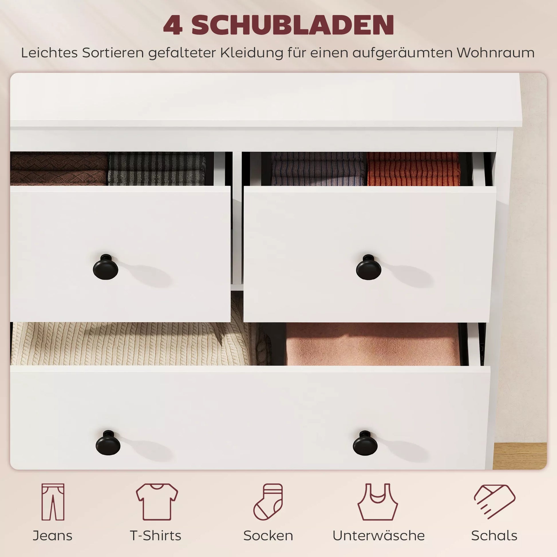 Komoda su 4 stalčiais, skirta drabužiams ir patalynei, svetainė, miegamasis, prieškambaris, medžio drožlių plokštė, balta