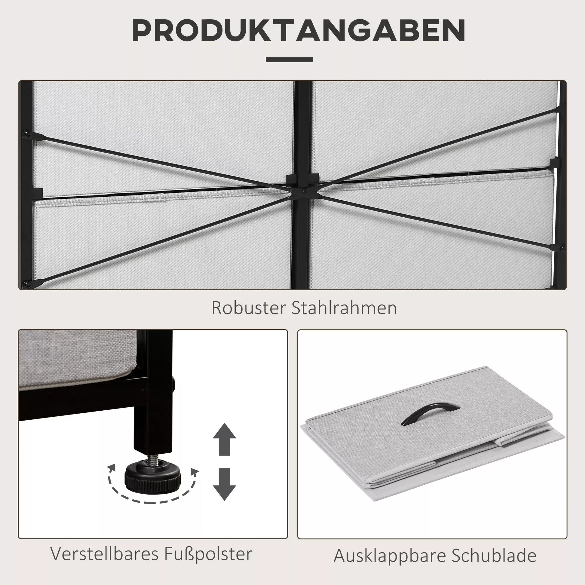 - ✔ Tvirtos plieninės kojelės su lengvai reguliuojamais, neslystančiais padeliais užtikrina optimalų stabilumą ant nelygių grindų