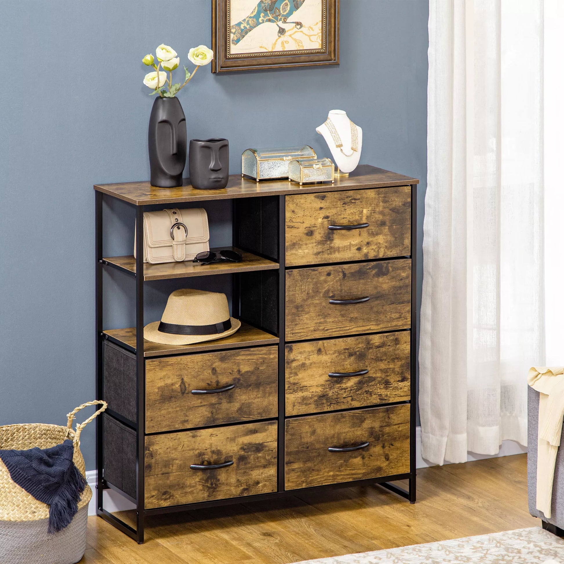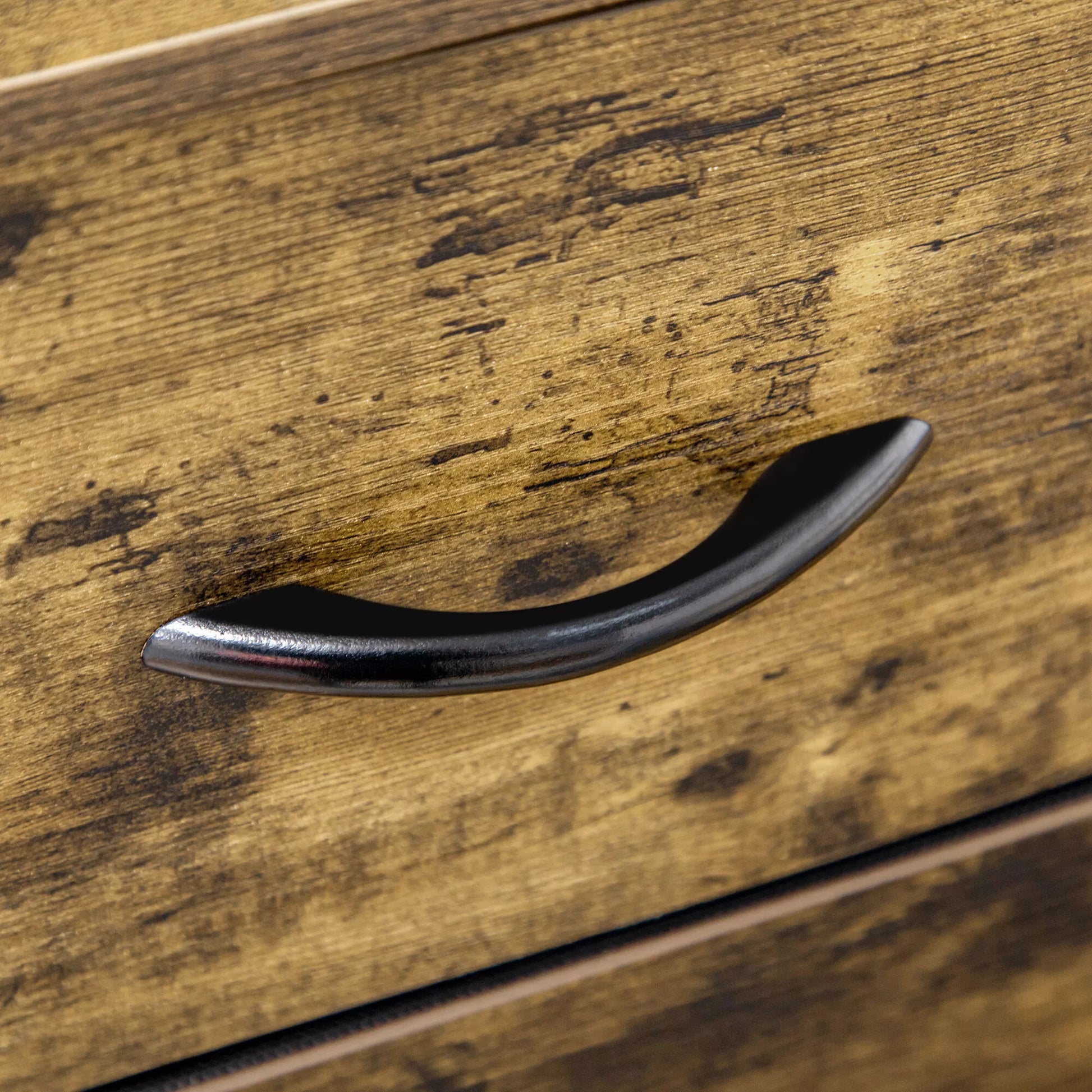 Komoda su šešiomis stalčiais, atviros lentynos, MDF ir plienas, 84x30x92 cm, ruda/juoda, reguliuojamos kojelės