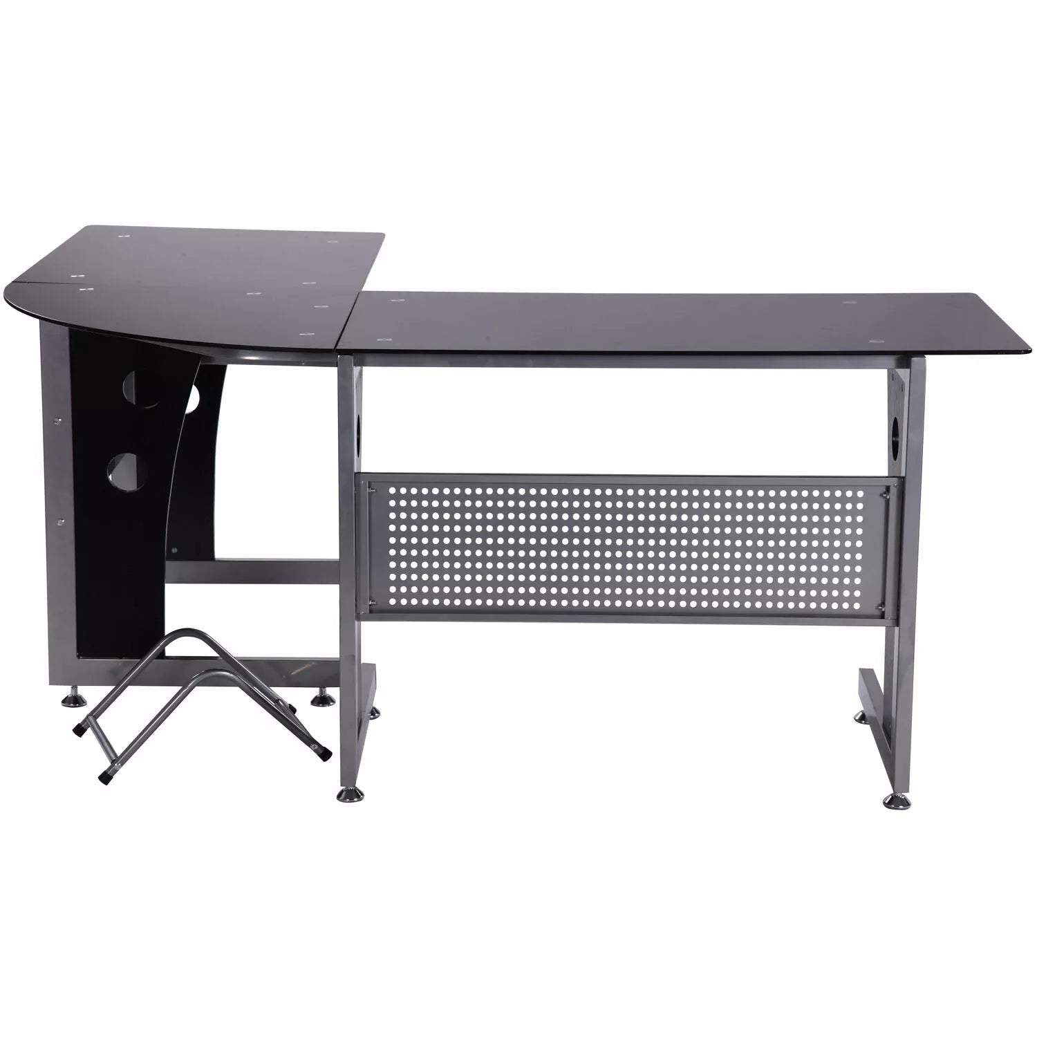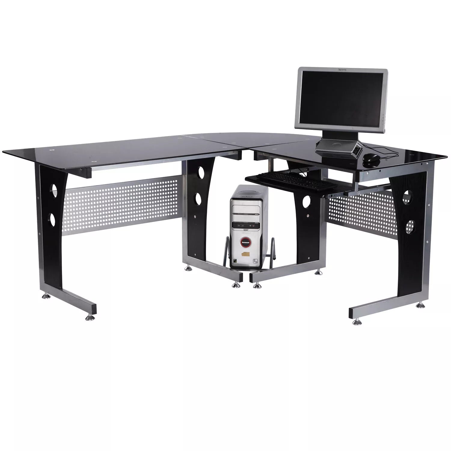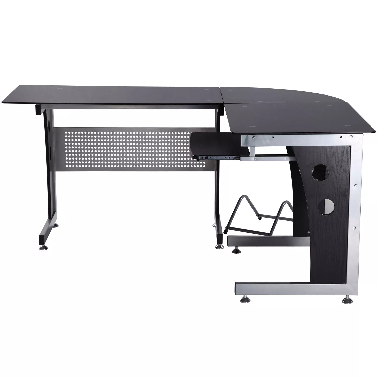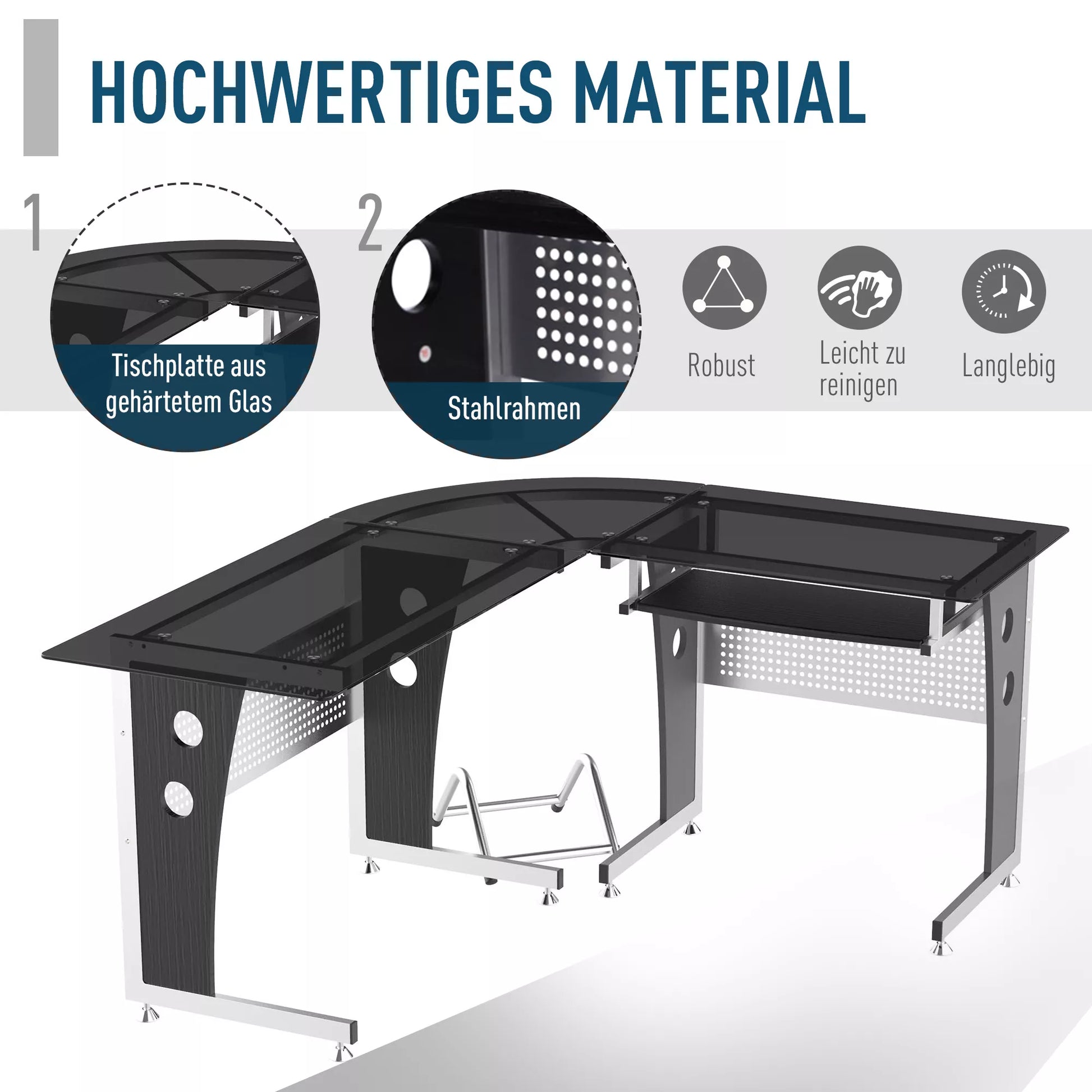 Dėl savo formos šis modernus kampinis rašomasis stalas, prireikus, optimaliai įsitenka kampuose. Dėl didelio stiklinio paviršiaus stalas suteikia pakankamai vietos kompiuteriui, garsiakalbiams, monitoriui, spausdintuvui, rašymo reikmenims ir daugeliui kitų daiktų. Be to, jis turi ištraukiamą klaviatūros laikiklį ir atskirą kompiuterio laikiklį. Tai idealus kompiuterio stalas jūsų darbo vietai namuose ar biure!