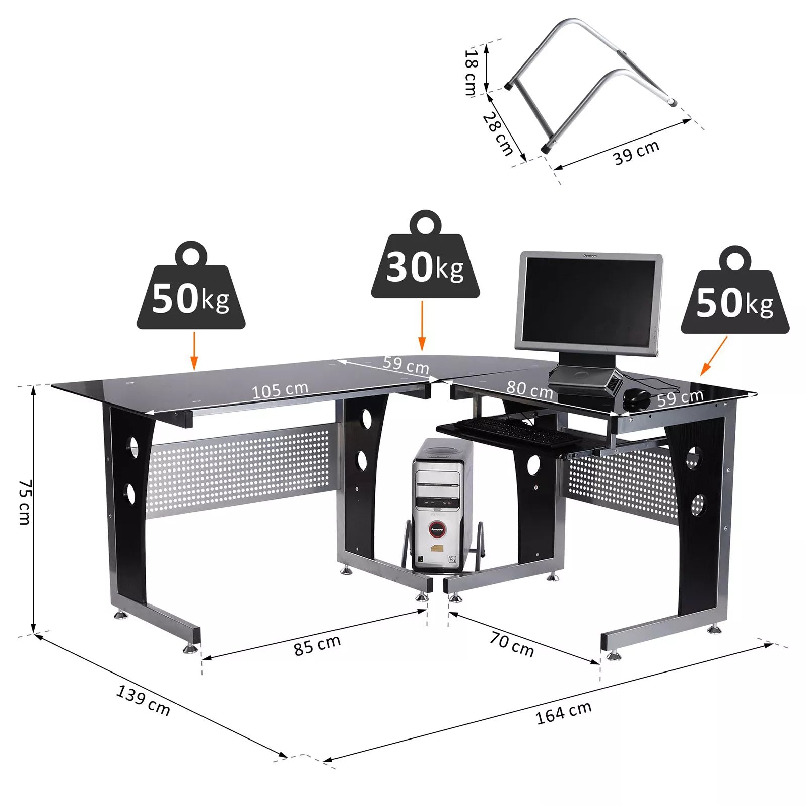 - ✔ Maksimali apkrova: pagrindinis ir šoninis stalas 50 kg, kampinis stalas 30 kg