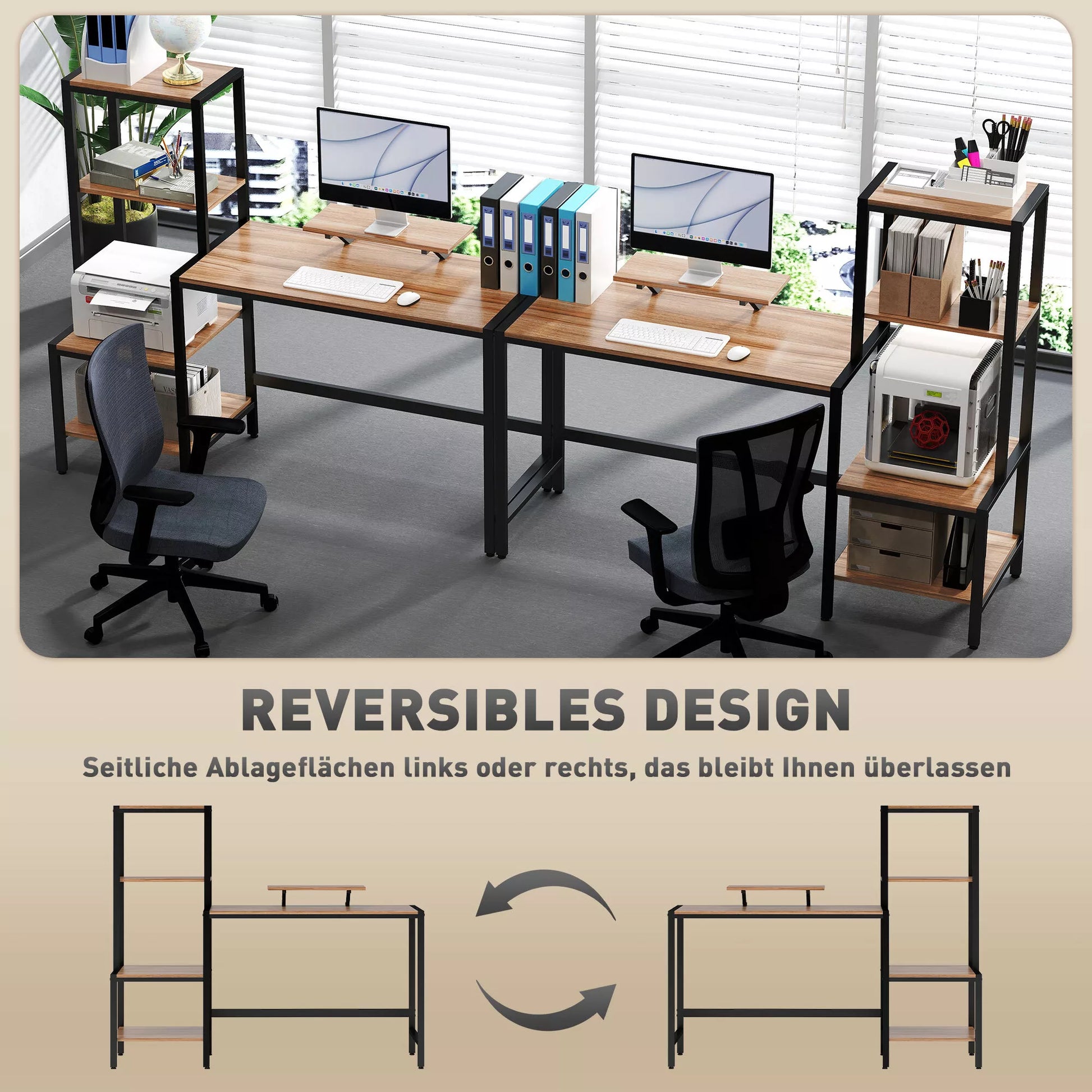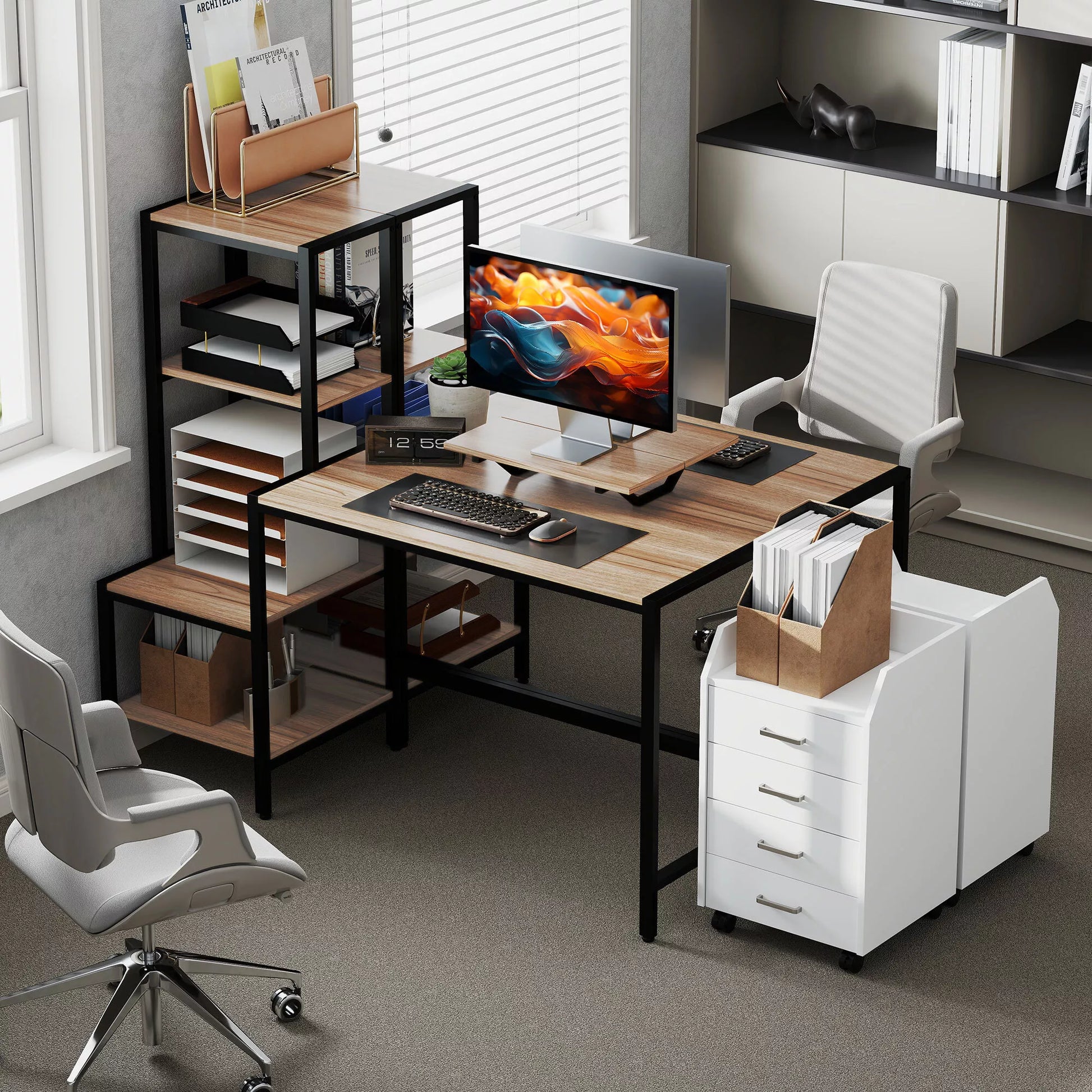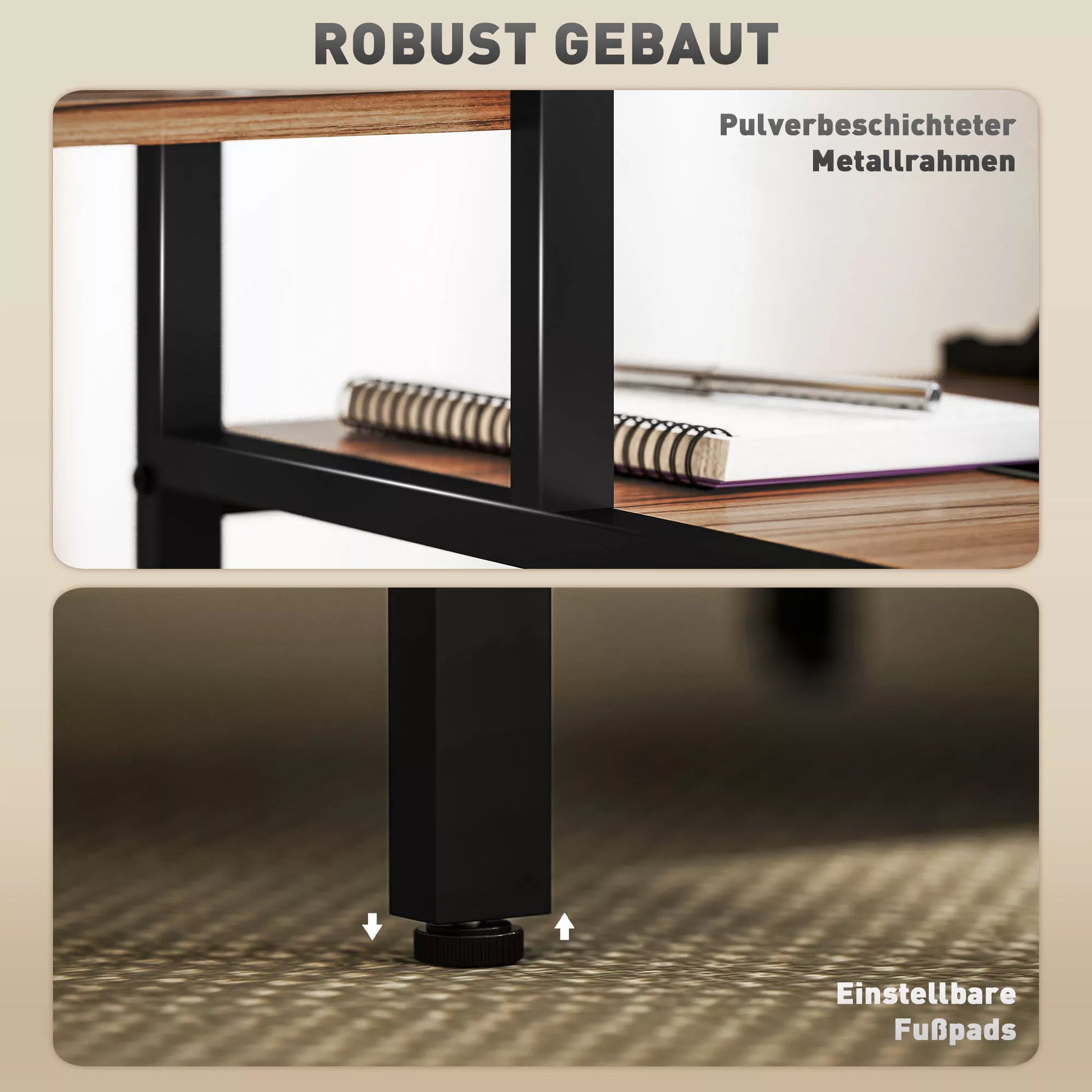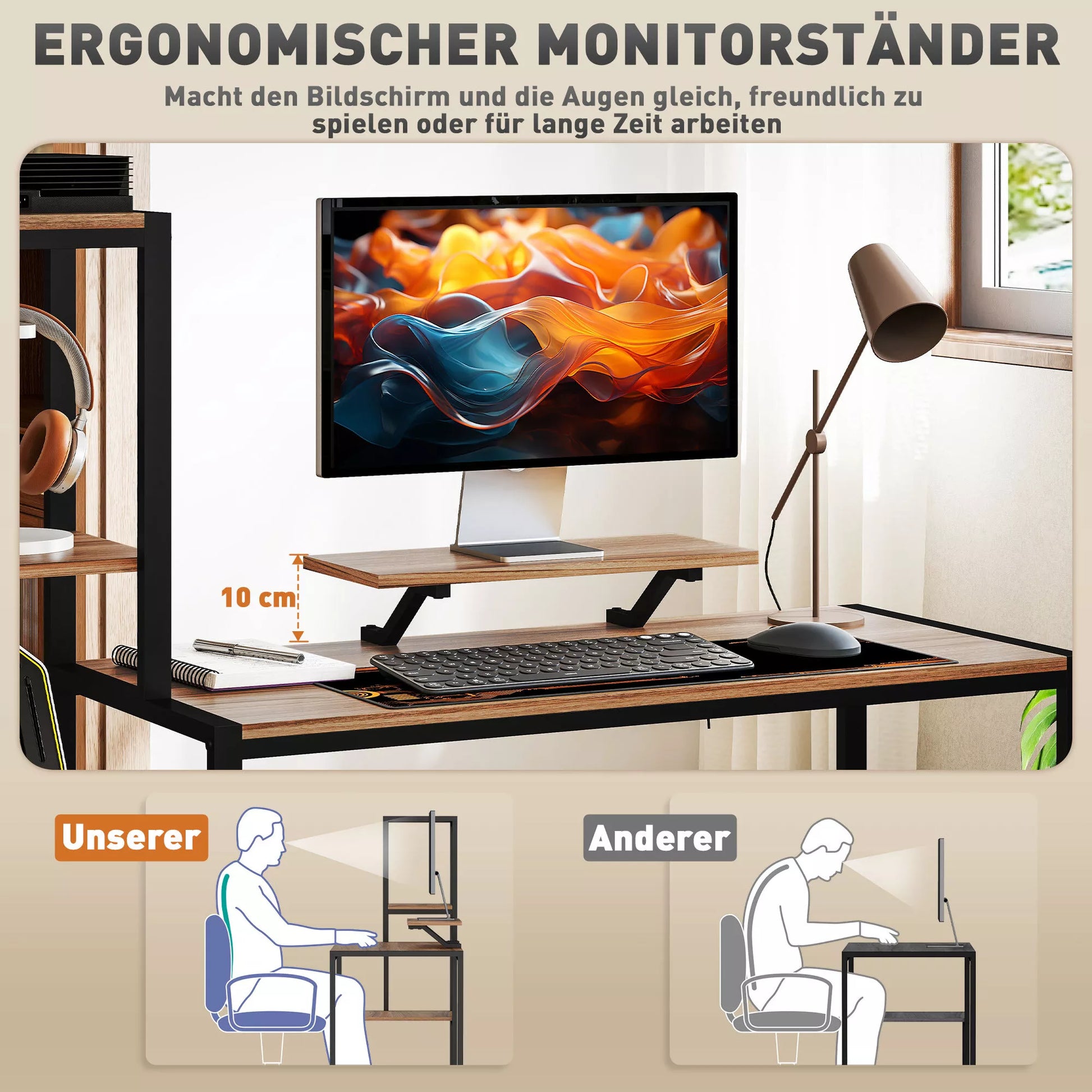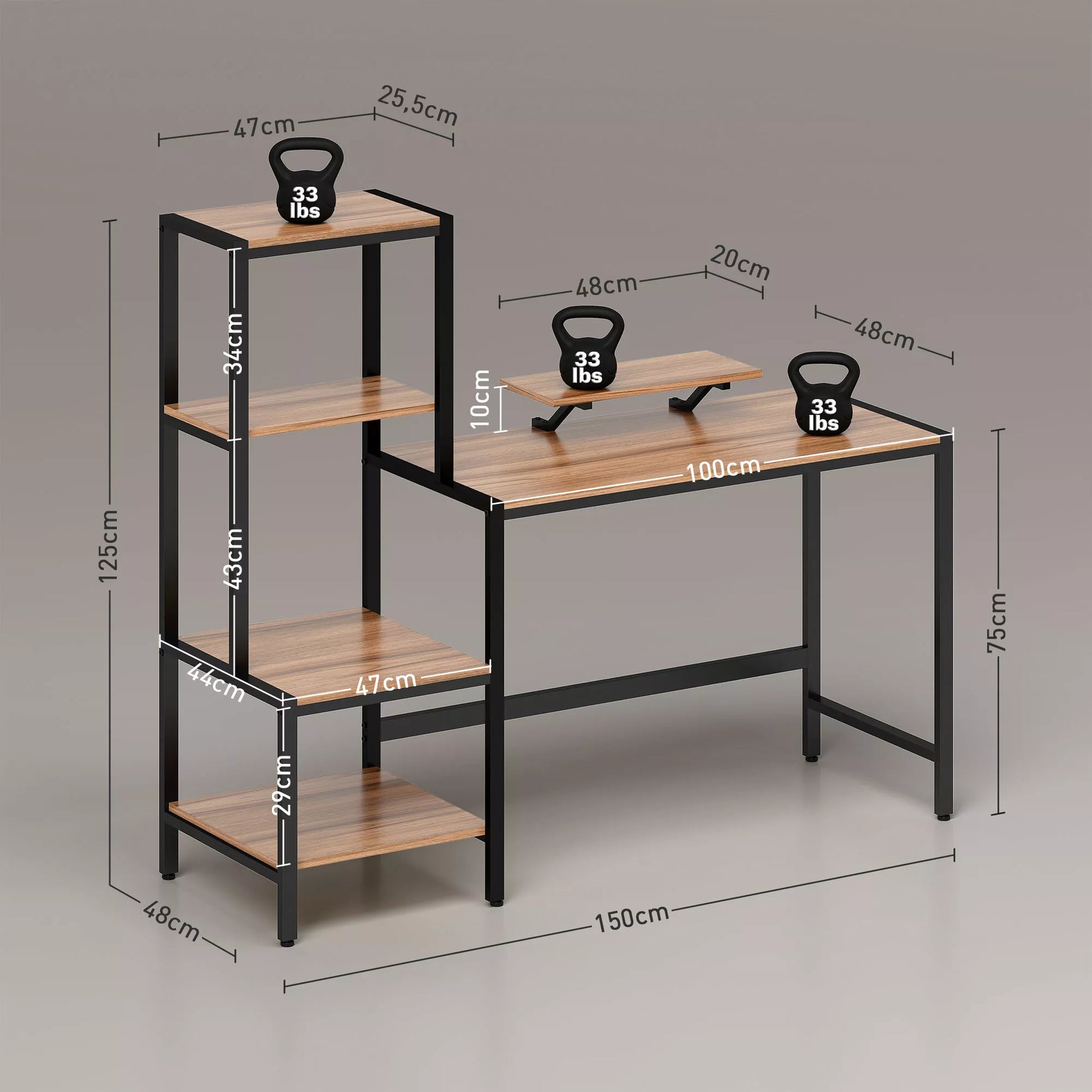 Kompiuterio stalas su monitoriaus laikikliu, rašomasis stalas su 4 pakopų lentyna, pramoninio dizaino, rudas