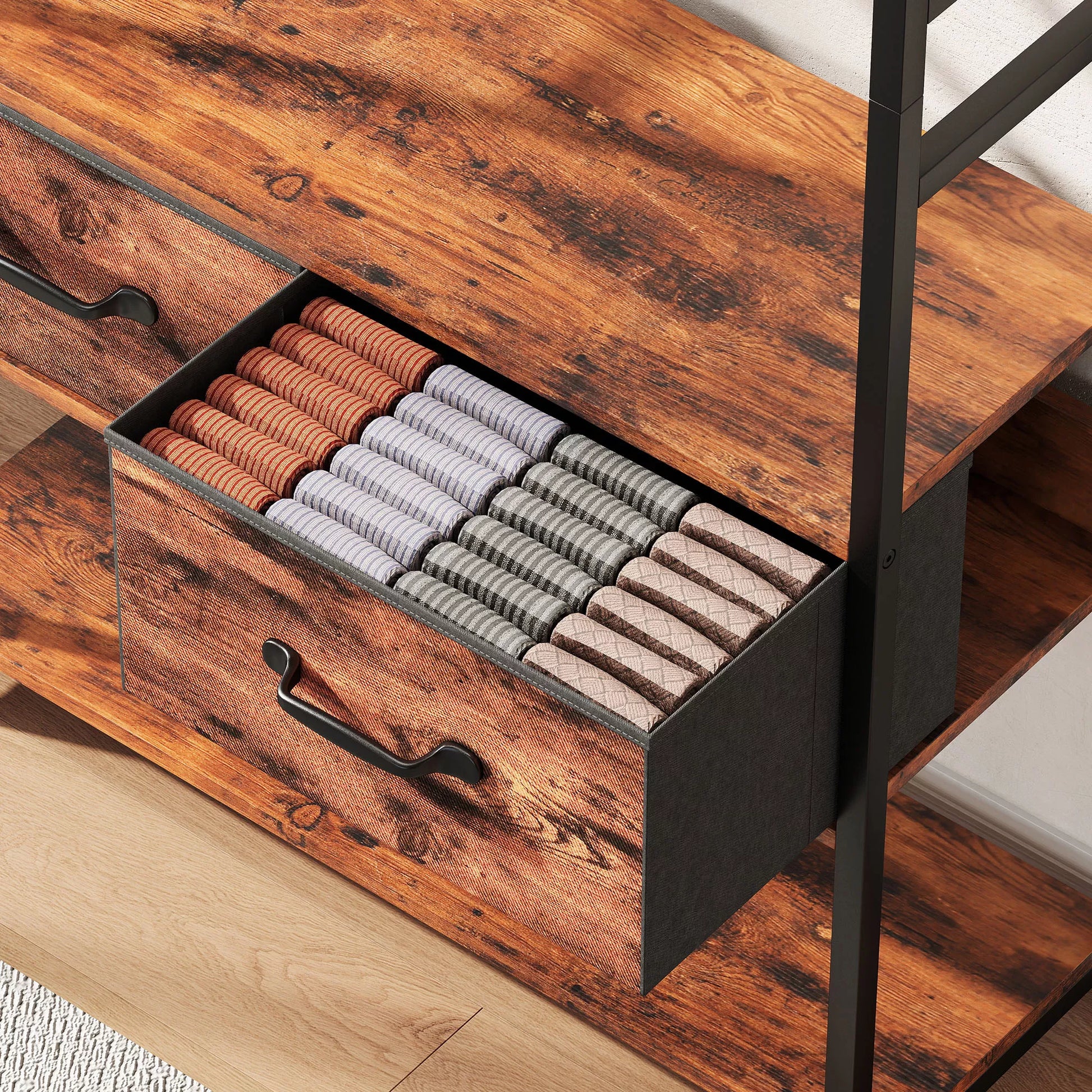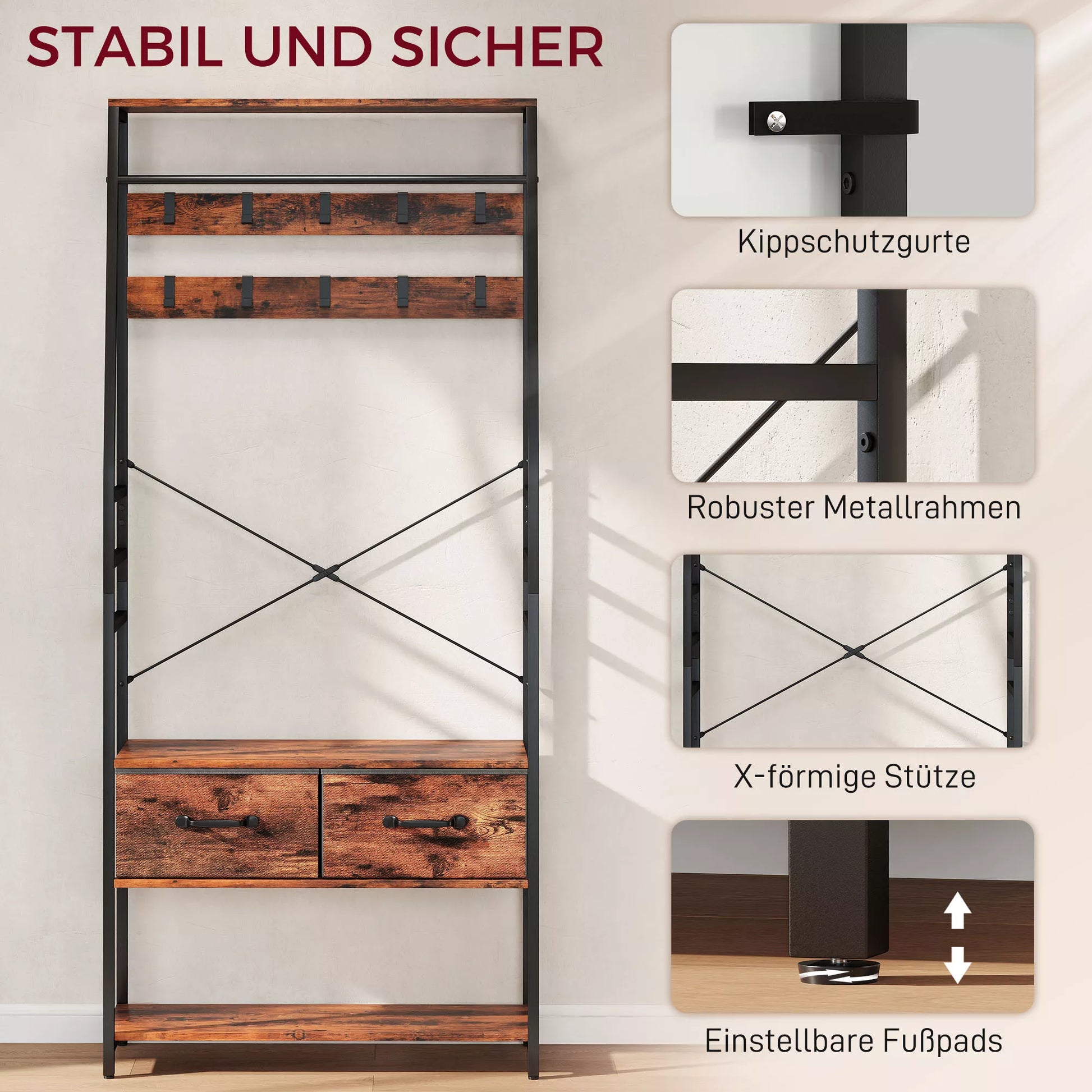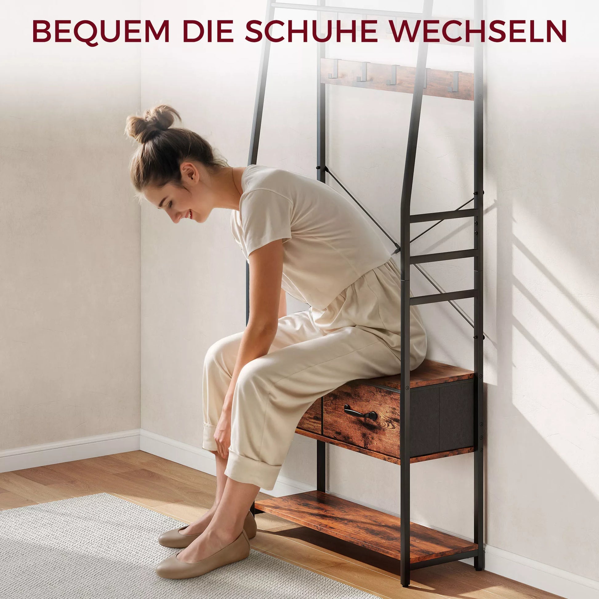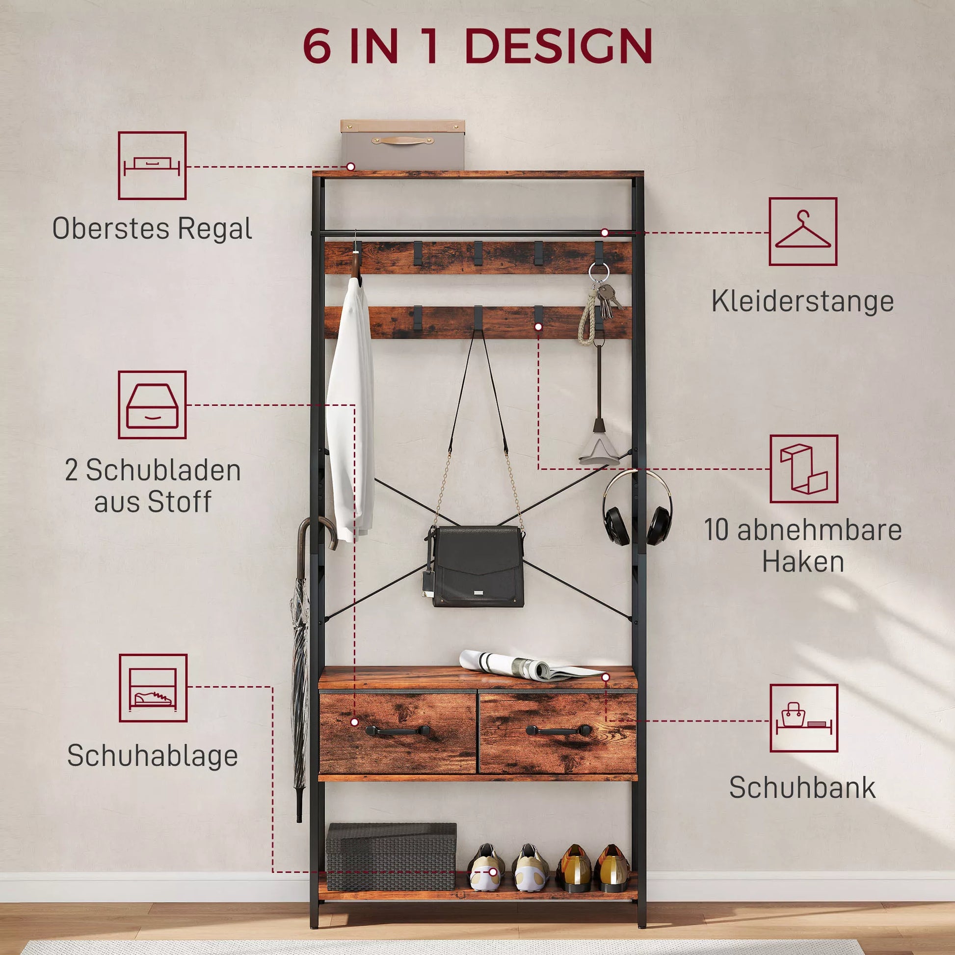 - ✔ 6-in-1 dizainas: Sujungia drabužių kabyklą, batų suolą, batų lentyną, laikymo lentyną, audinių stalčius ir drabužių kabliukus