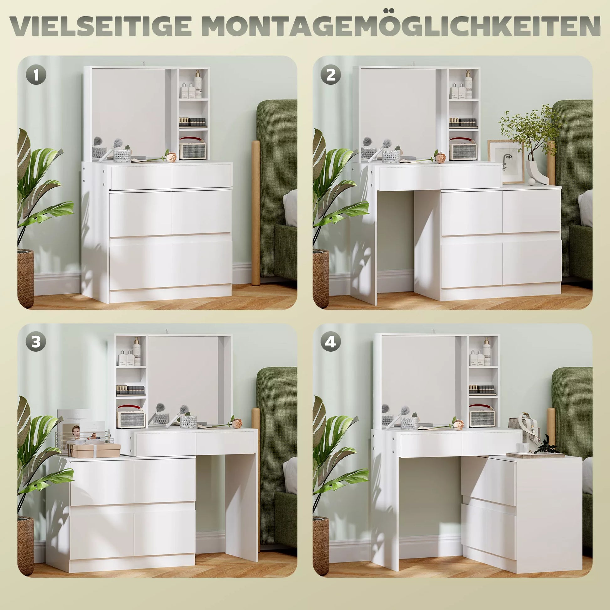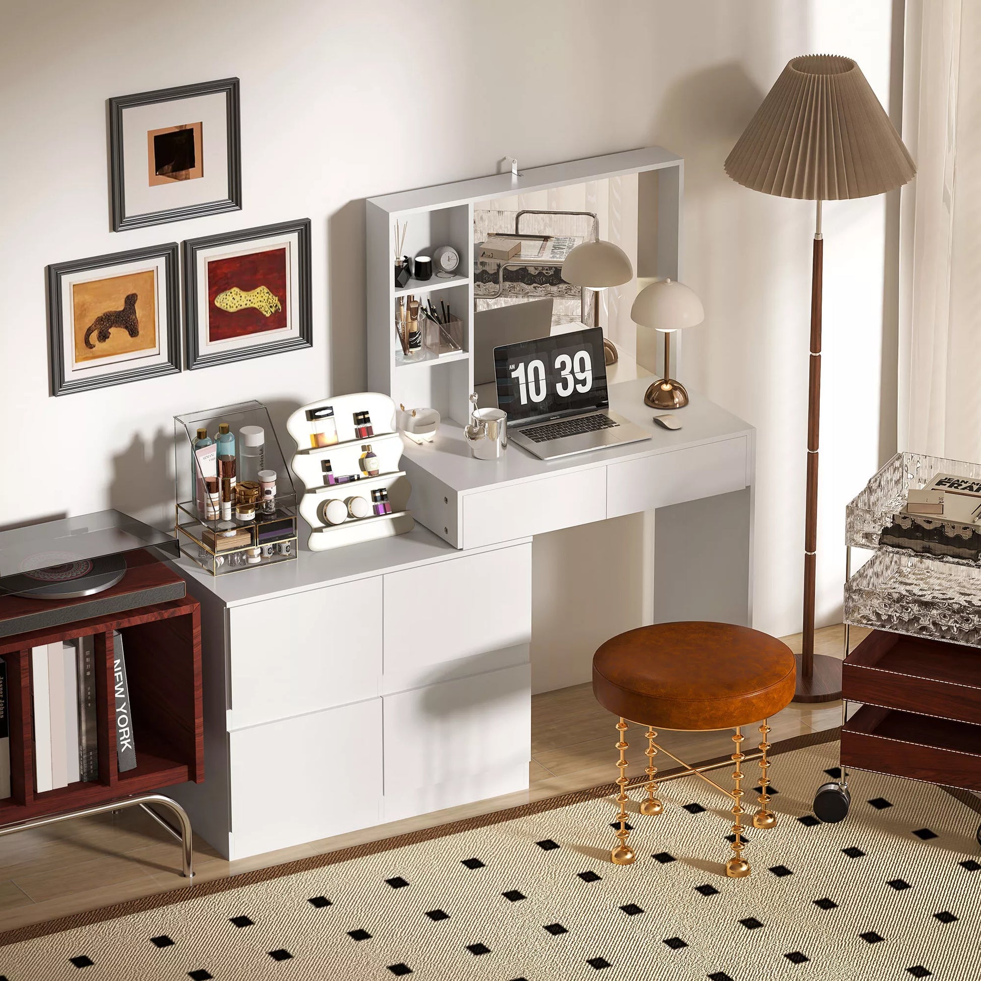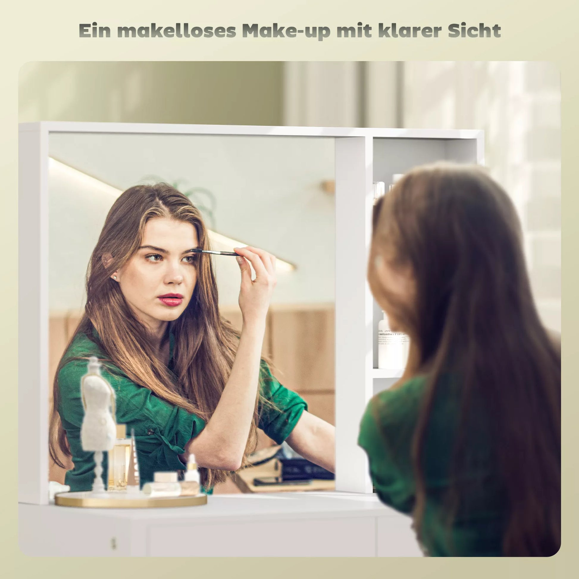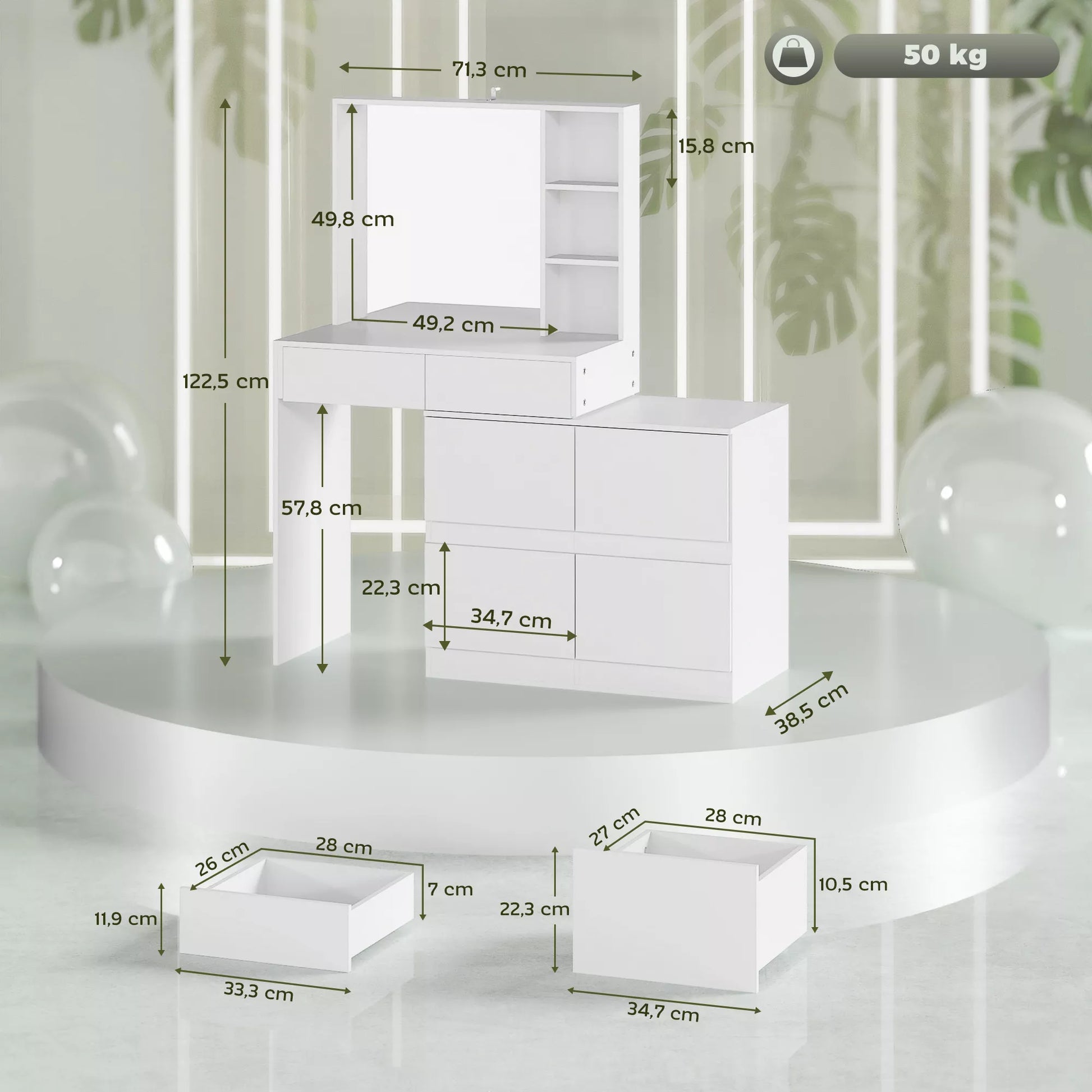 Kosmetinis staliukas, makiažo staliukas su dideliu veidrodžiu, 4 stalčiais, 3 atviromis lentynomis, 2 spintelėmis, MDF, baltas