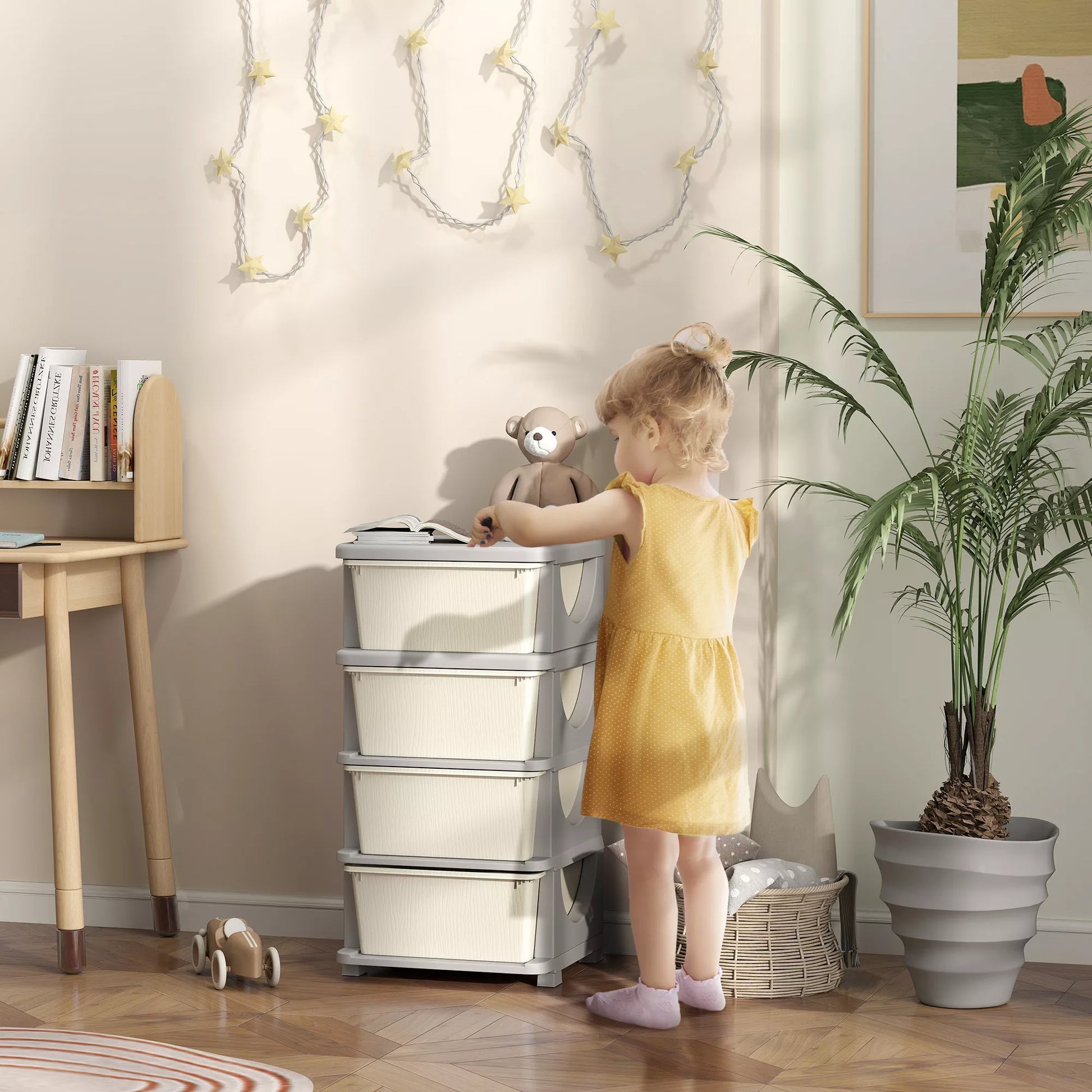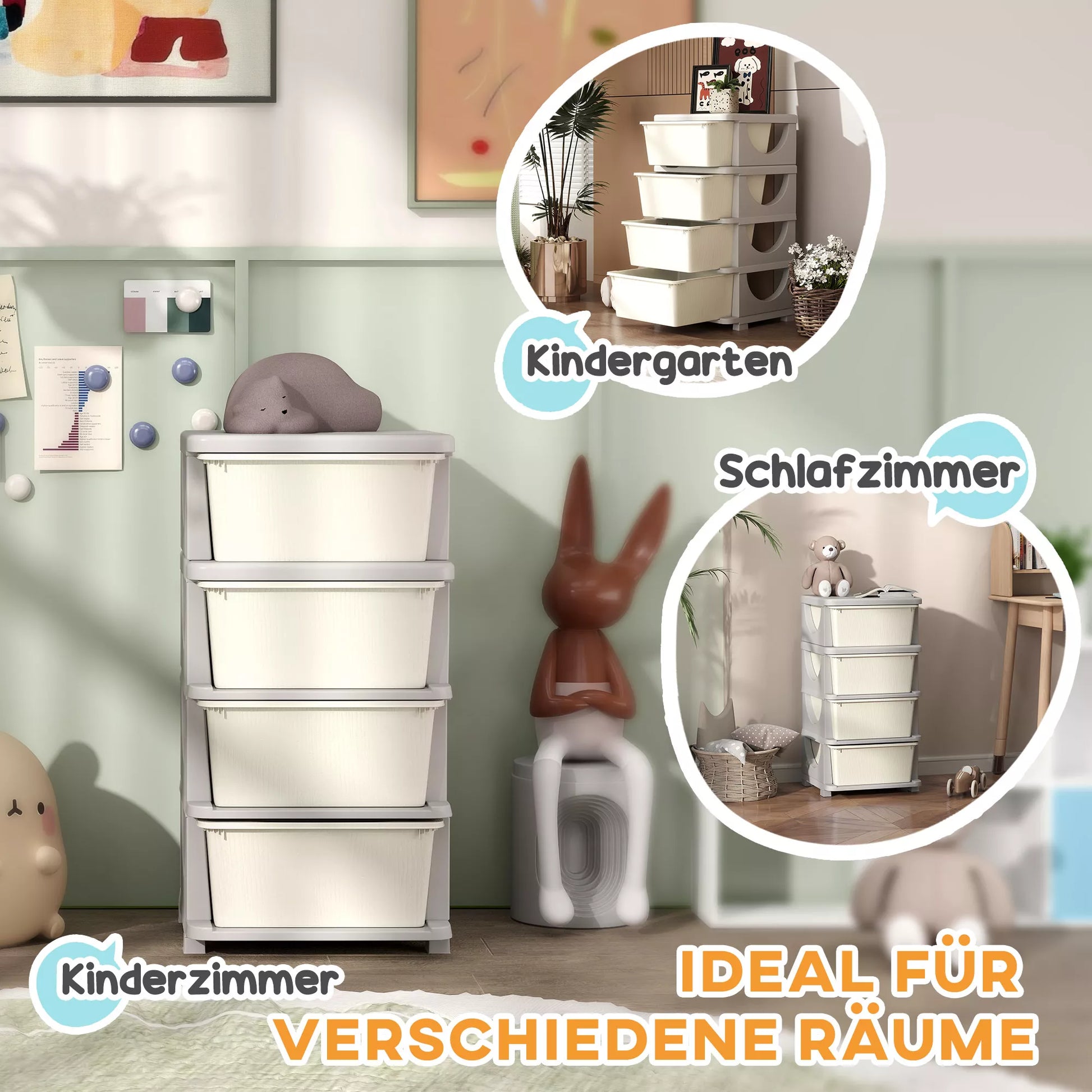 Vaikų daiktų laikymo dėžės, 4 dideli stalčiai, apvalūs kraštai, plastikas, 37x37x76 cm, kreminė balta spalva