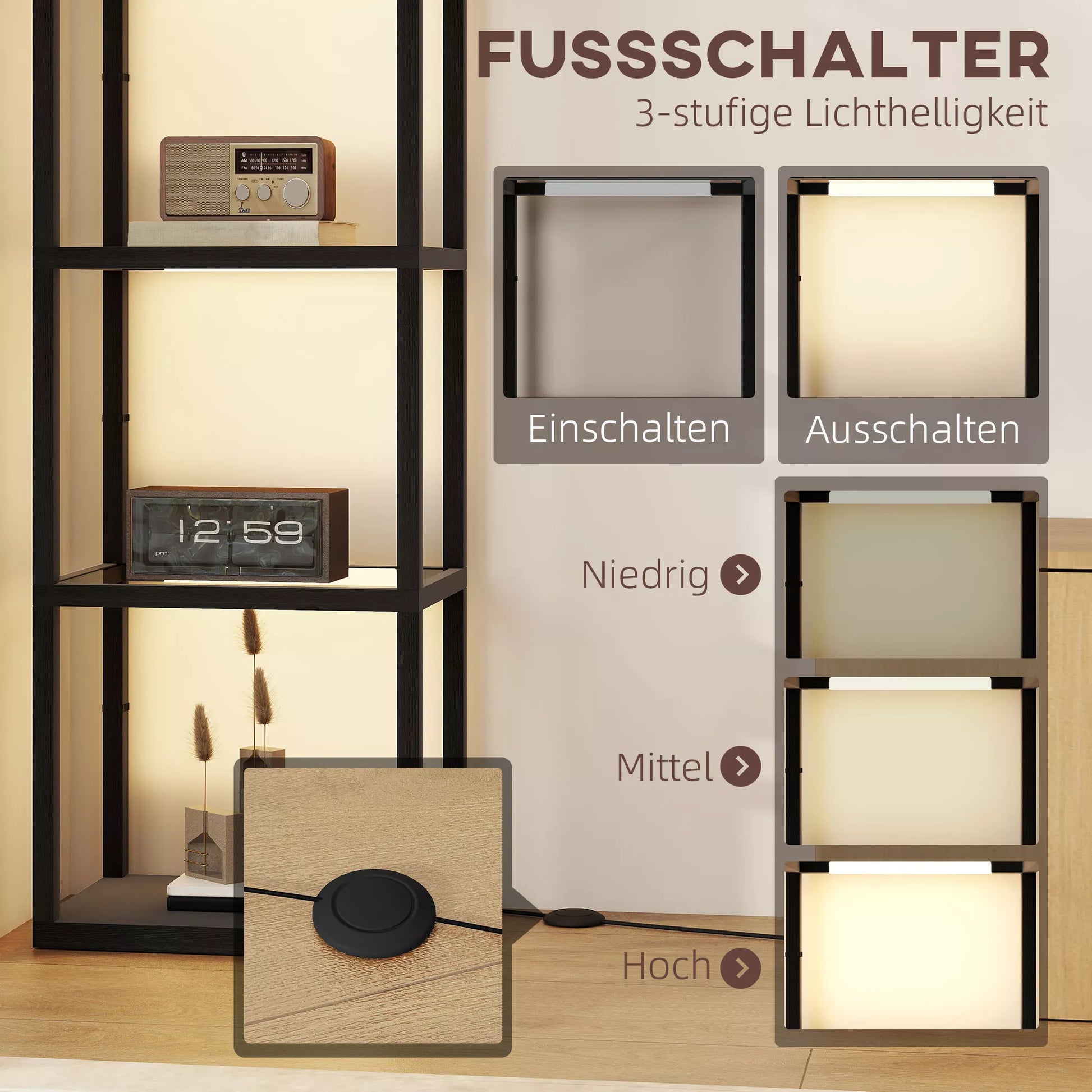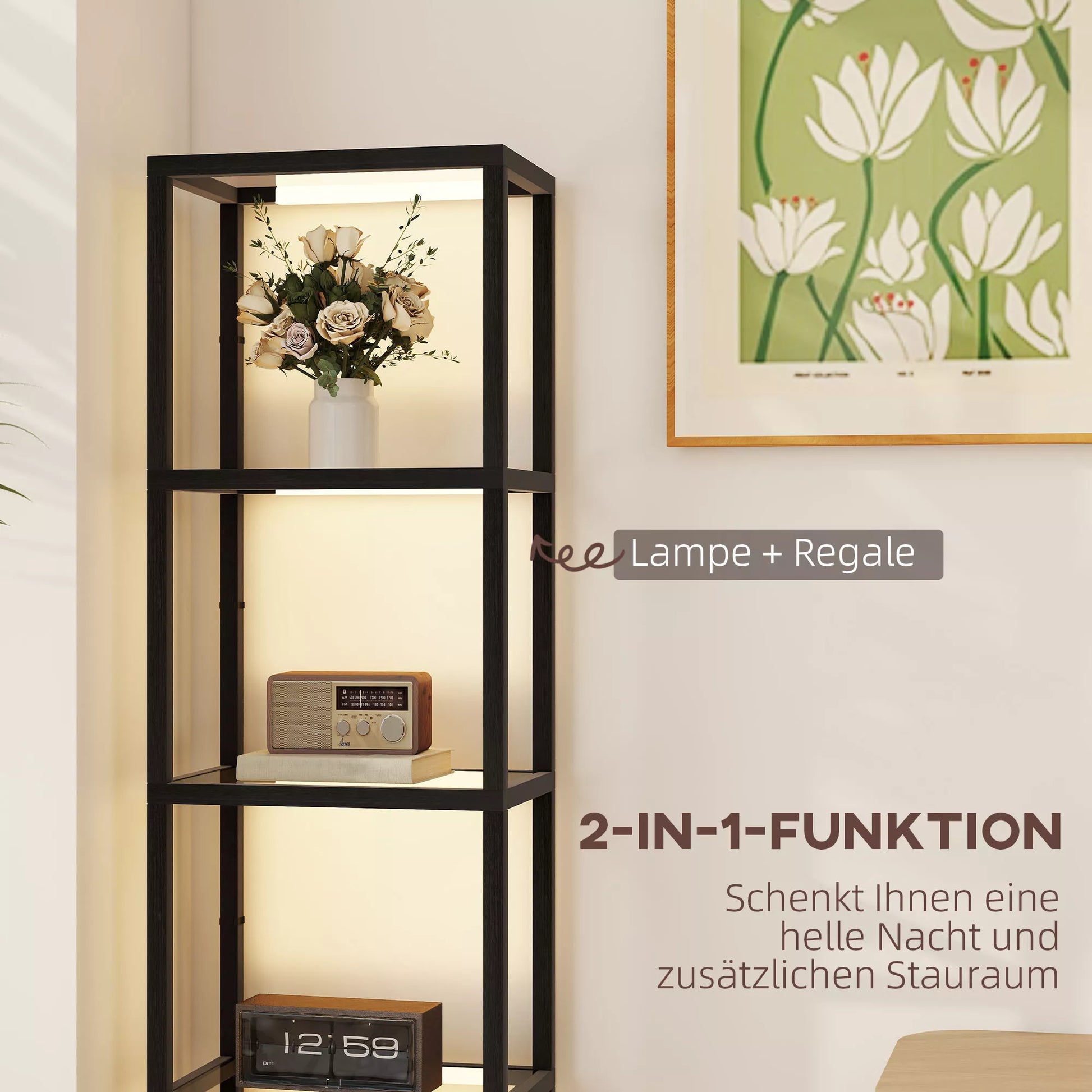 Apšvieskite savo namus su šia pastatoma lempa, puikiai tinkančia bet kuriam kampui, ir mėgaukitės šilta balta LED šviesa (3000K) su trimis ryškumo lygiais. Integruota keturių skyrių lentynų sistema leidžia stilingai eksponuoti mėgstamus daiktus ant grūdinto stiklo lentynų, kurios optimaliai praleidžia šviesą. Tiesiog prijunkite prie elektros tinklo ir įjunkite kojiniu jungikliu.