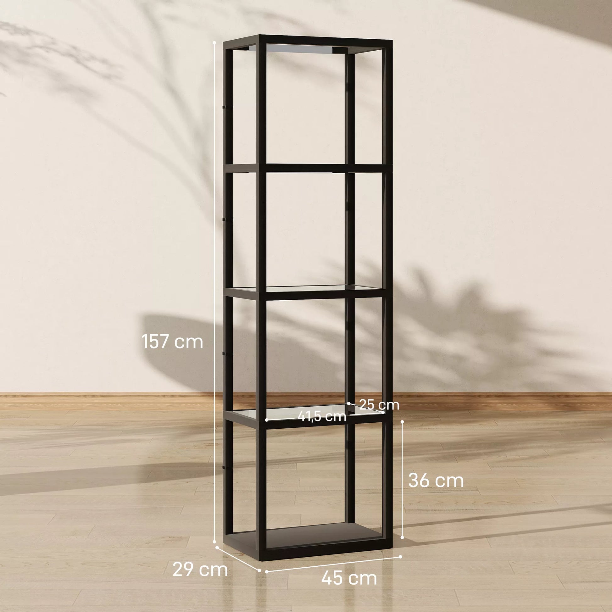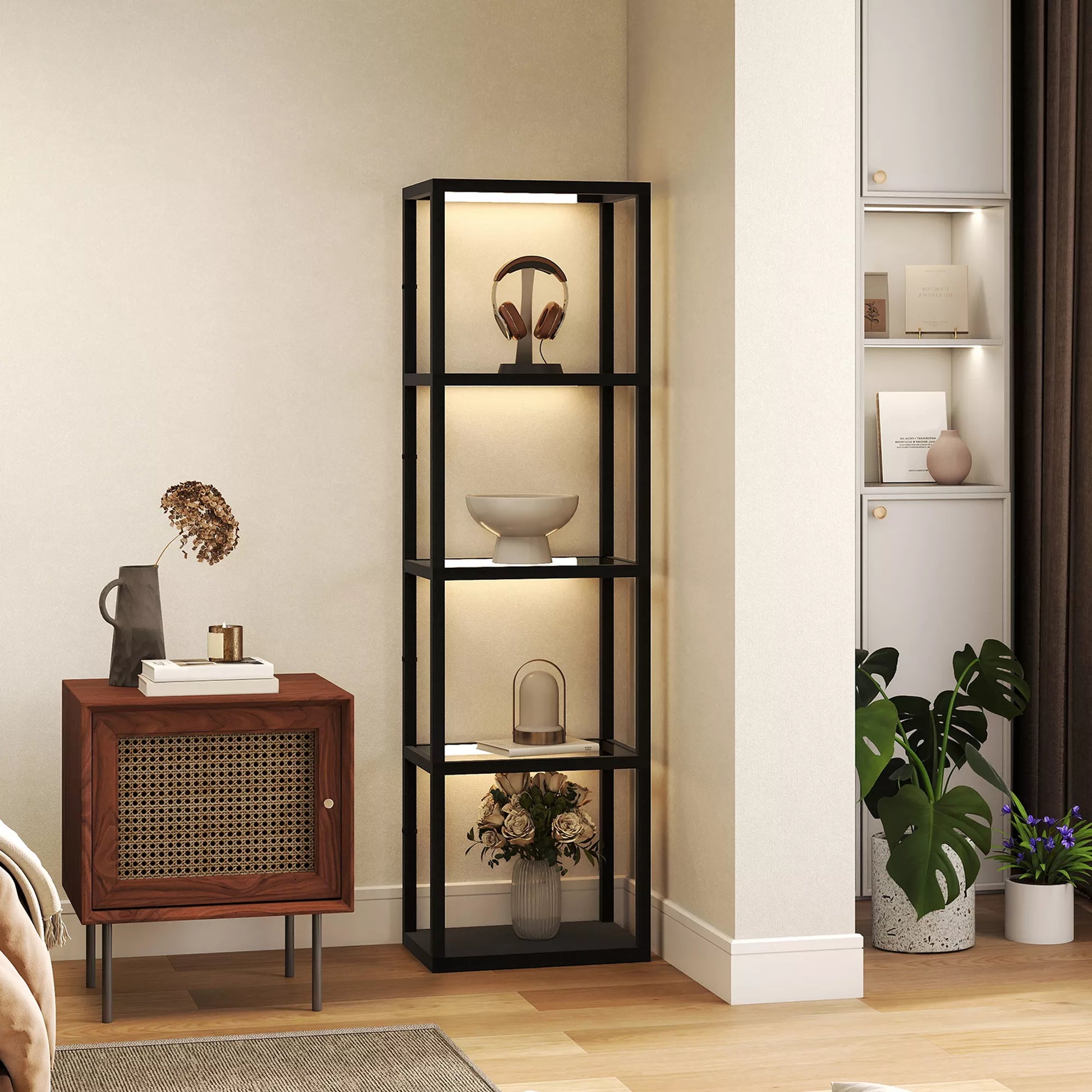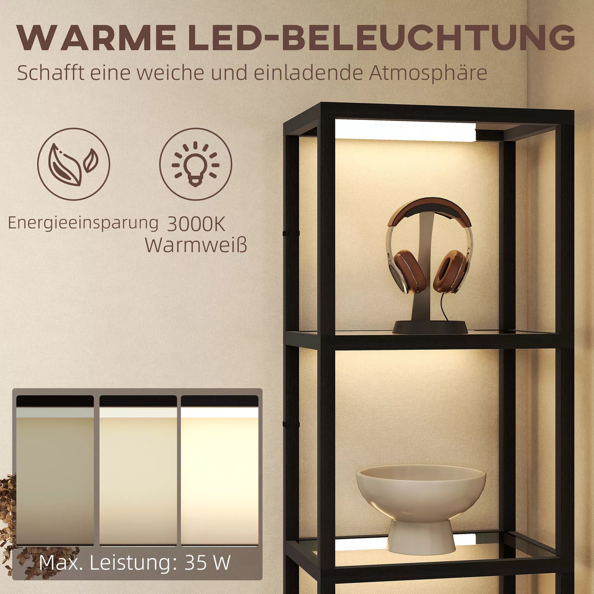 LED grindinis šviestuvas su 4 pakopų lentyna, šviečianti lentyna su 4 stiklinėmis lentynėlėmis, kojinis jungiklis, MDF, juoda spalva