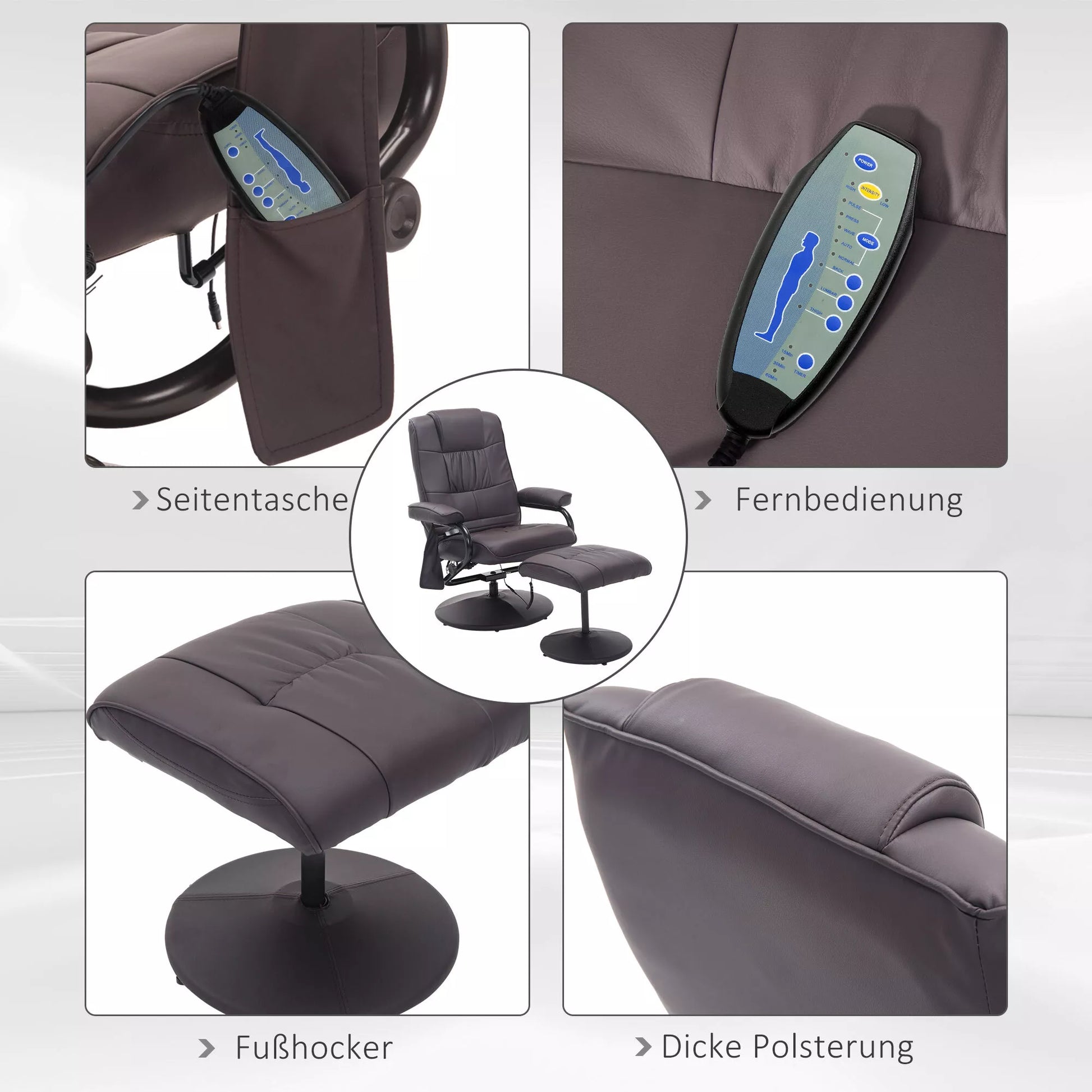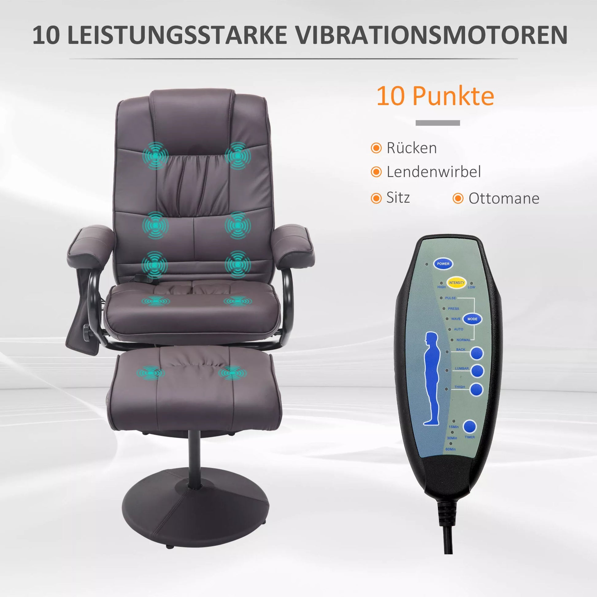 Masažinė kėdė, relaksacinė kėdė, su pakoja, 10 vibracijos taškų, 1 nuotolinio valdymo pultelis; 77 cm x 84 cm x 95 cm, ruda