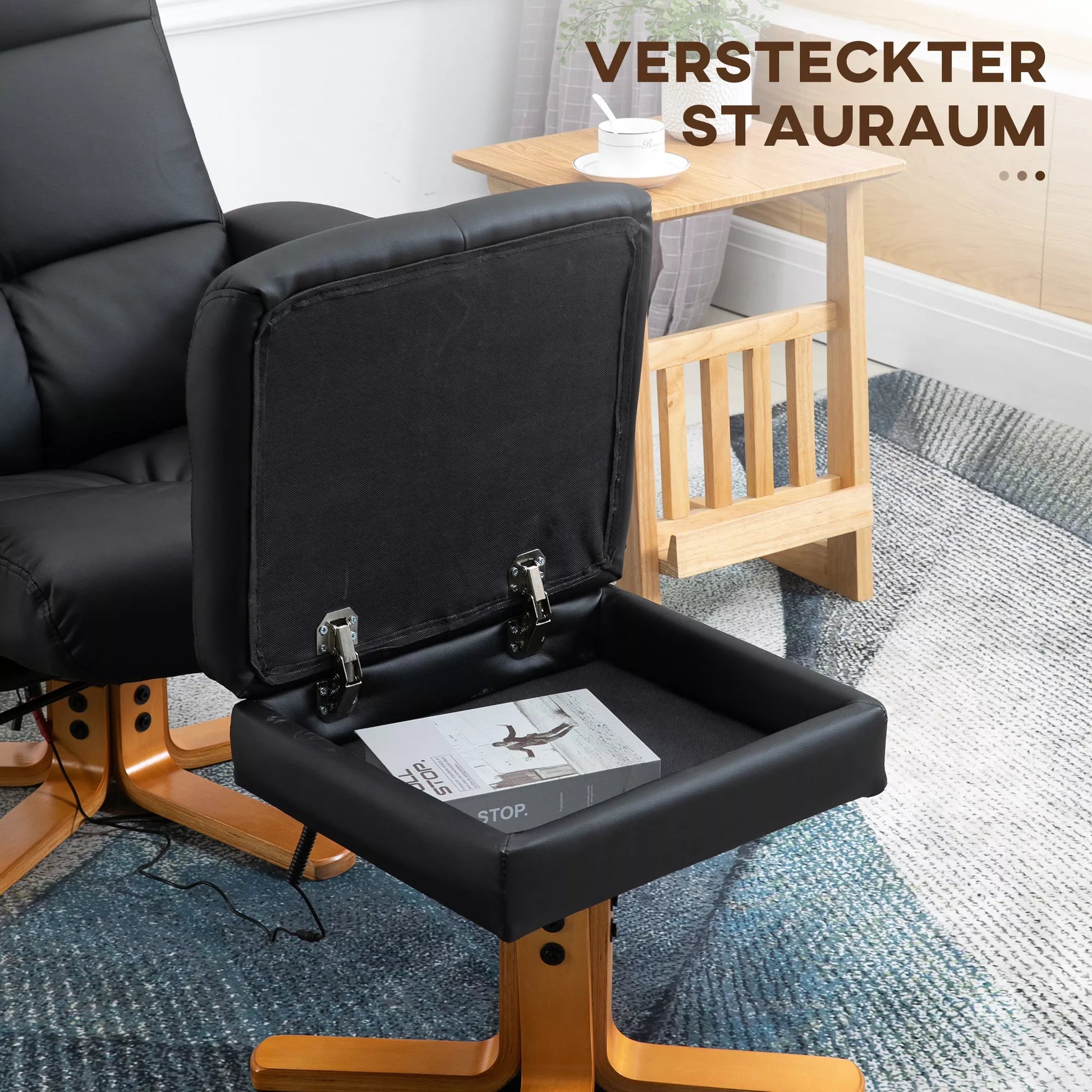Masažinė kėdė su pakoja, 145° atlošiama relaksinė kėdė su masažo ir gulėjimo funkcija, daiktadėže, TV/poilsio krėslas svetainei, dirbtinė oda, 80 x 86 x 99 cm, juoda