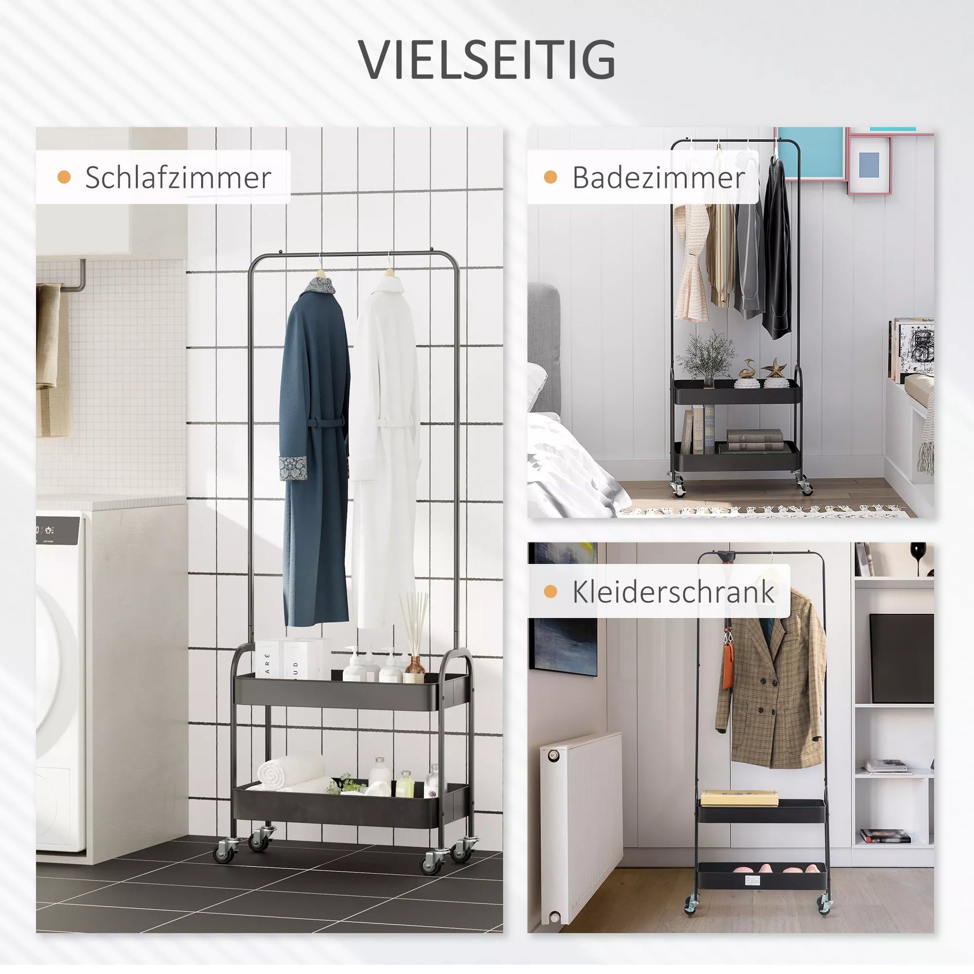 Šis mobilus drabužių stovas su lentynomis padeda efektyviai išnaudoti erdvę. Jo kompaktiškas dydis idealiai tinka ribotoms erdvėms, tokioms kaip koridoriai ar drabužinės. Tvirtas milteliais dažyto plieno rėmas patikimai laiko paltus, striukes ir kitus drabužius. Dvi apatinės stovo lentynos suteikia vietos batams ir krepšiams laikyti. Dėl keturių lengvai riedančių ratukų jį taip pat galima lengvai perkelti.