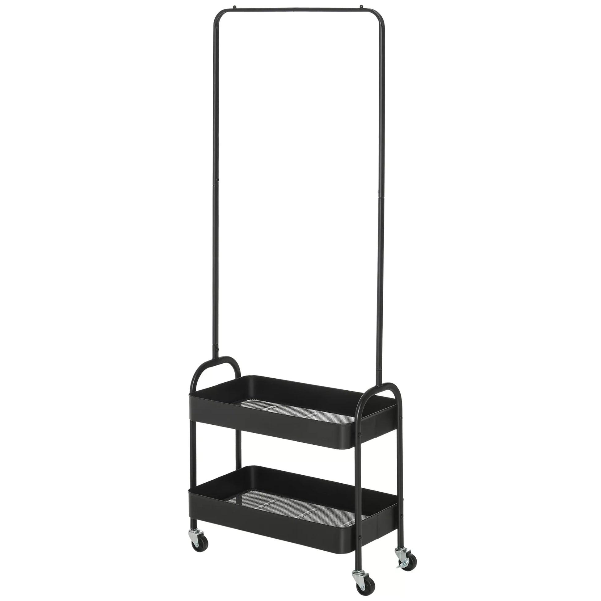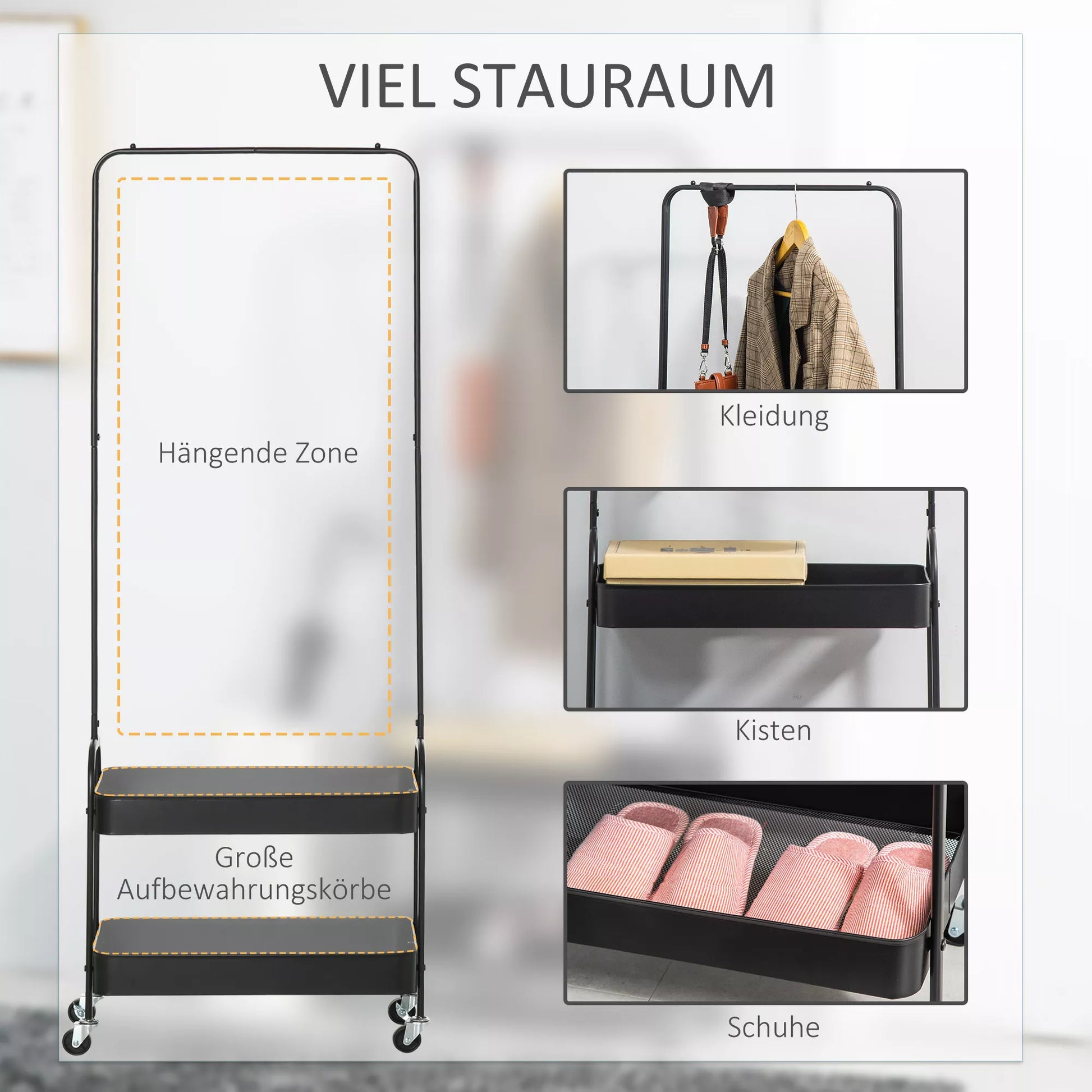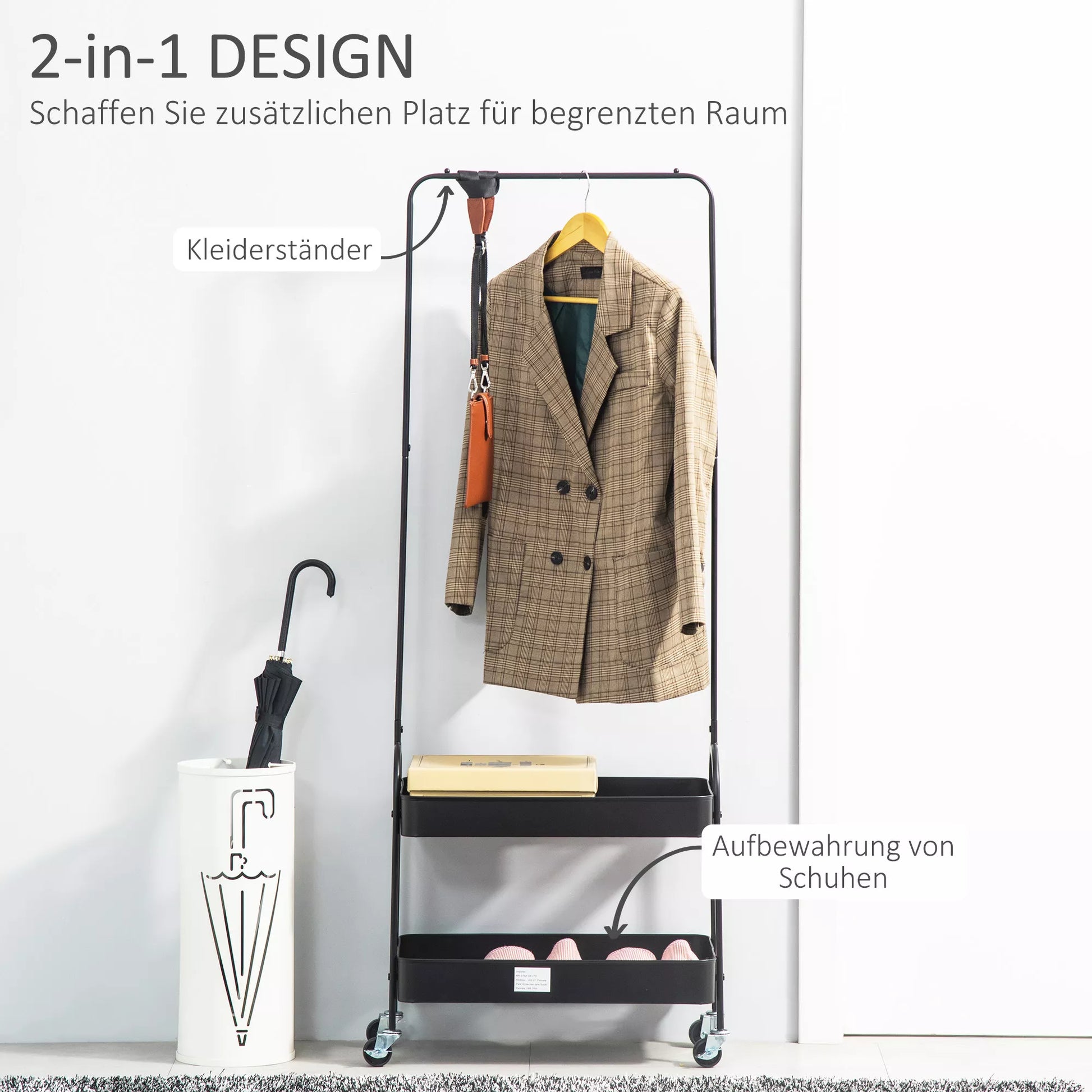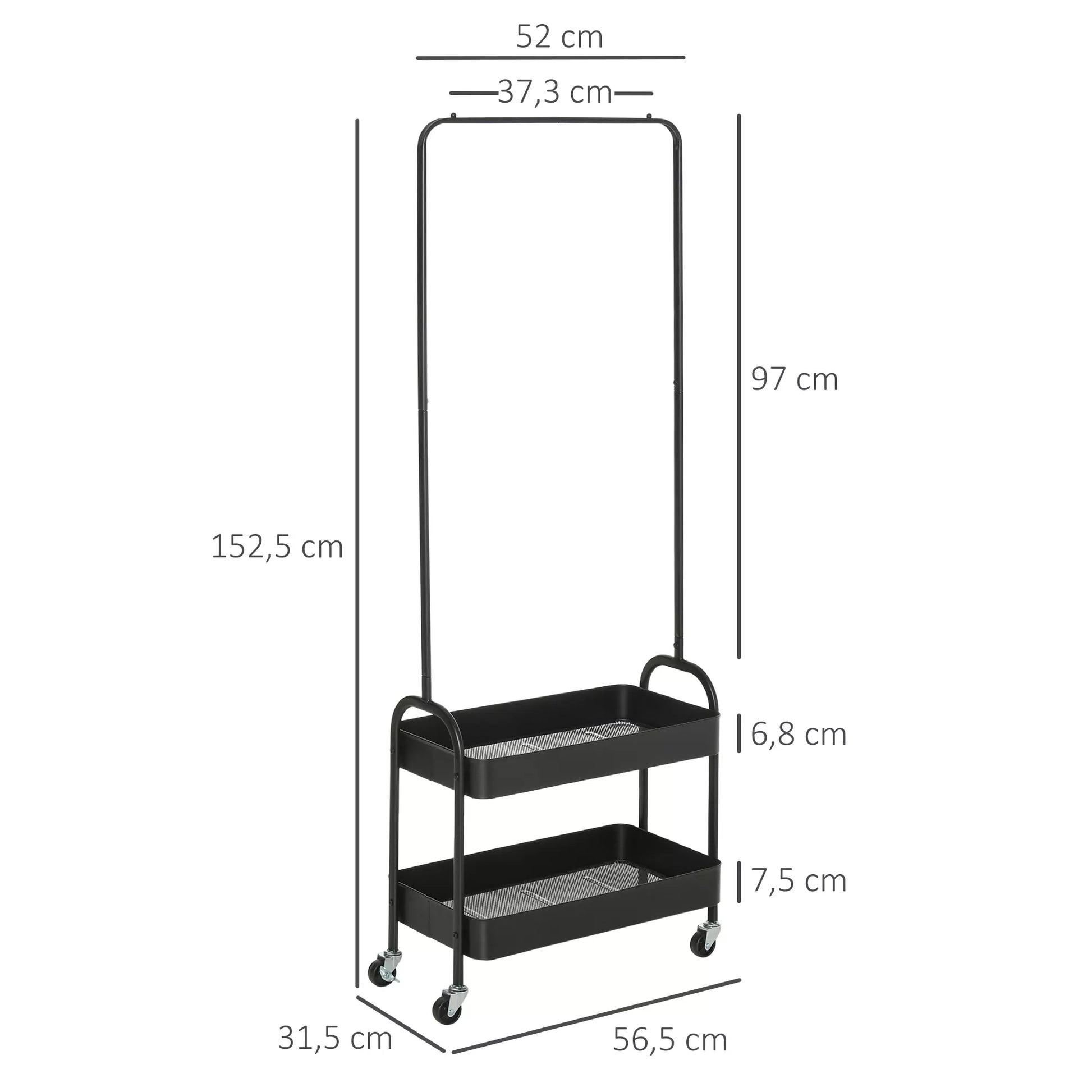Metalinė drabužių kabykla su batų lentyna, ant ratukų, pastatoma, juoda
