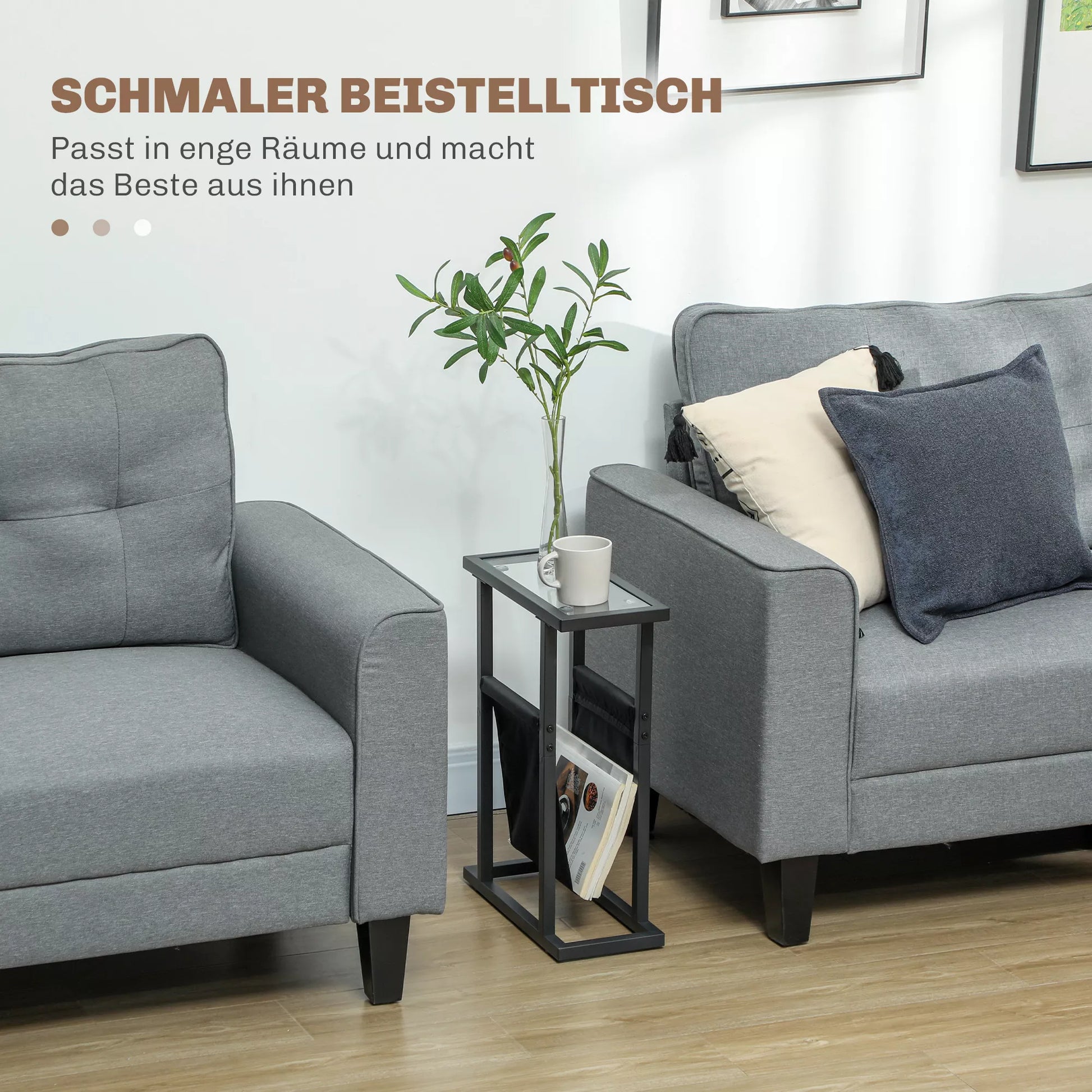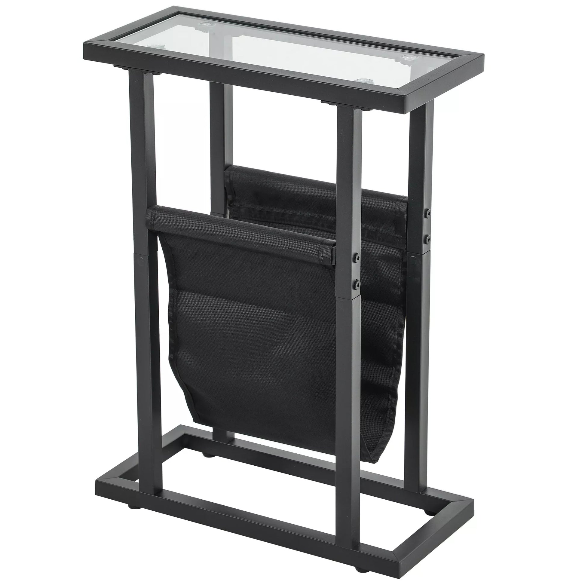 Pagalbinis metalinis staliukas su medžiaginiu skyriumi ir stikliniu paviršiumi, siauras staliukas svetainei, miegamajam, juodas