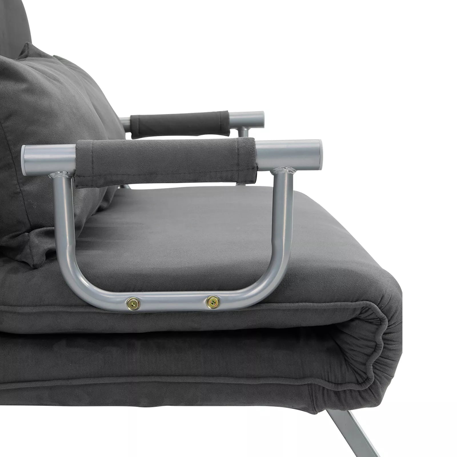 Miegamoji sofa-lova su reguliuojama atlošimo funkcija, dekoratyvinėmis pagalvėlėmis, sofa su miegojimo funkcija, aksomo išvaizda, porankiais, svečių lova, sulankstoma kėdė svetainei, miegamajam, pilka