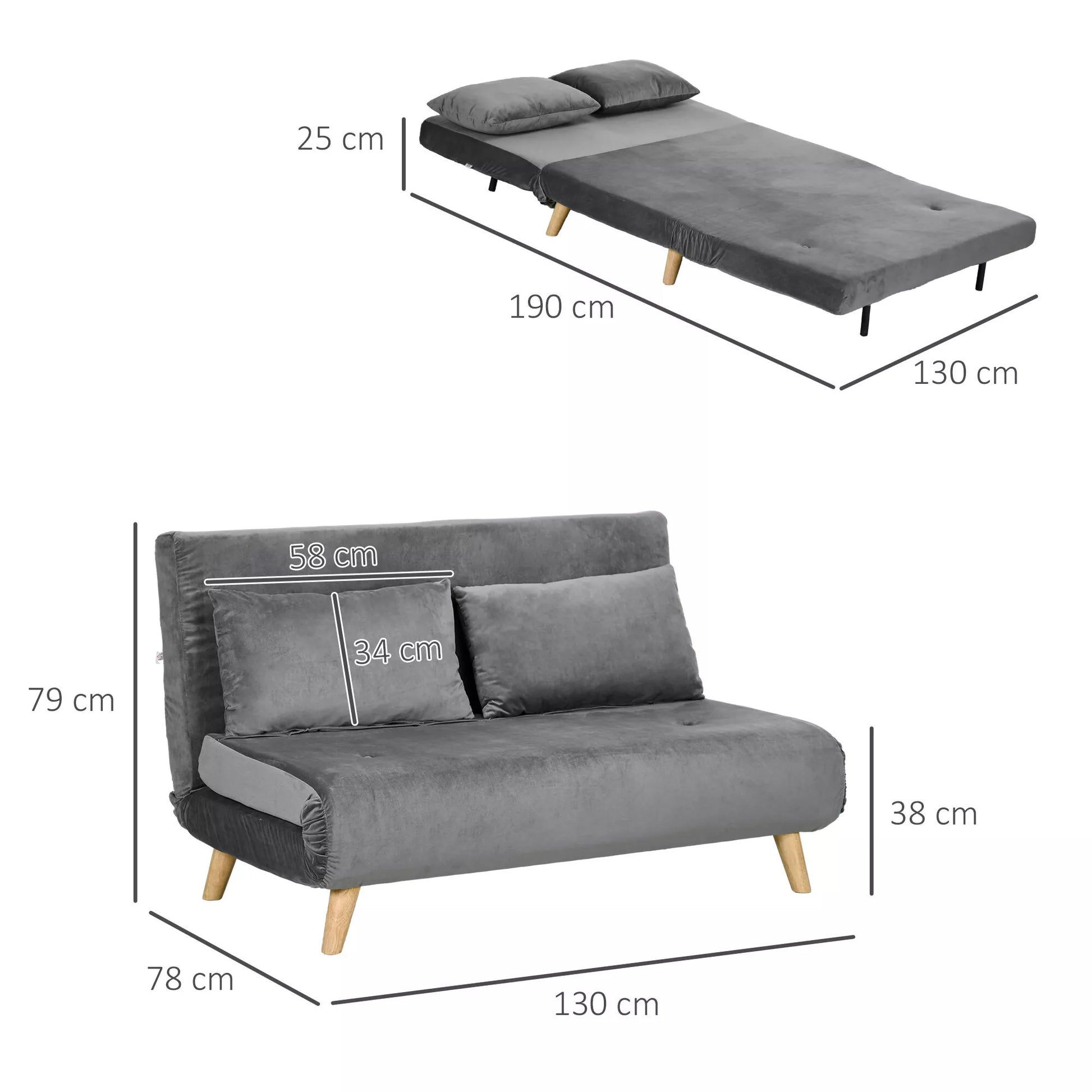 Miegamoji sofa-lova, poilsio sofa, su 2 pagalvėlėmis, aksomo išvaizda, 130 x 78 x 79 cm, pilka