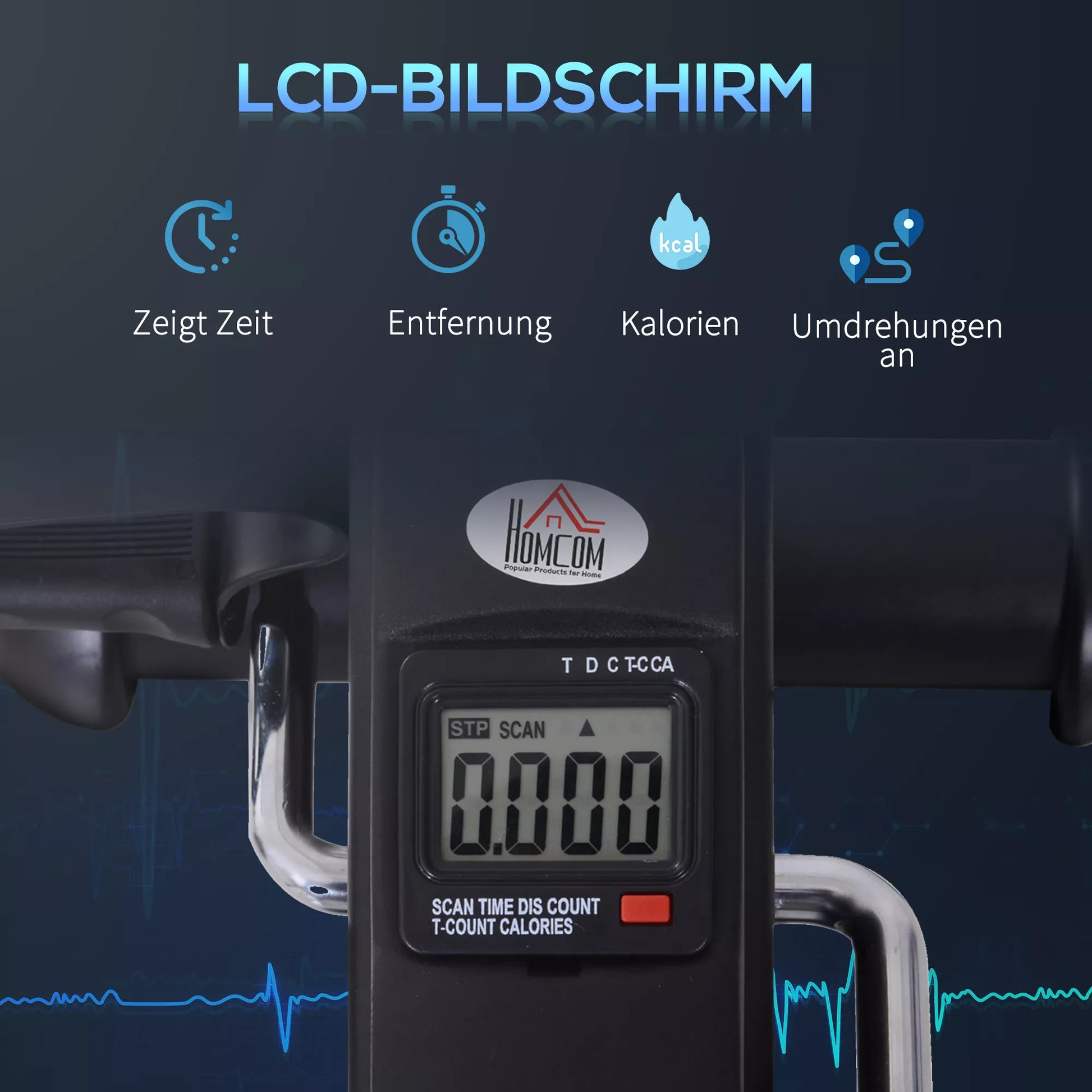 - ✔ Didelis LCD ekranas, rodantis laiką, atstumą, apsukų skaičių ir sudegintas kalorijas