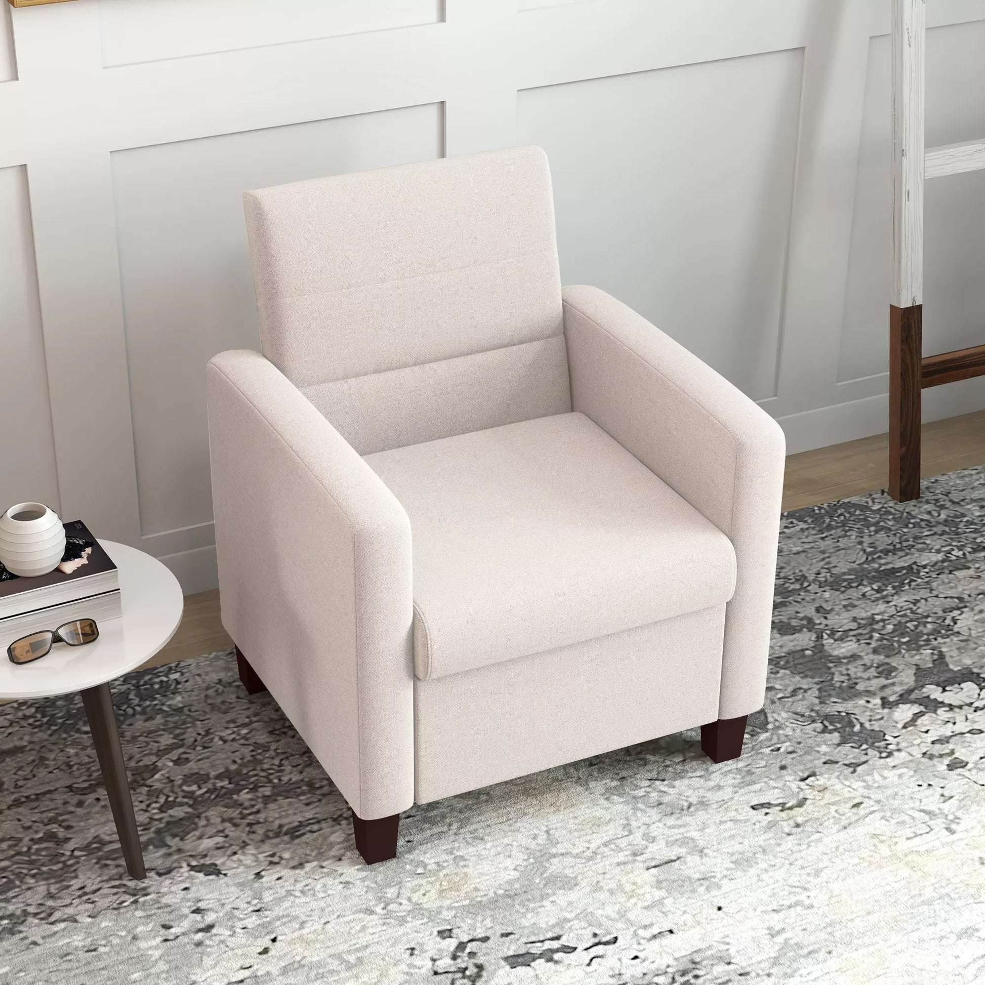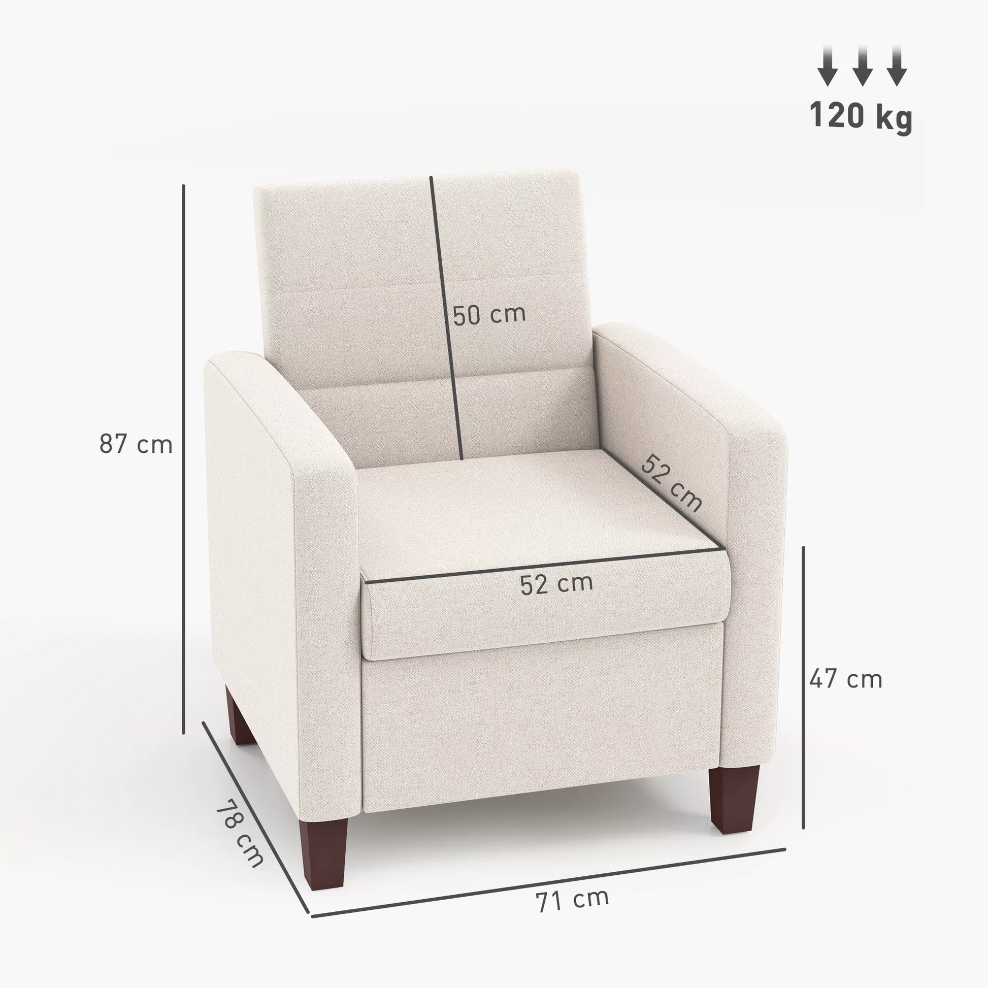Minkštas krėslas su lino audinio išvaizda, porolono užpildu, sėdimąja pagalvėle ir mediniu rėmu, kreminės baltos spalvos
