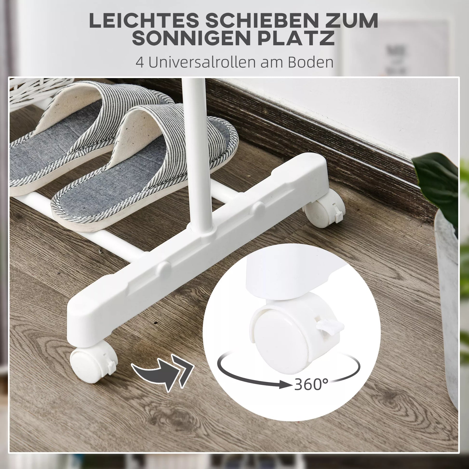 - ✔ 4 balti PP ratukai žymiai palengvina drabužių stovo perkėlimą iš vienos patalpos į kitą. Du iš šių ratukų yra su stabdžiais, kad galėtumėte jį sustabdyti, kai nenorite jo perkelti