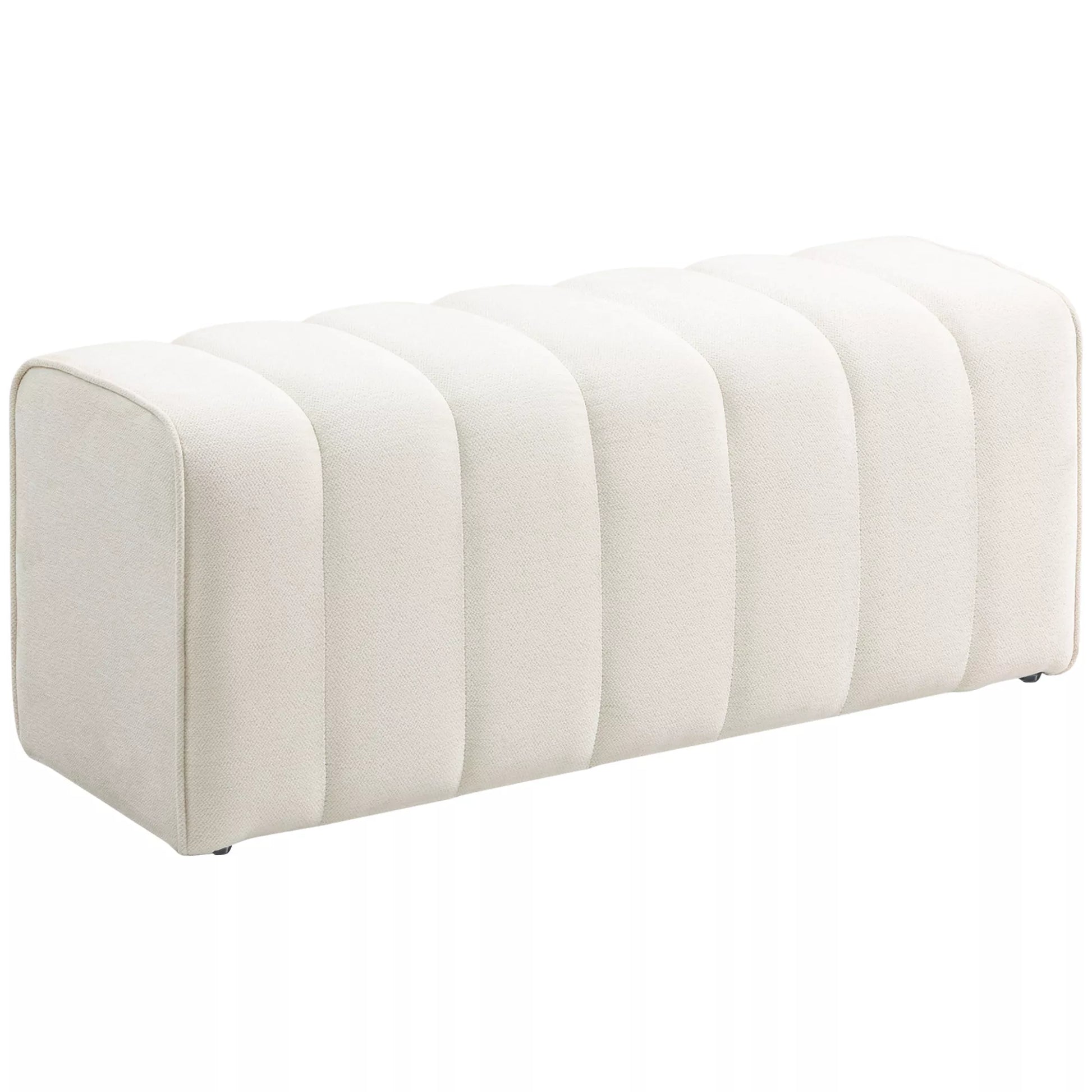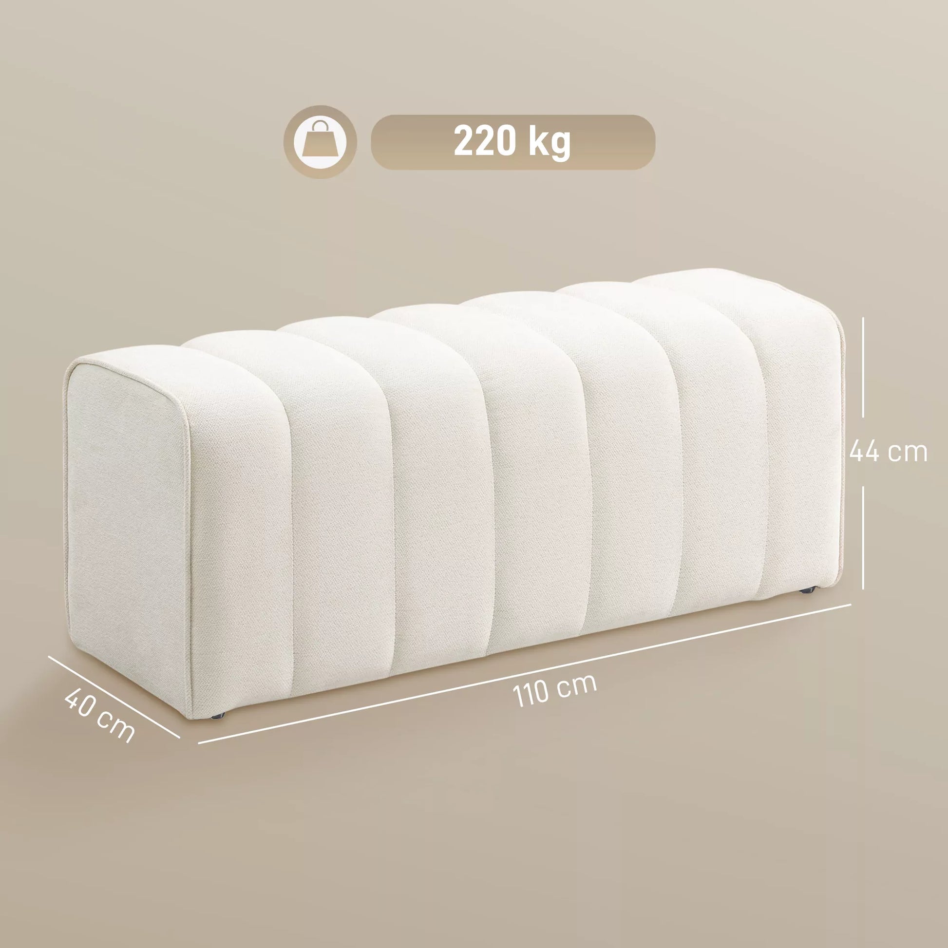 Modernus miegamojo suoliukas, minkštas suoliukas su mediniu rėmu, atlaiko iki 220 kg, su kojų atrama, kreminės baltos spalvos.