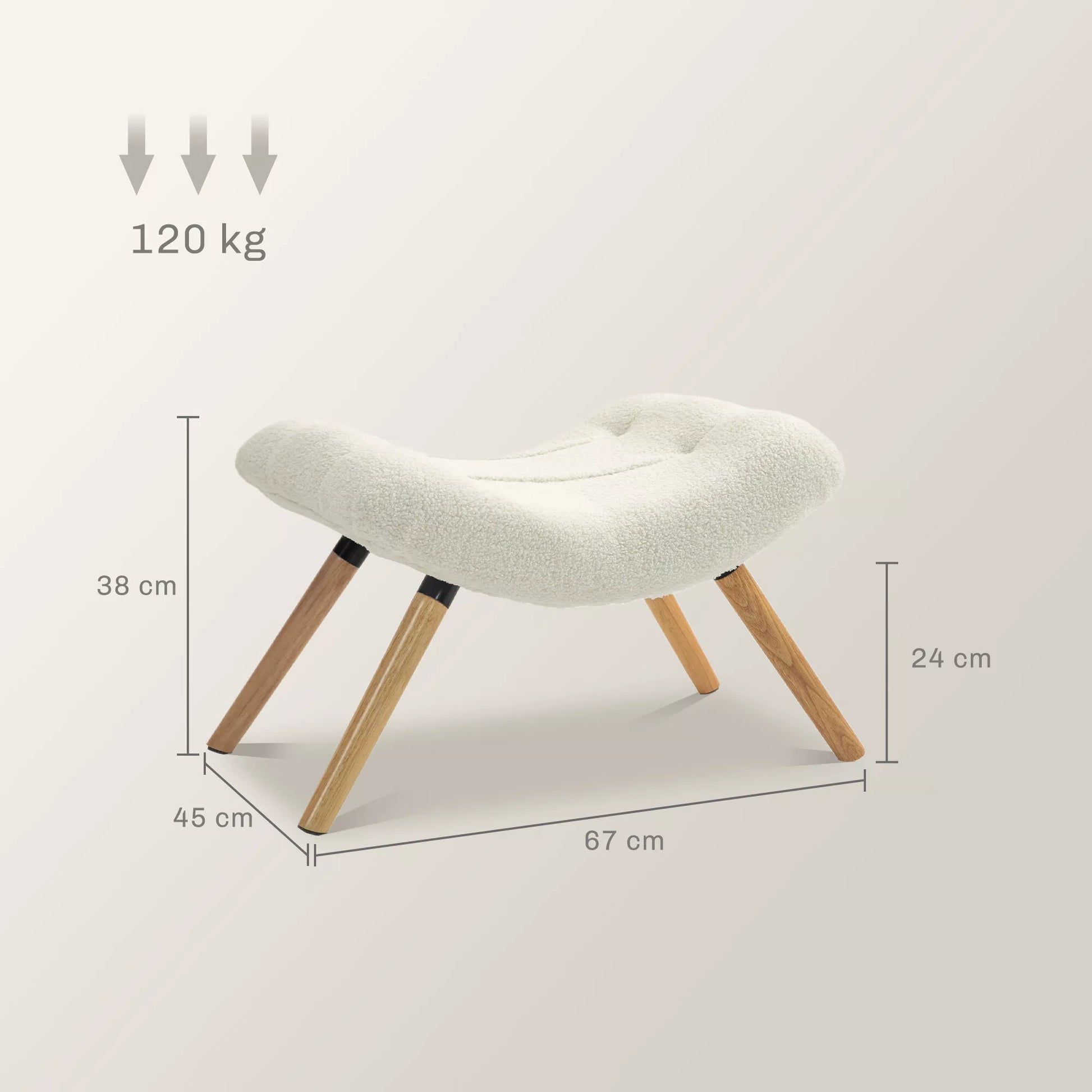 Modernus minkštas pufas su vilnos užvalkalu ir medinėmis kojomis, skirtas svetainei, miegamajam, koridoriui, kreminės baltos spalvos