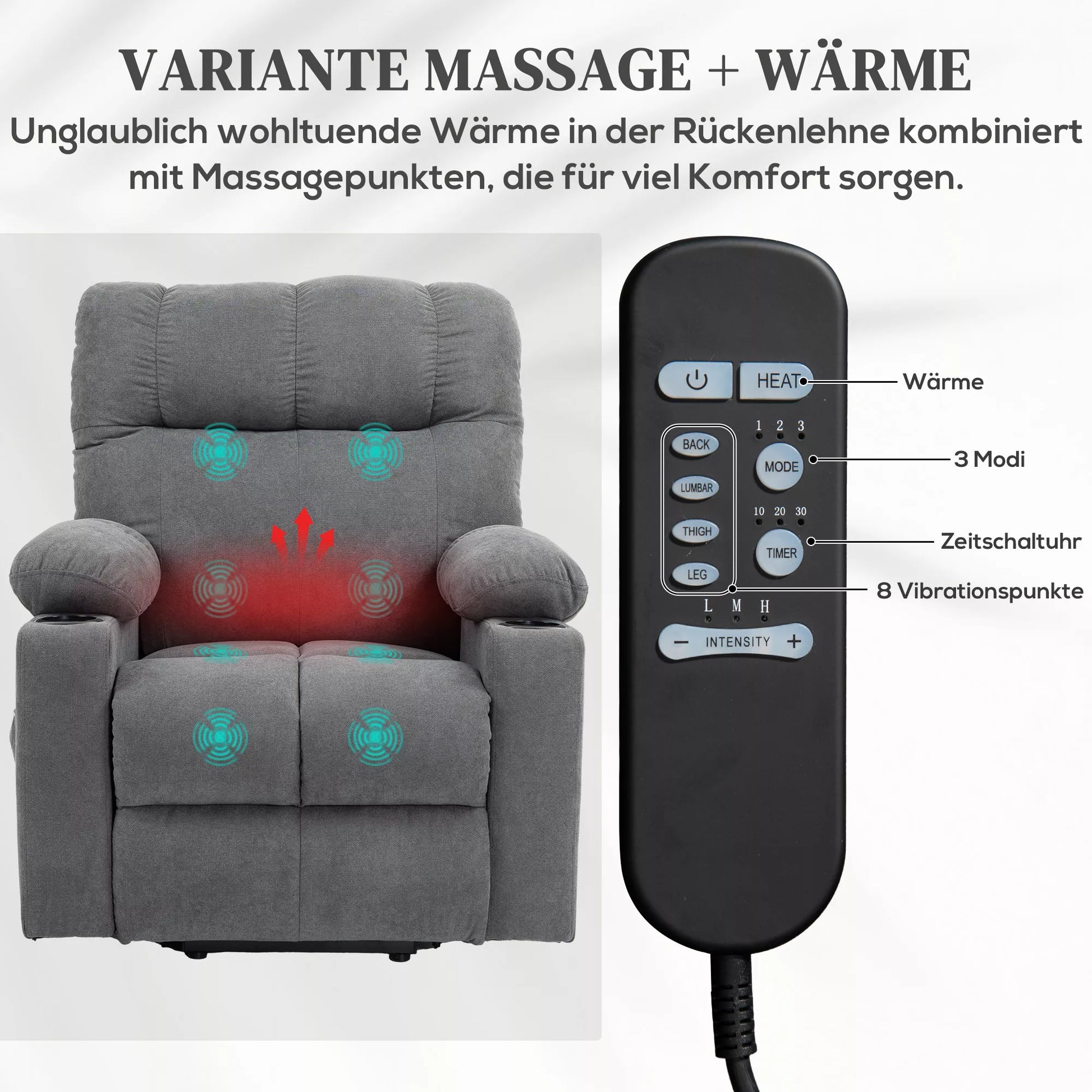 - ✔ Aštuoni vibracijos masažo taškai, trys režimai. Juosmens šildymas