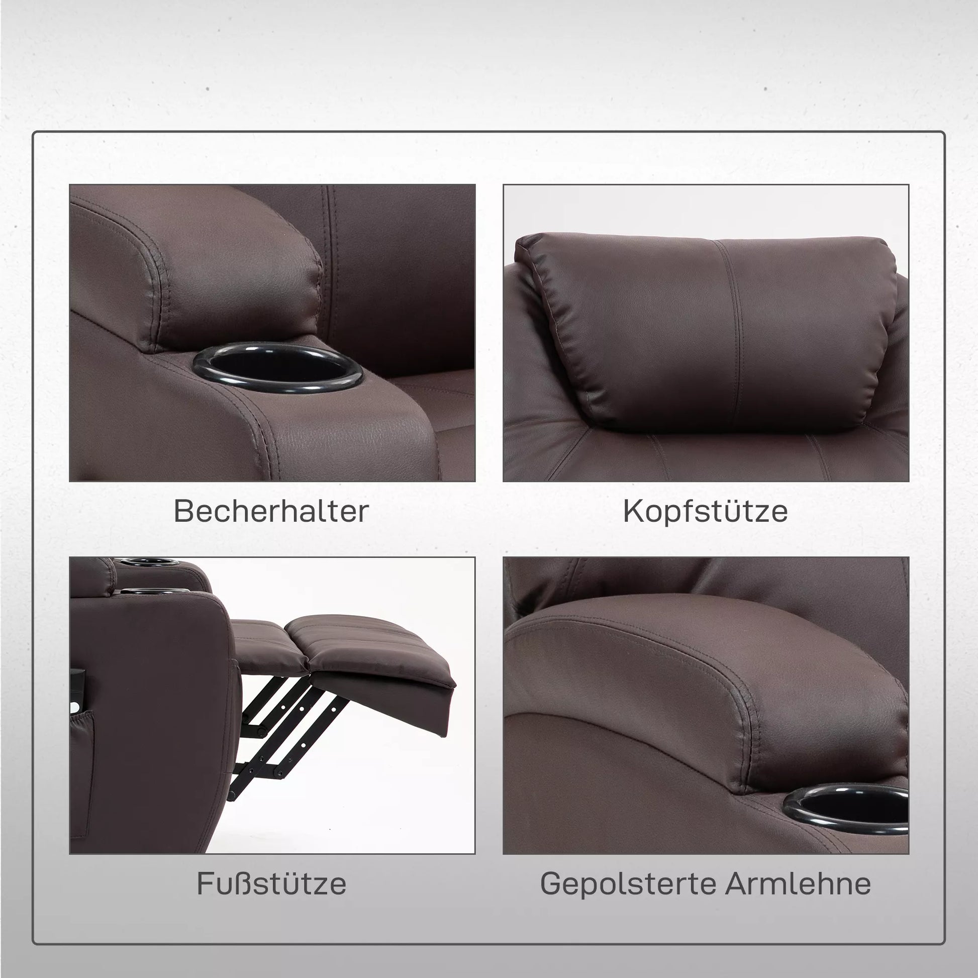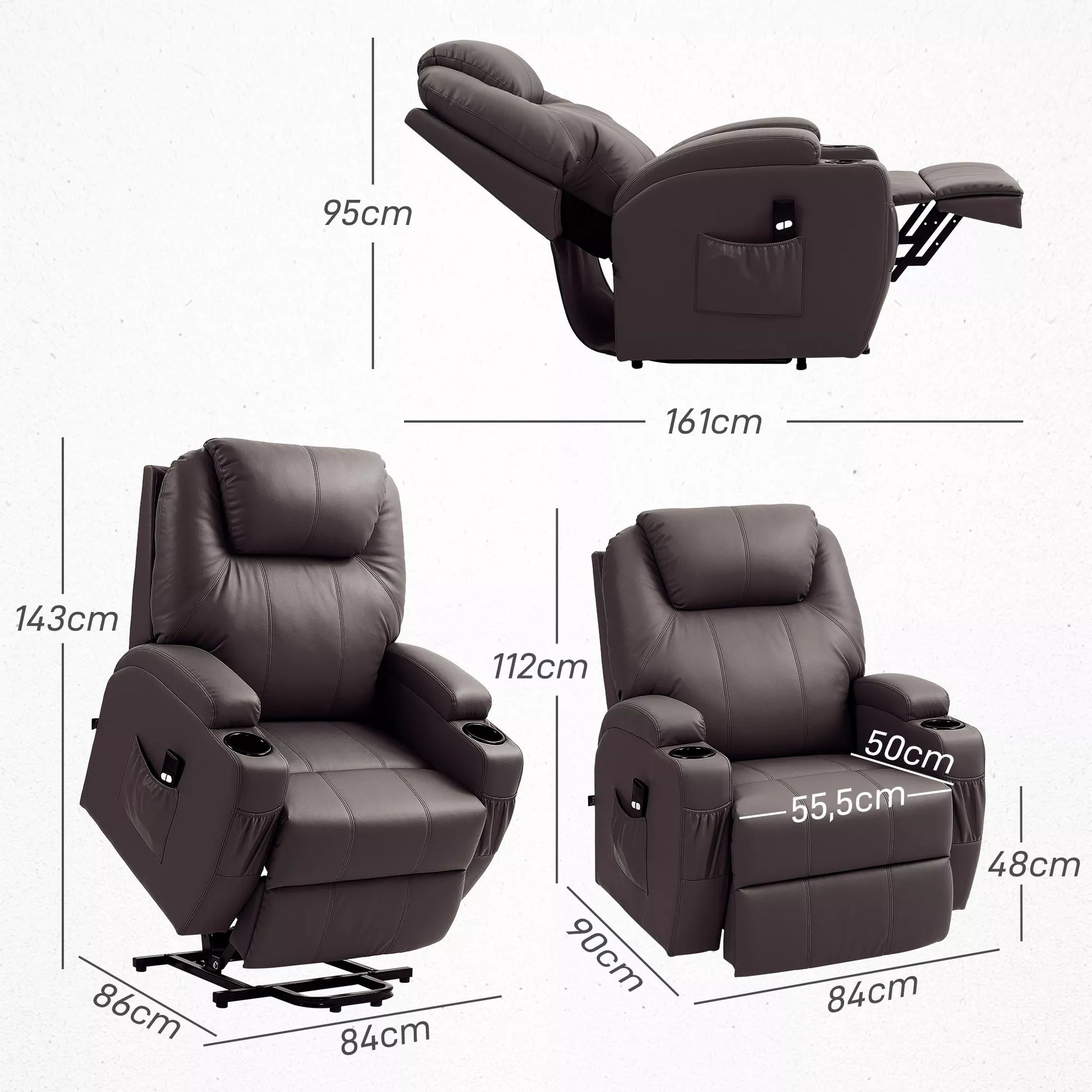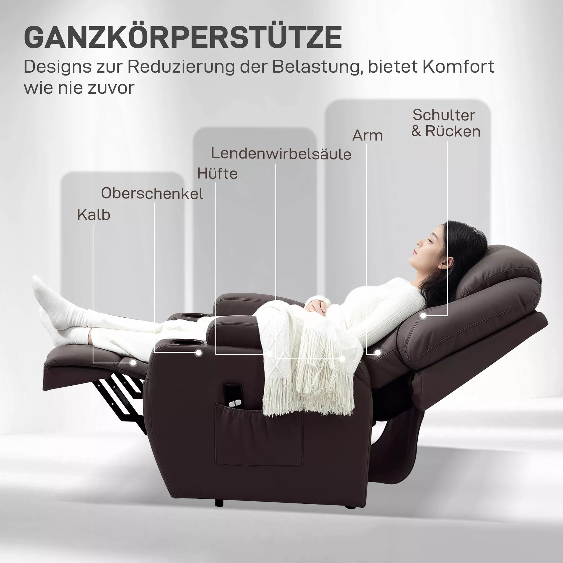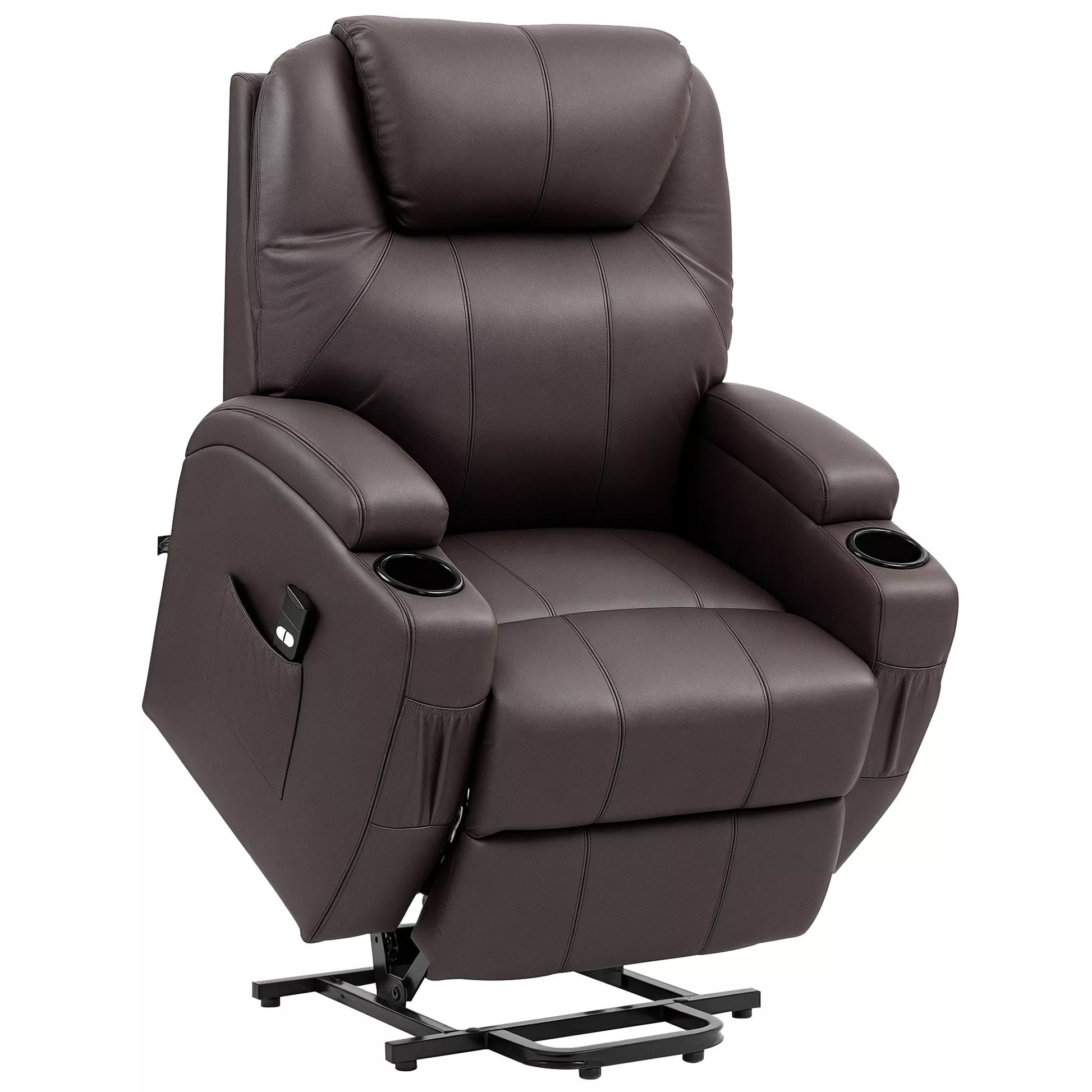 Pakeliamasis krėslas, krėslas-relaksas su pakėlimo funkcija, su nuotolinio valdymo pulteliu, puodelio laikikliu, reguliuojama atlošo atrama, rudos spalvos