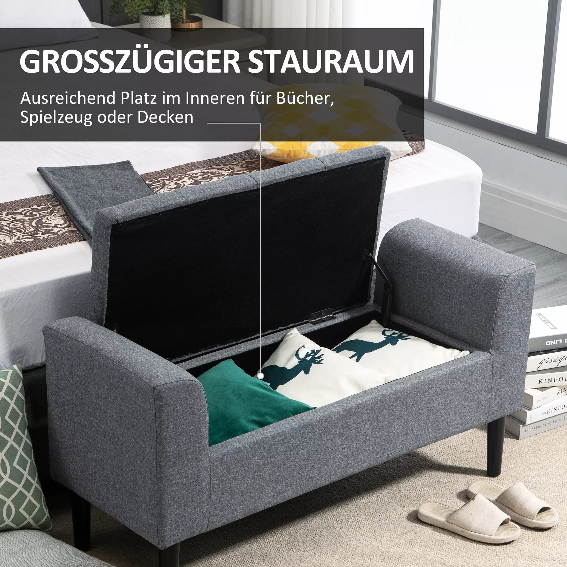 Sėdynė su daiktadėže, paminkštinta sėdynė, atlaiko iki 130 kg, lininė išvaizda, kaučiukmedžio mediena, 116 x 44 x 58 cm, šviesiai pilka