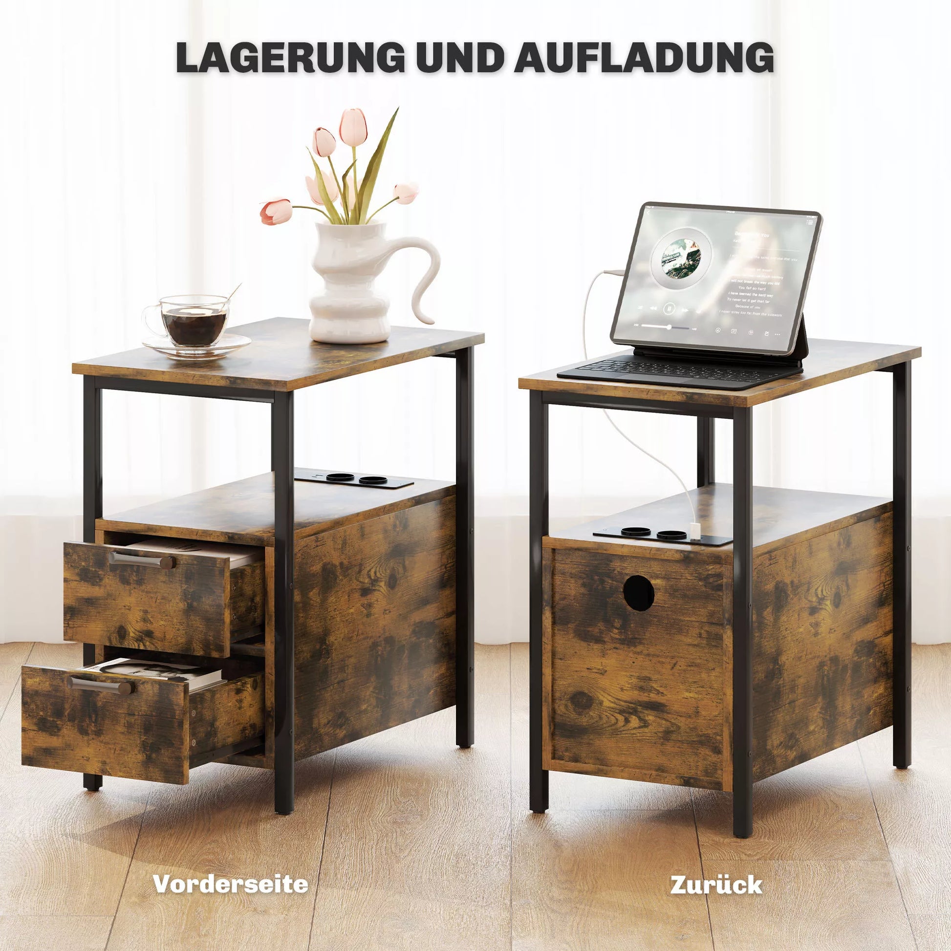 Pagalbinis staliukas su įkrovimo stotele, USB jungtimis, rozetėmis, 2 stalčiais ir lentynėle, skirtas svetainei, miegamajam