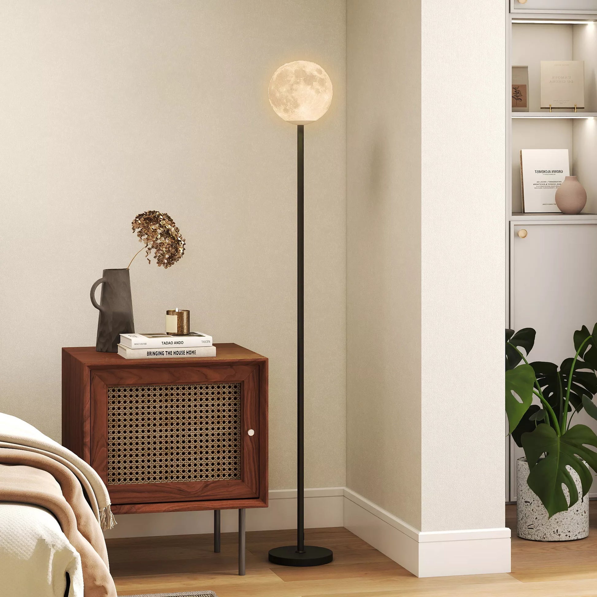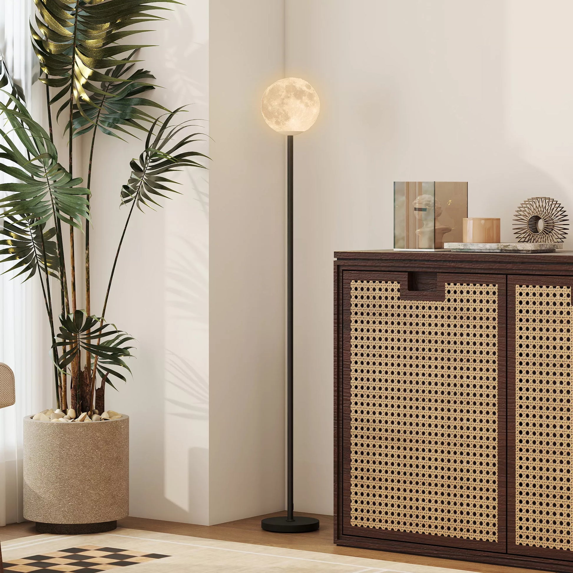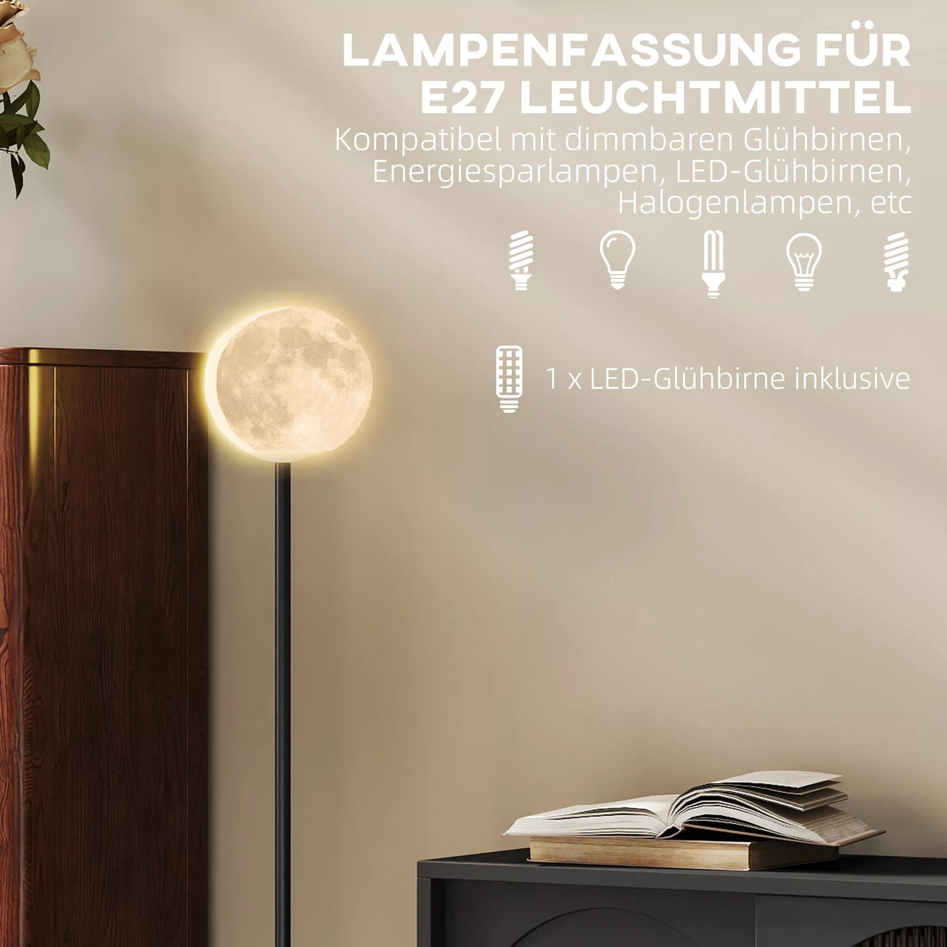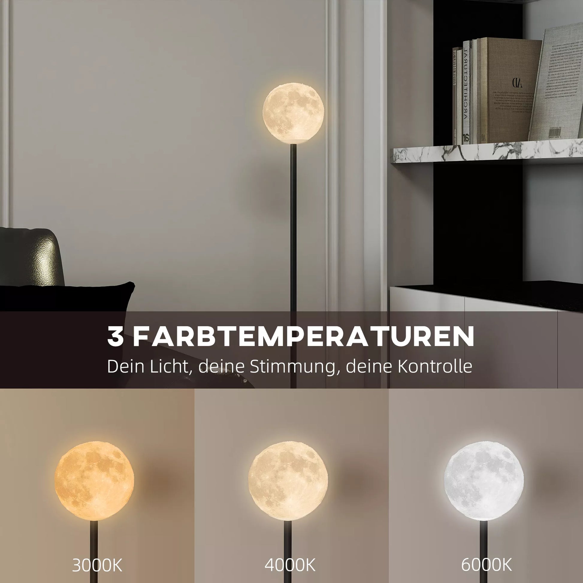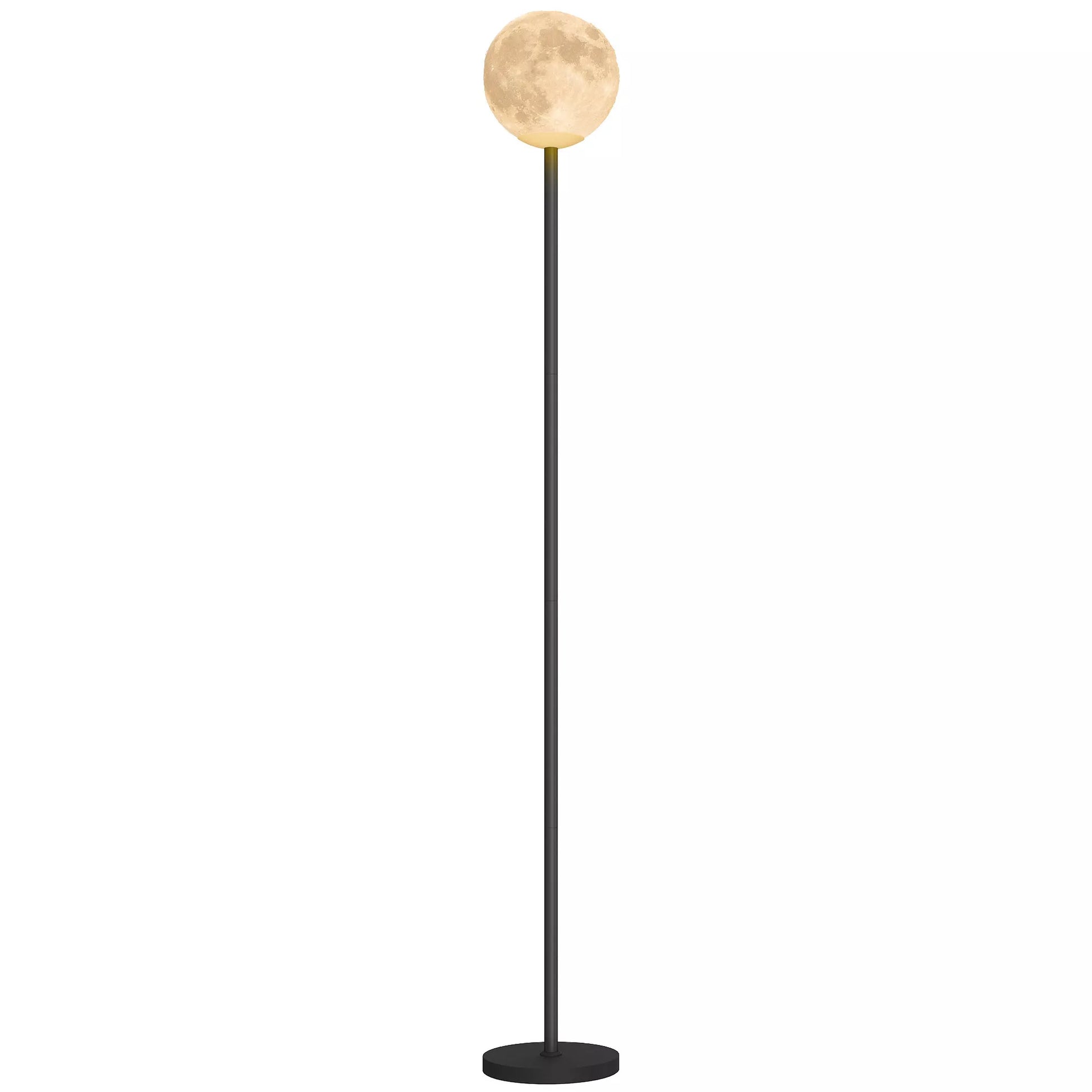 Pastatomas šviestuvas su mėnulio dizaino gaubtu, kojiniu jungikliu, 3 spalvų temperatūromis, metalas, juodas