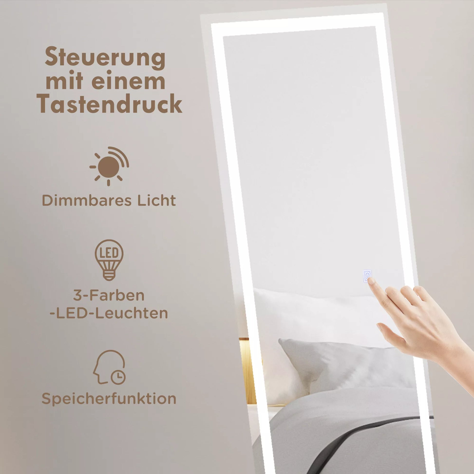Pastatomas veidrodis, sieninis veidrodis, pilno kūno veidrodis, su LED apšvietimu, 40 cm x 150 cm, Baltas + Sidabrinis