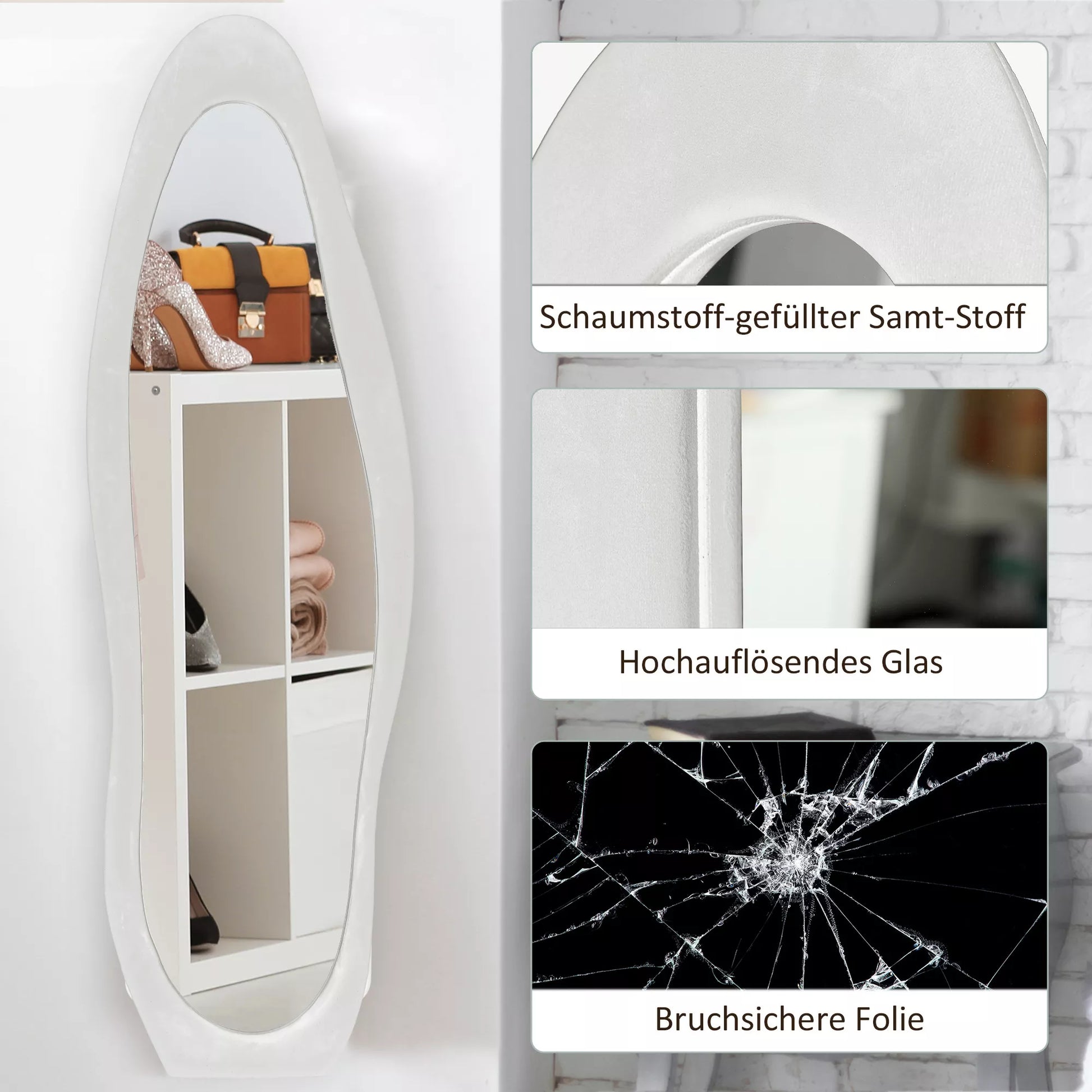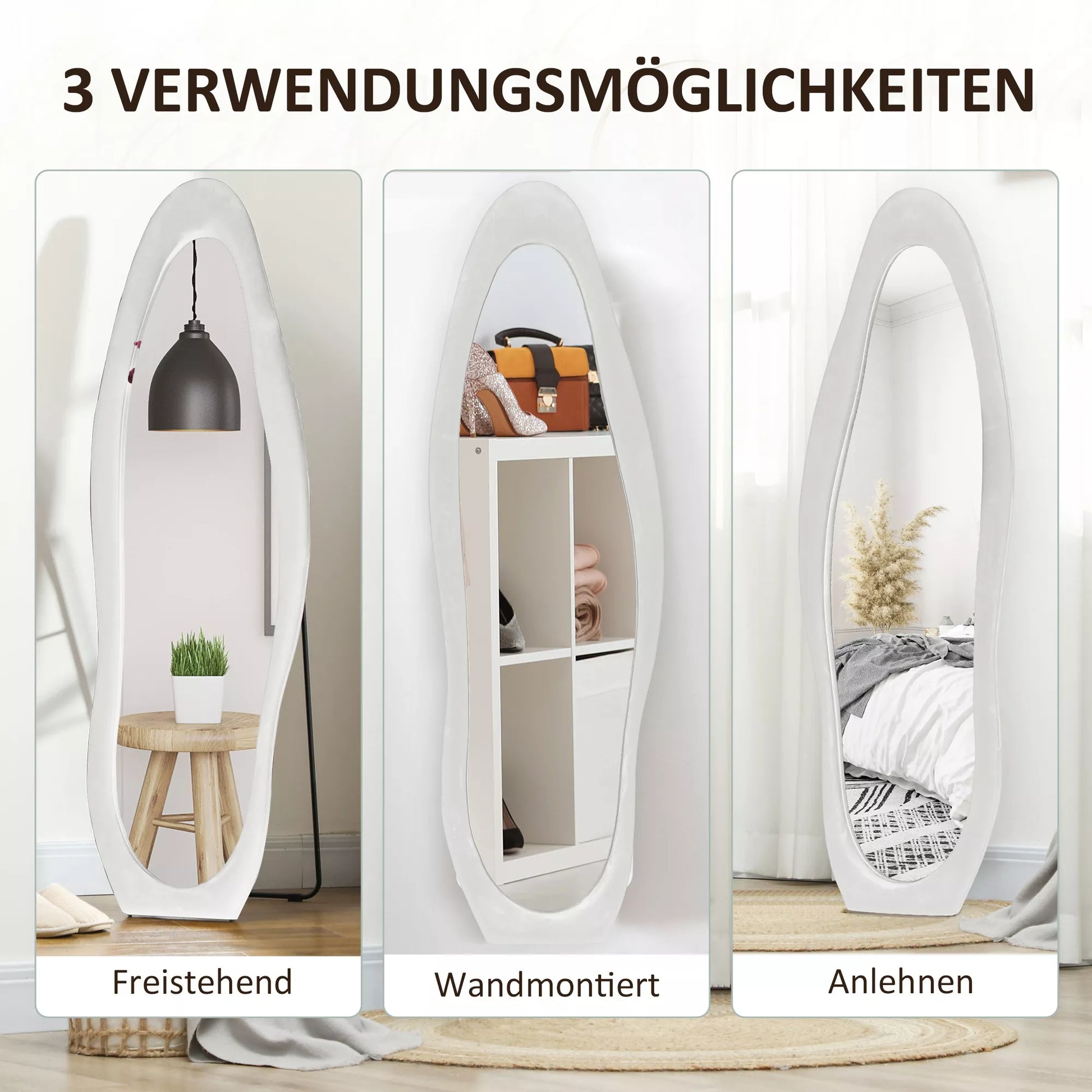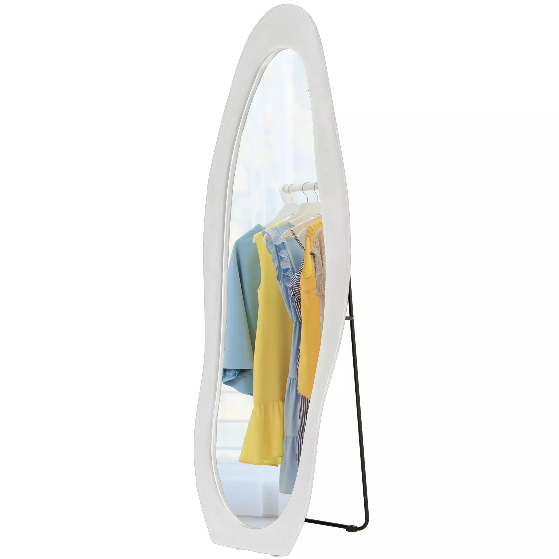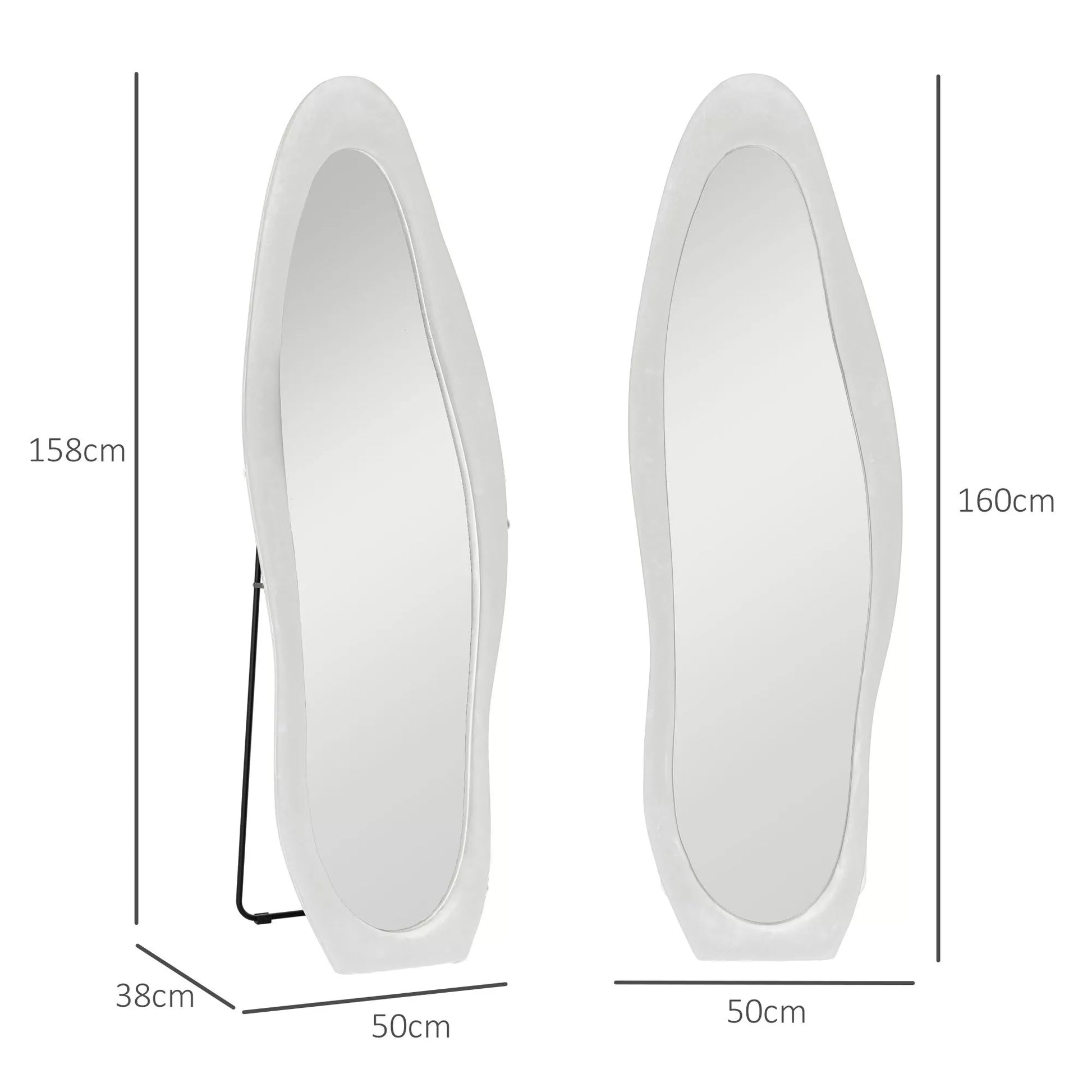 Viso kūno veidrodis, banguotos formos, 160 x 50 cm, laisvai pastatomas, aksominio stiliaus rėmo apdaila, tinka miegamajam, svetainei, baltas