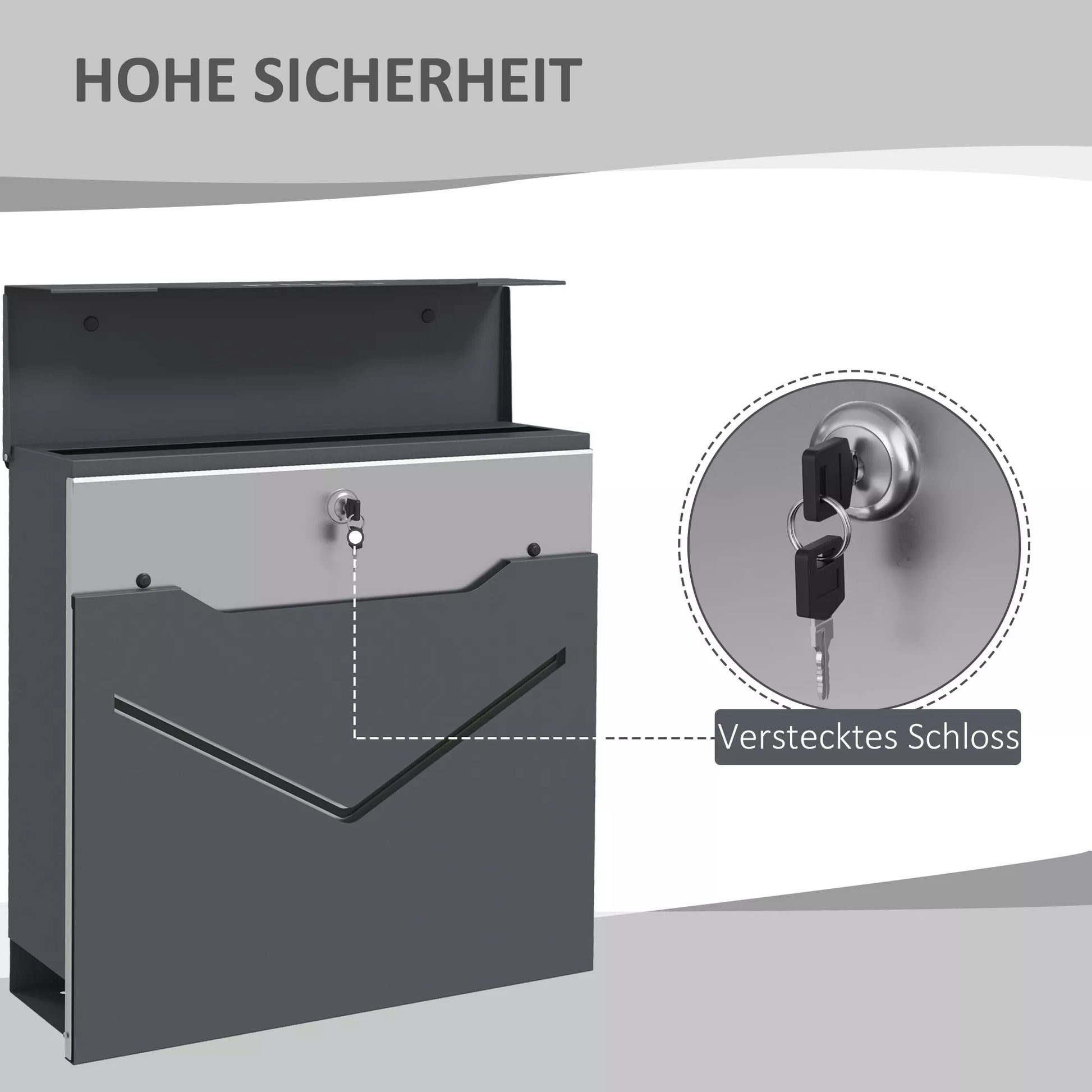 Gaukite savo paštą saugiai ir stilingai su šia pašto dėžute. Pagaminta iš tvirto plieno, konstrukcija yra stabili ir ilgaamžė – tinkama naudoti lauke. 34 cm ilgio anga palengvina laiškų įdėjimą. Ji taip pat yra saugi ir apsaugota: užrakinamas dizainas suteikia jums ramybę, kad tik jūs galėsite pasiekti savo paštą. Be to, pašto dėžutė pagražins jūsų namų prieangį.