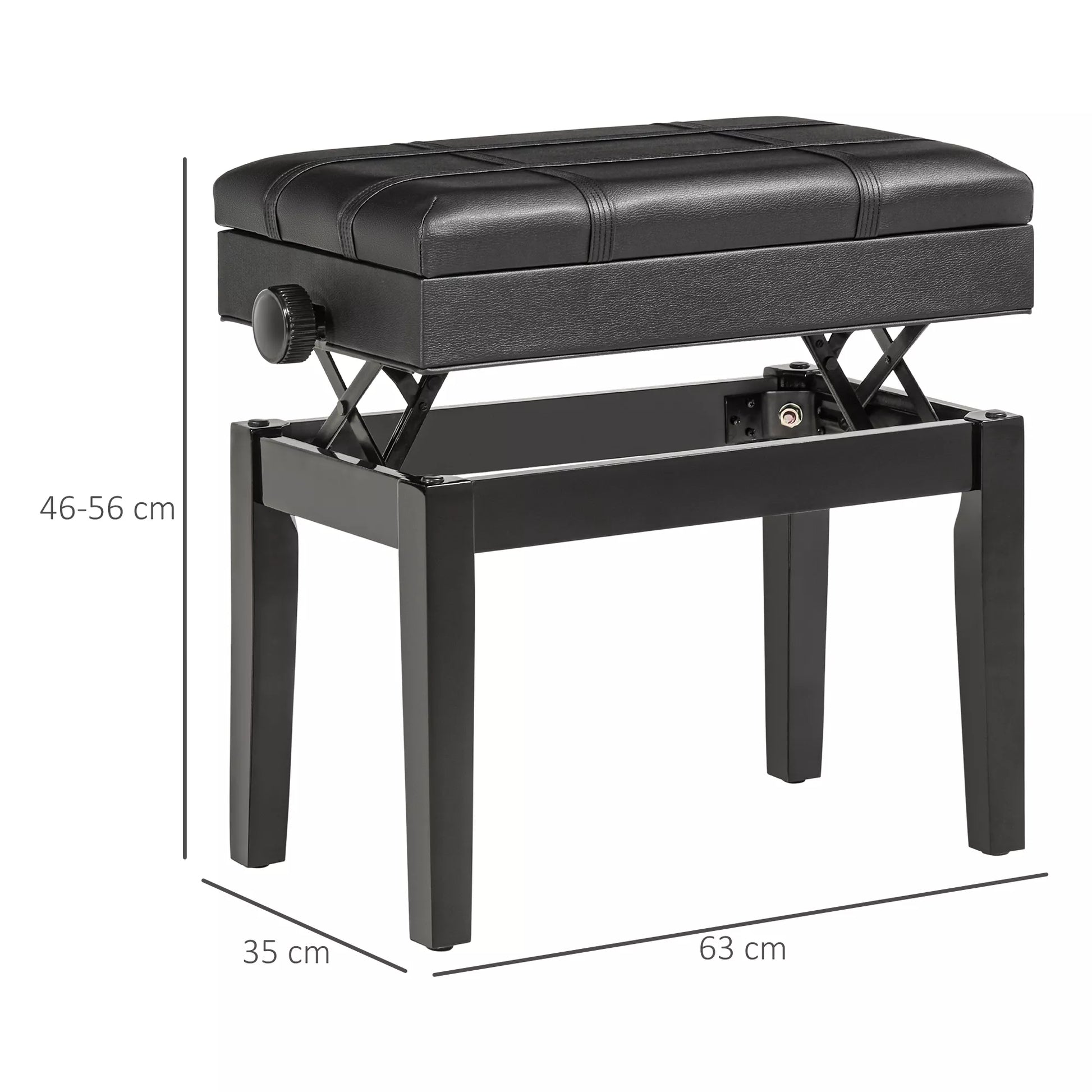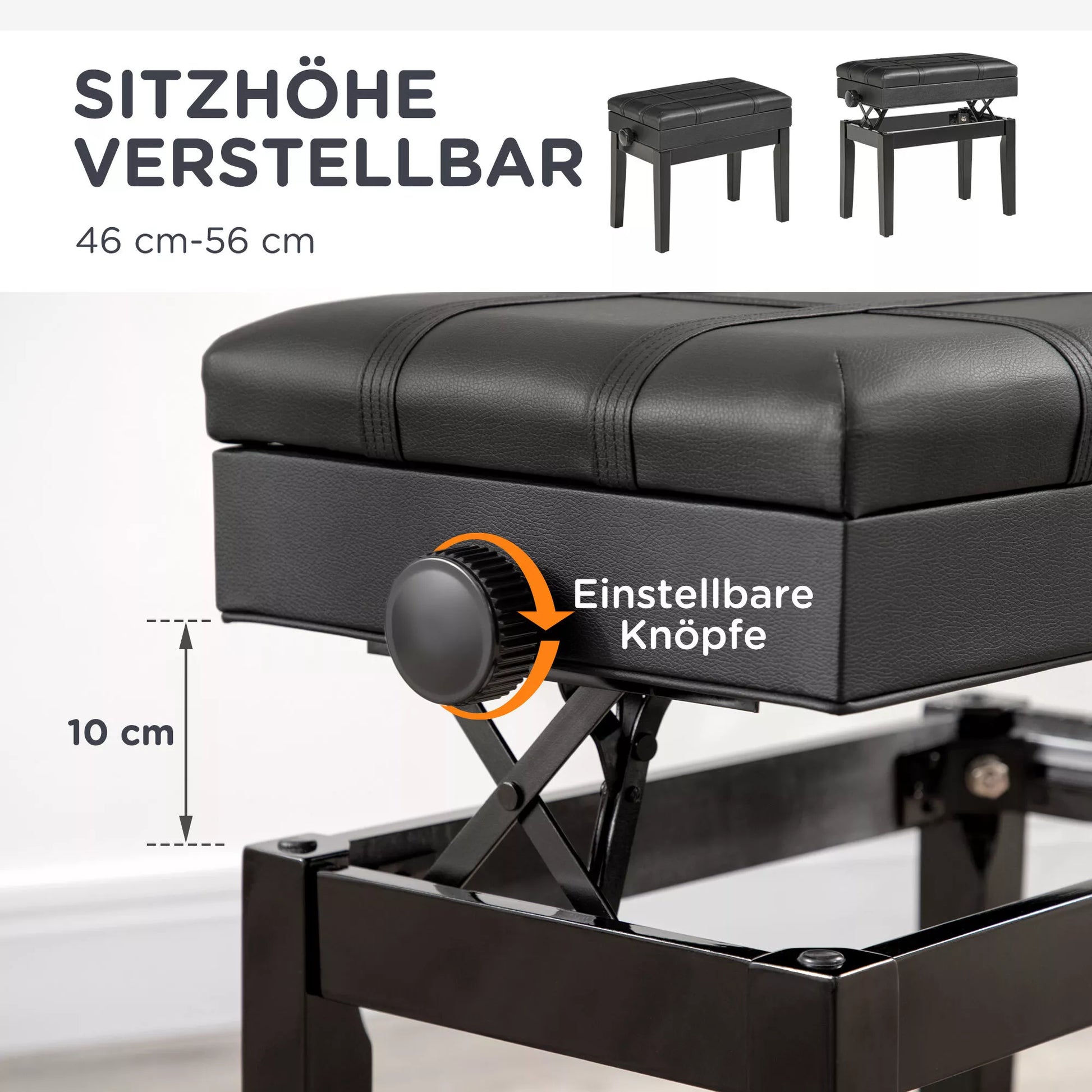 - ✔ Sėdynės aukštis reguliuojamas nuo 46 iki 56 cm, todėl tinka bet kokiam ūgiui ir bet kuriam pianinui
