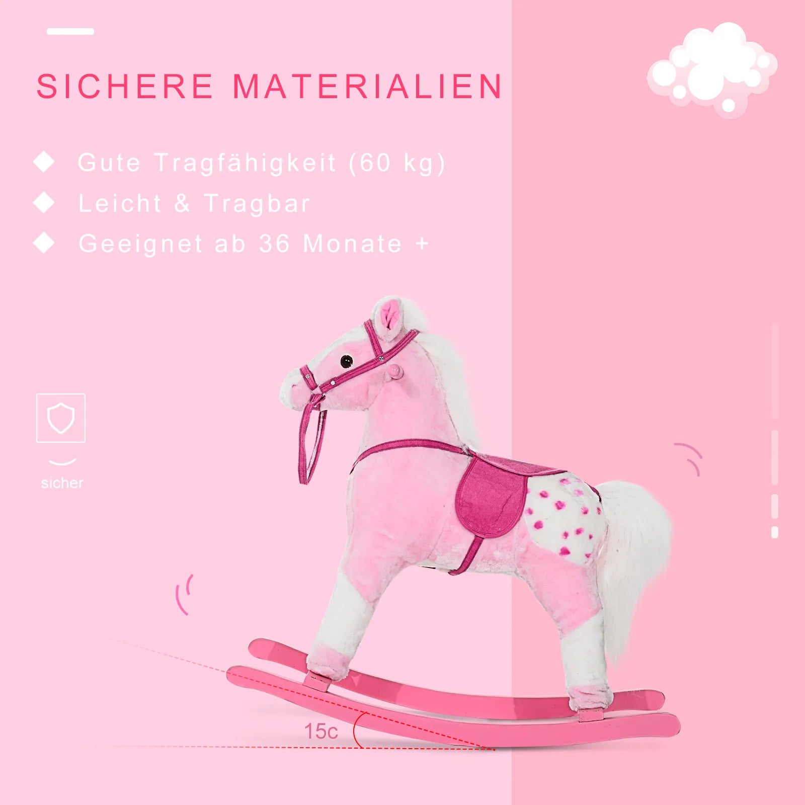 „Iiii-aaa!“, girdisi iš vaikų kambario! Saugiai atsisėdęs balne, Jūsų vaikas ir jo ištikimas supamas arkliukas leidžiasi į jaudinančius nuotykius. Kad net ir audringiausių supimosi nuotykių metu nieko nenutiktų, mūsų supamųjų arkliukų slydimo kreivės yra užapvalintos. Ekologiška tuopos mediena yra šviesi ir ilgaamžė. O kad sukimasis ilgai teiktų džiaugsmo, kailis yra pagamintas iš minkšto pliušo. Jis ne tik ypač saugus nuo traumų, bet ir puikiai tinka glostymui!