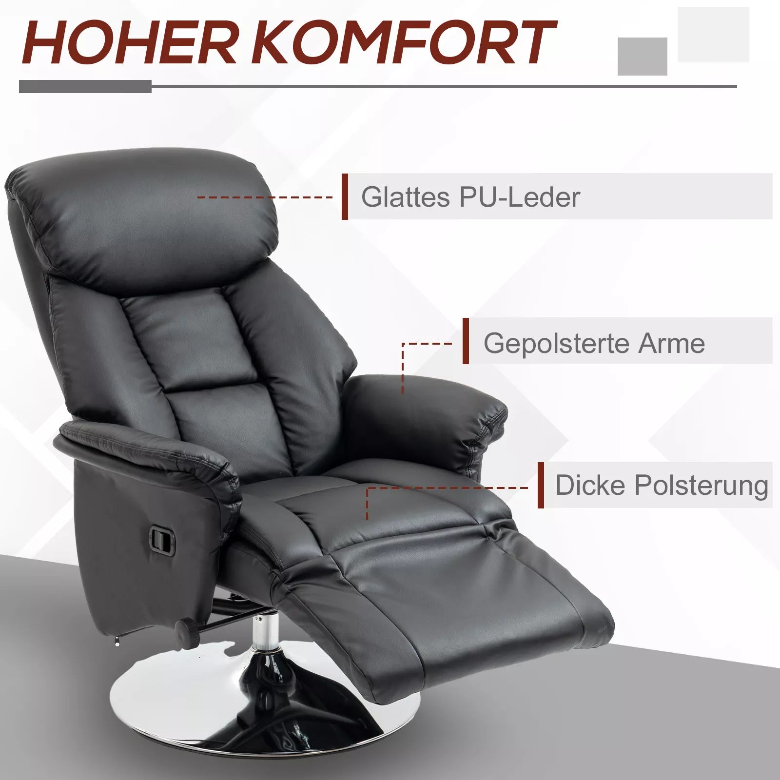 Atraskite savo naująjį komforto centrą su šia poilsio kėde! Po ilgos dienos ši stilinga poilsio kėdė suteiks Jums didžiausią komfortą, nes jos atlošas reguliuojamas iki 130°, sėdynė sukasi 360°, o kojų atrama yra reguliuojama. Pamirškite kasdienius rūpesčius ir mėgaukitės giliausiu poilsiu. Lygus, lengvai prižiūrimas dirbtinės odos apmušalas ne tik atrodo itin elegantiškai, bet ir pasižymi švelniu, minkštu paviršiumi.