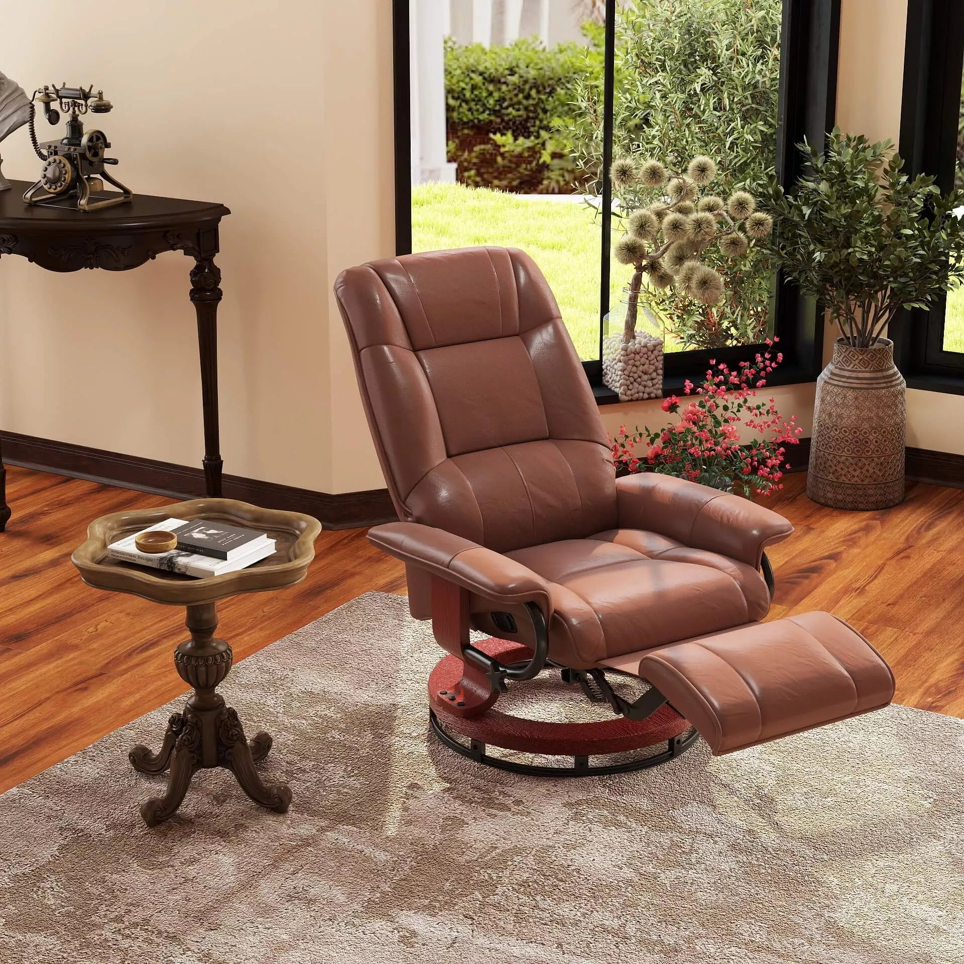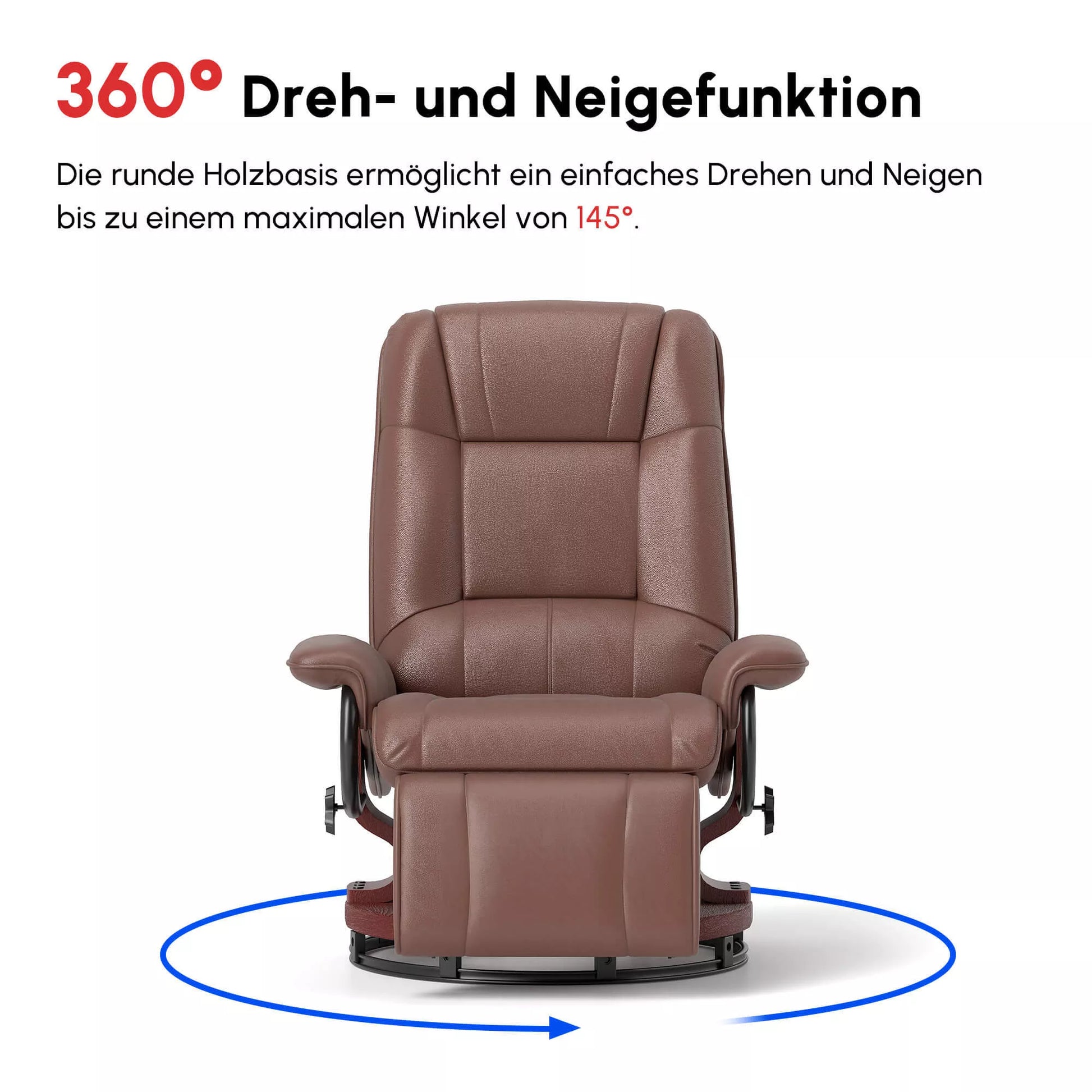 Atsipalaiduokite po sunkios dienos su šiuo relaksaciniu krėslu. Dėl 360° besisukančio pagrindo mėgaukitės visiškai judėjimo laisve, o tvirta medinė konstrukcija užtikrina stabilumą. Pilnas paminkštinimas suteikia didžiausią komfortą, o reguliuojama atlošas ir rankinis kojų atrama garantuoja visišką atsipalaidavimą. Elegantiškas dirbtinės odos užvalkalas tobulai derina grožį ir stilių. Pasilepinkite nusipelnytu prabangumu.