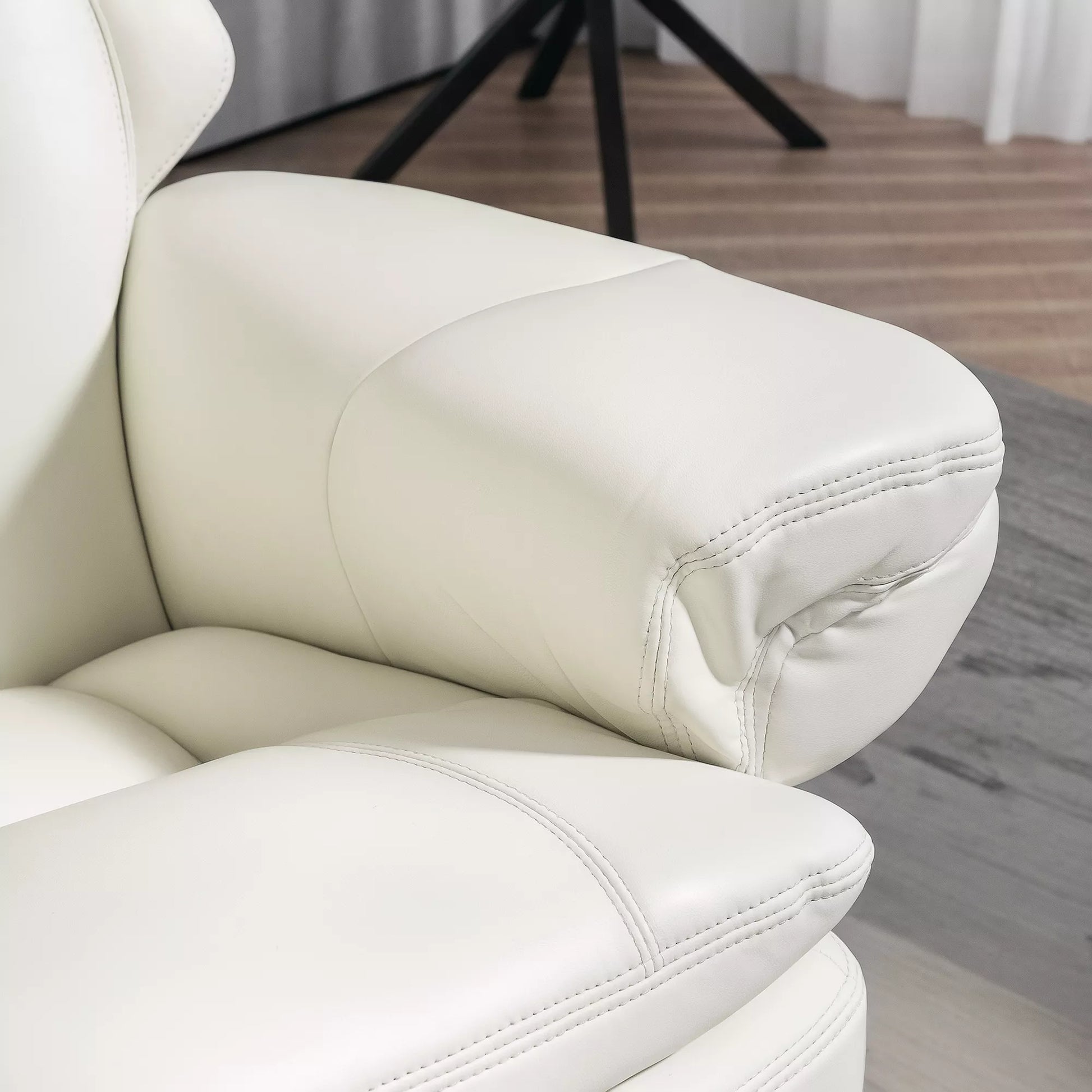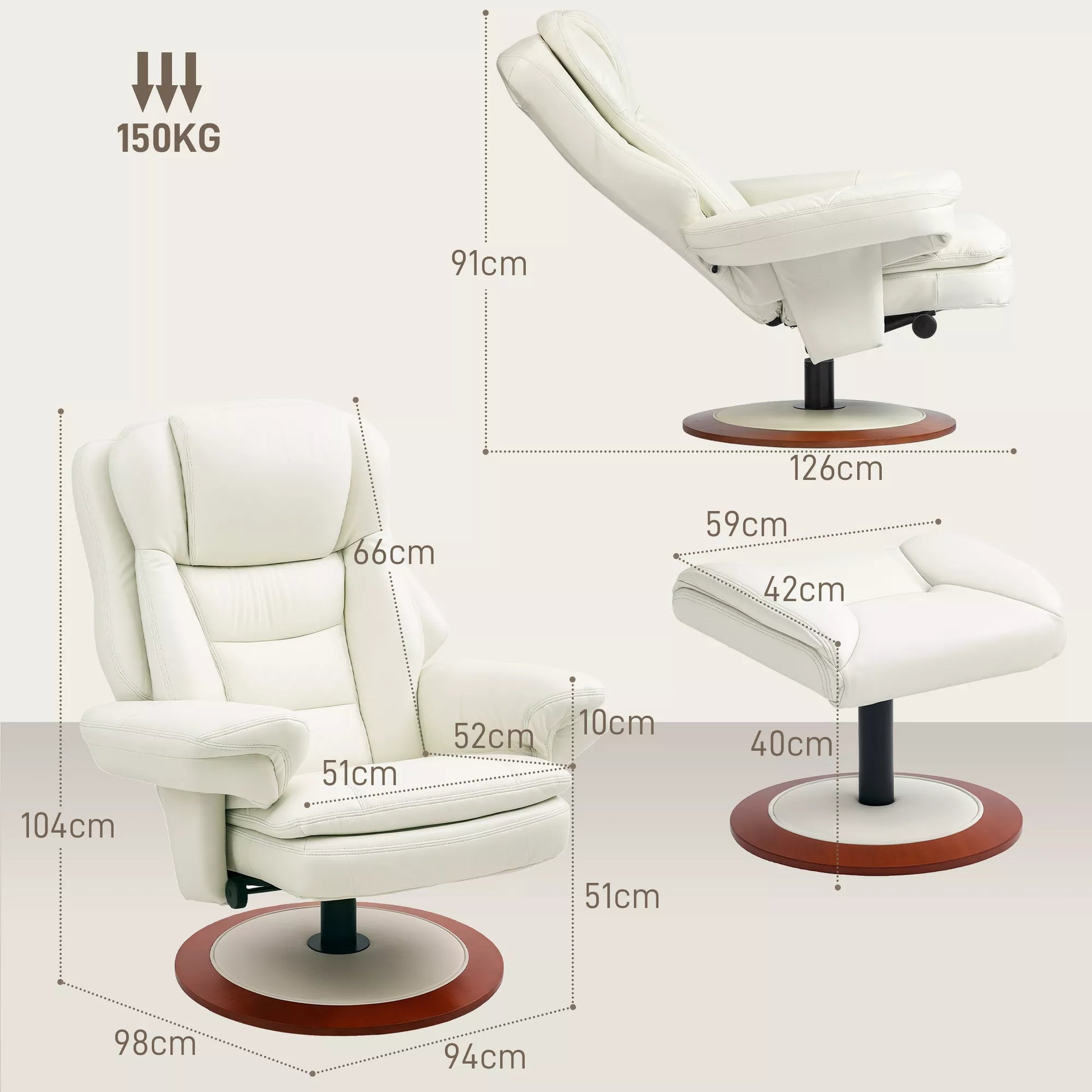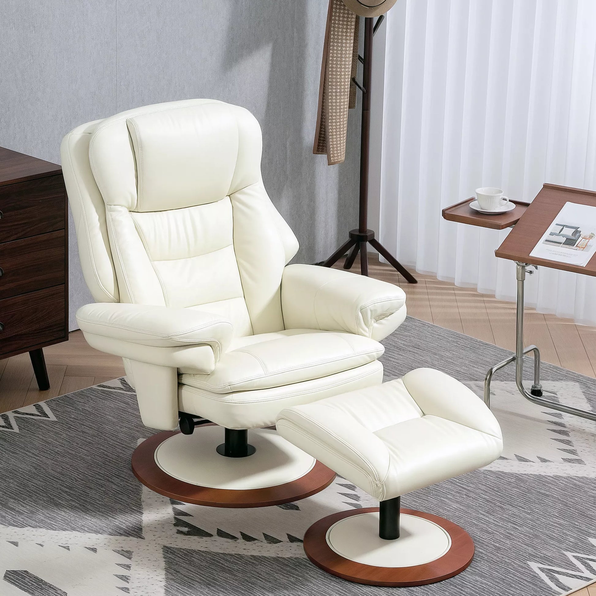 Masažinis fotelis su pakoja, atlošo atlenkimo funkcija, besisukantis TV fotelis su mediniu pagrindu, atlaiko iki 150 kg, dirbtinė oda, kreminės baltos spalvos