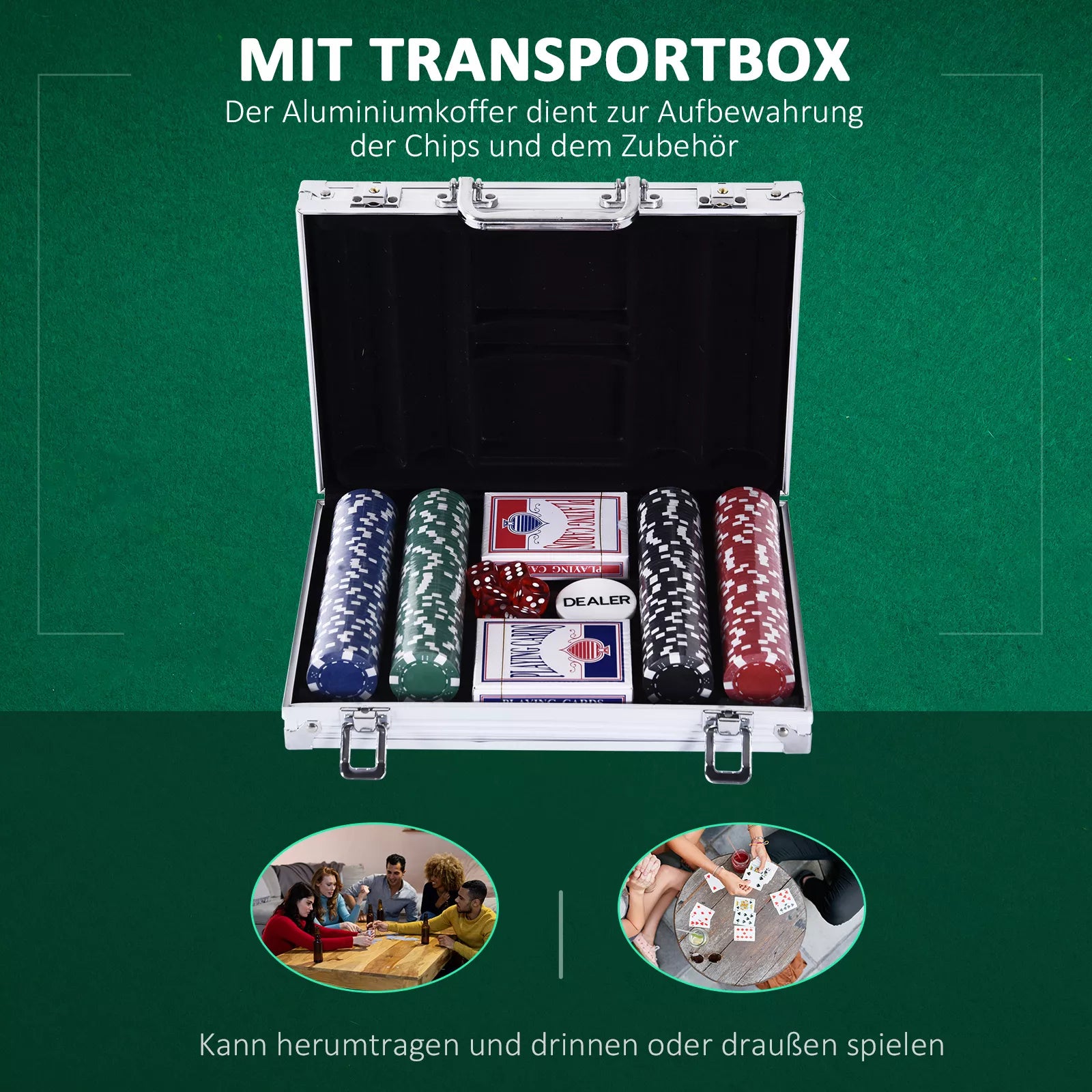 Šis pilnai paruoštas pokerio lagaminas suteikia viską, ko reikia įdomiam pokerio žaidimui: 200 pokerio žetonų su įvairių spalvų pasirinkimu, 5 pokerio kauliukus, 1 dalintojo žetoną ir 2 kortų kalades. Žaiskite Teksaso Hold'em, Blackjack, Ruletę ir daugybę kitų įdomių variantų. Tinkamas aliumininis lagaminas su skyreliais visam priedų komplektui turi du užraktus ir rankeną, todėl lengvai transportuojamas.
