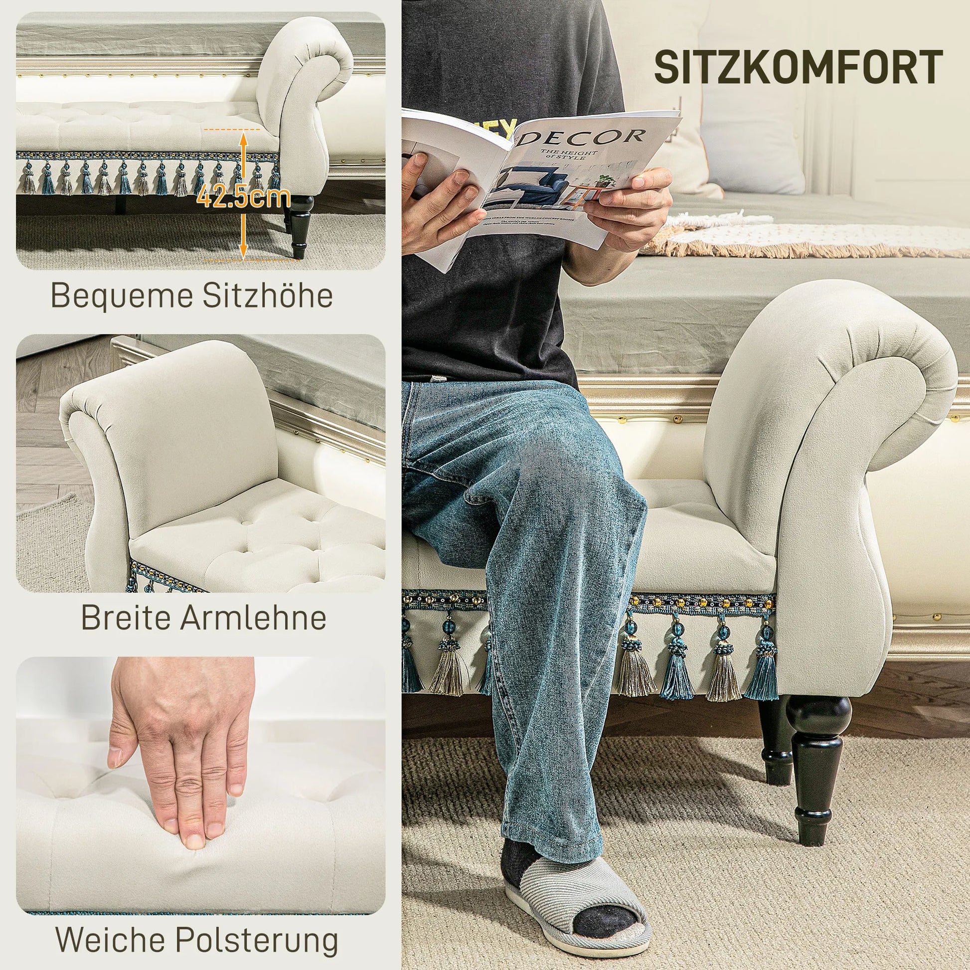 - ✔ Minkšta apmušalas ir patogūs atlošai ant miegamojo suolelio užtikrina išskirtinį sėdėjimo komfortą