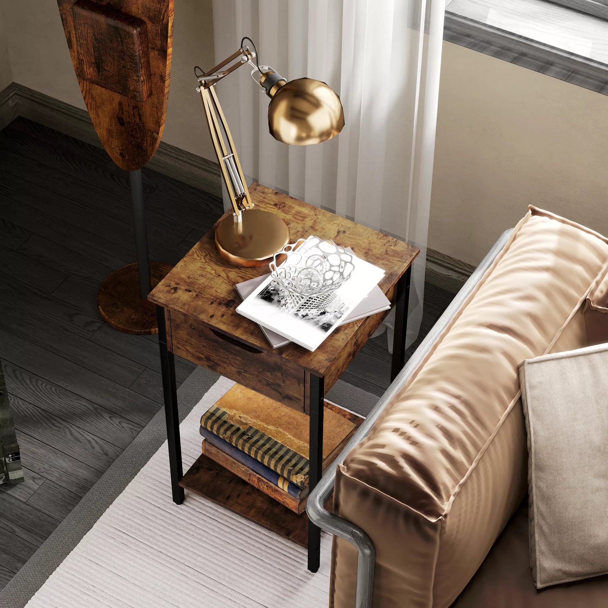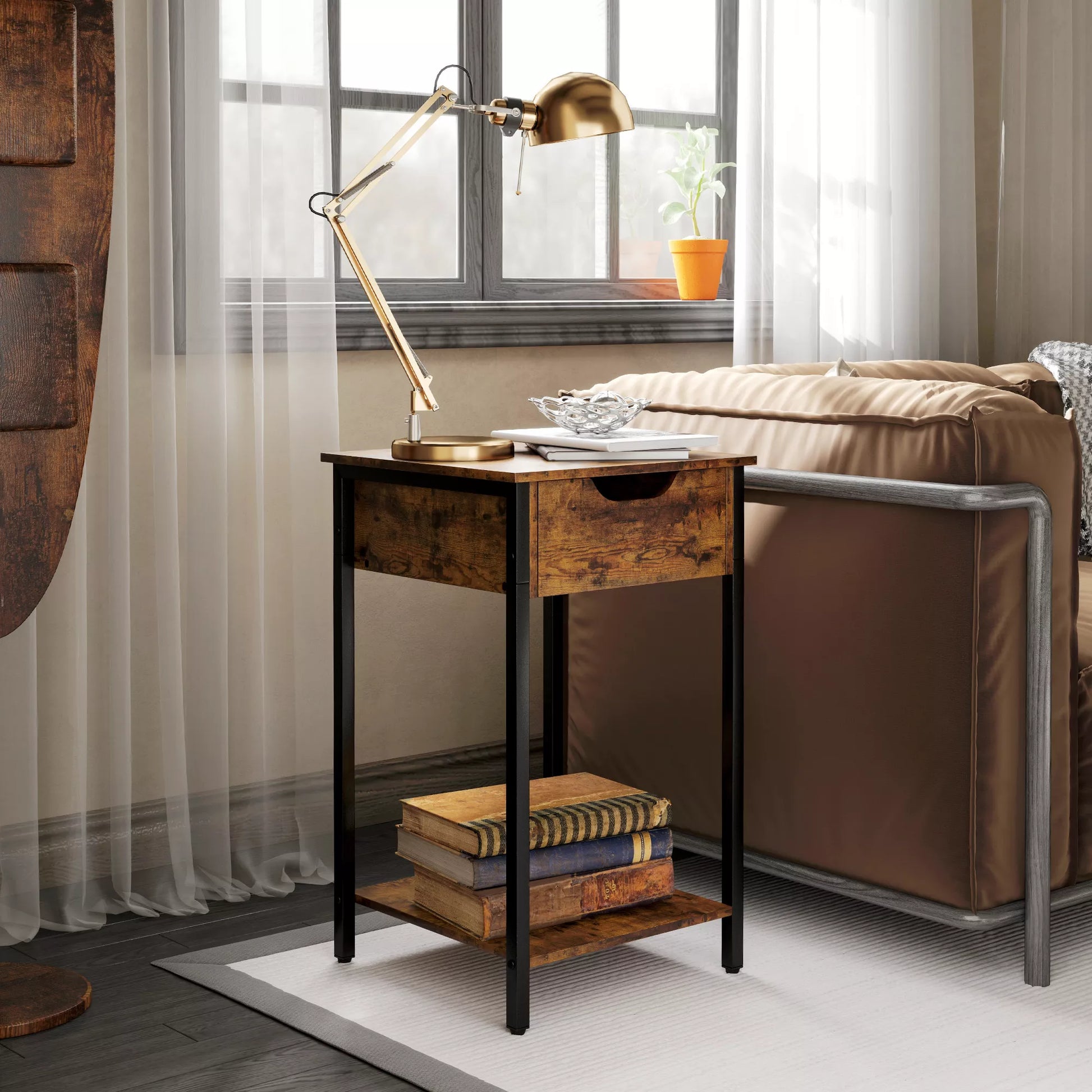 Patirkite industrinį naktinio staliuko žavesį – tai puikus kaimiškos rudos spalvos skydelių ir elegantiškų juodų vamzdelių derinys. Šis staliukas gali būti naudojamas kaip papildomas staliukas, naktinis staliukas ar augalų stovas, turi naudingą stalčių ir lentynėlę. Puikiai tiks pastatyti šalia sofos, fotelio ar lovos, o reguliuojamos kojelės užtikrina stabilumą ant bet kokio paviršiaus.