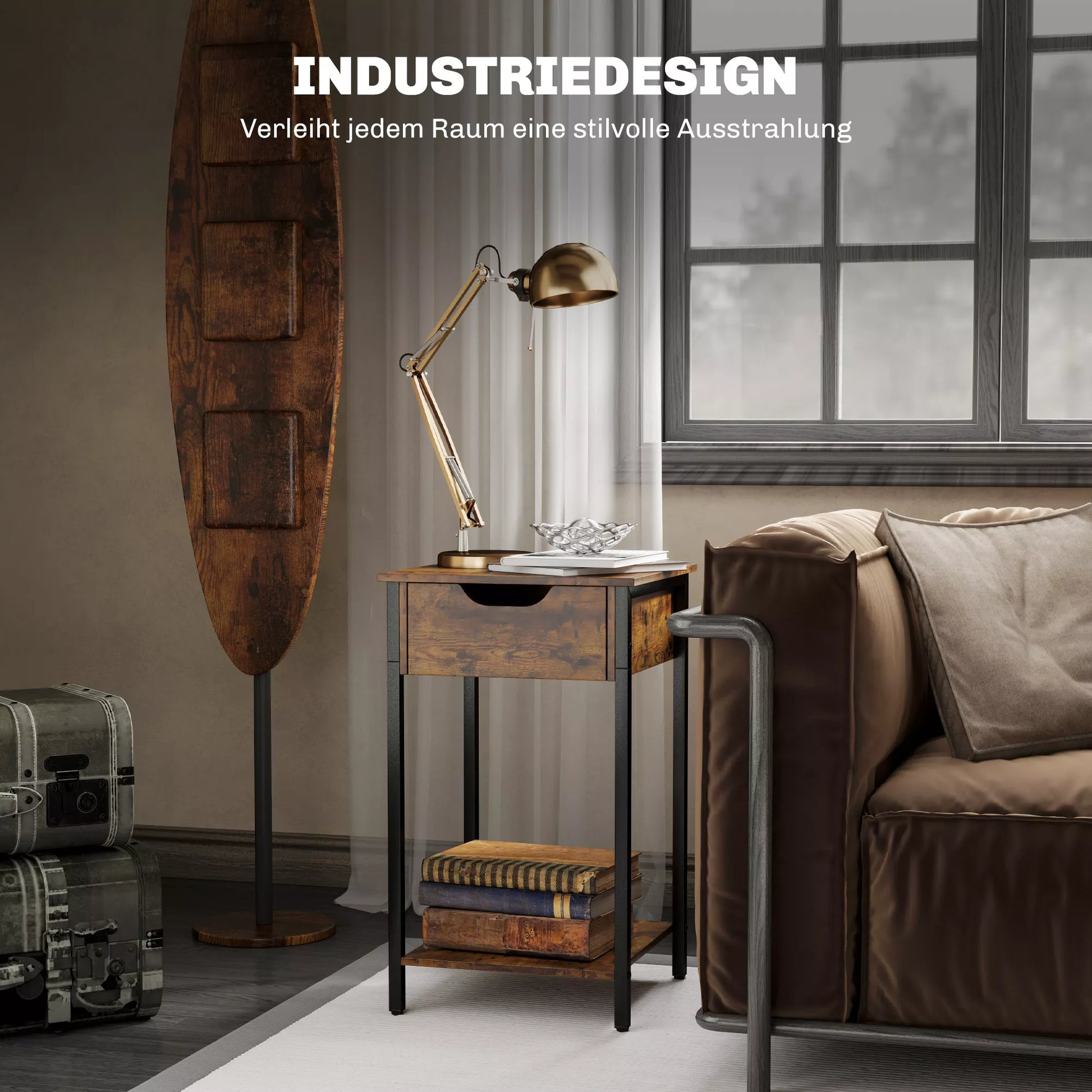 Pagalbinis staliukas pramoninio stiliaus, su stalčiumi, lentyna, metaliniu rėmu, mediena, 40 x 40 x 68 cm, rudas